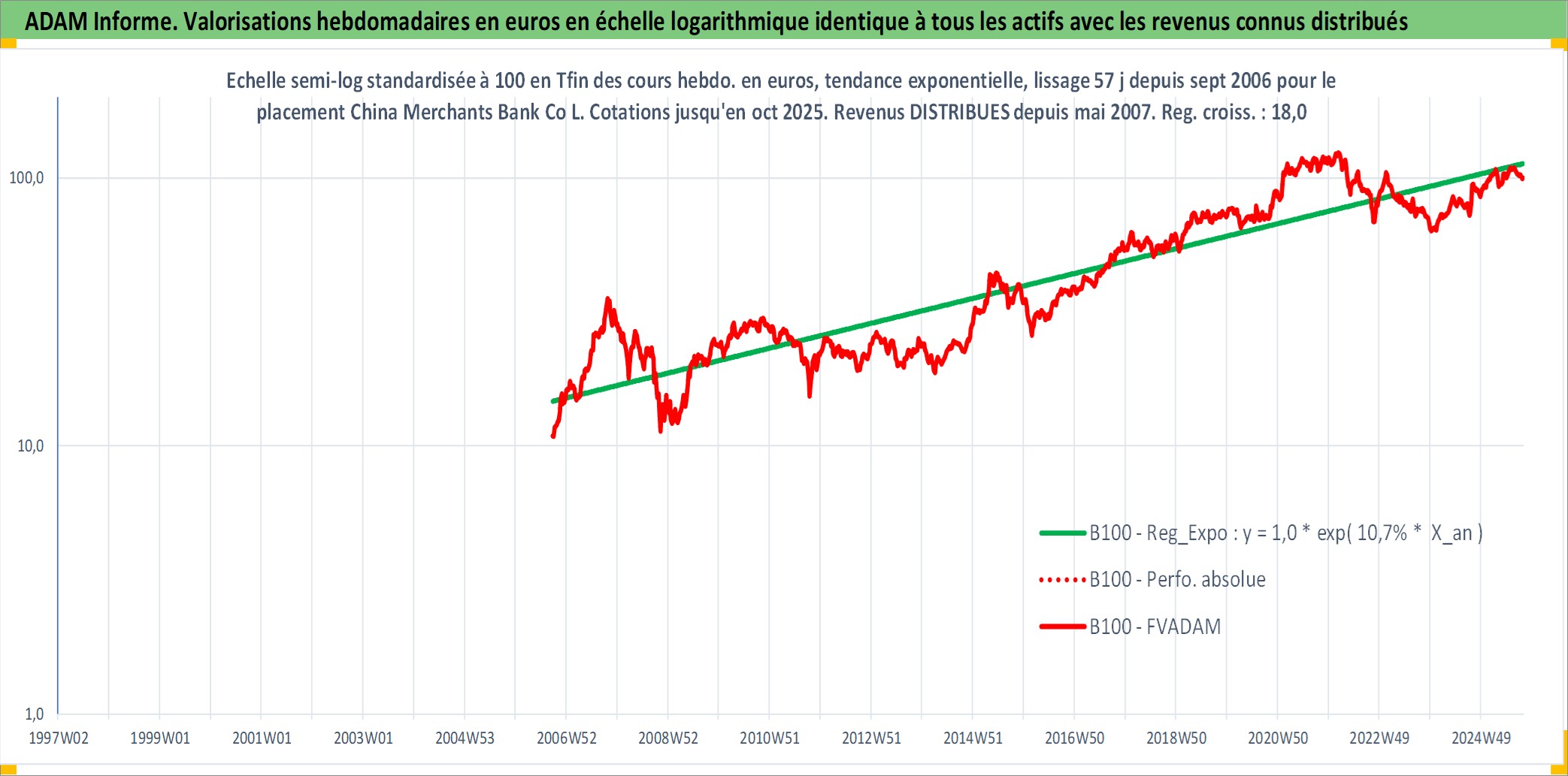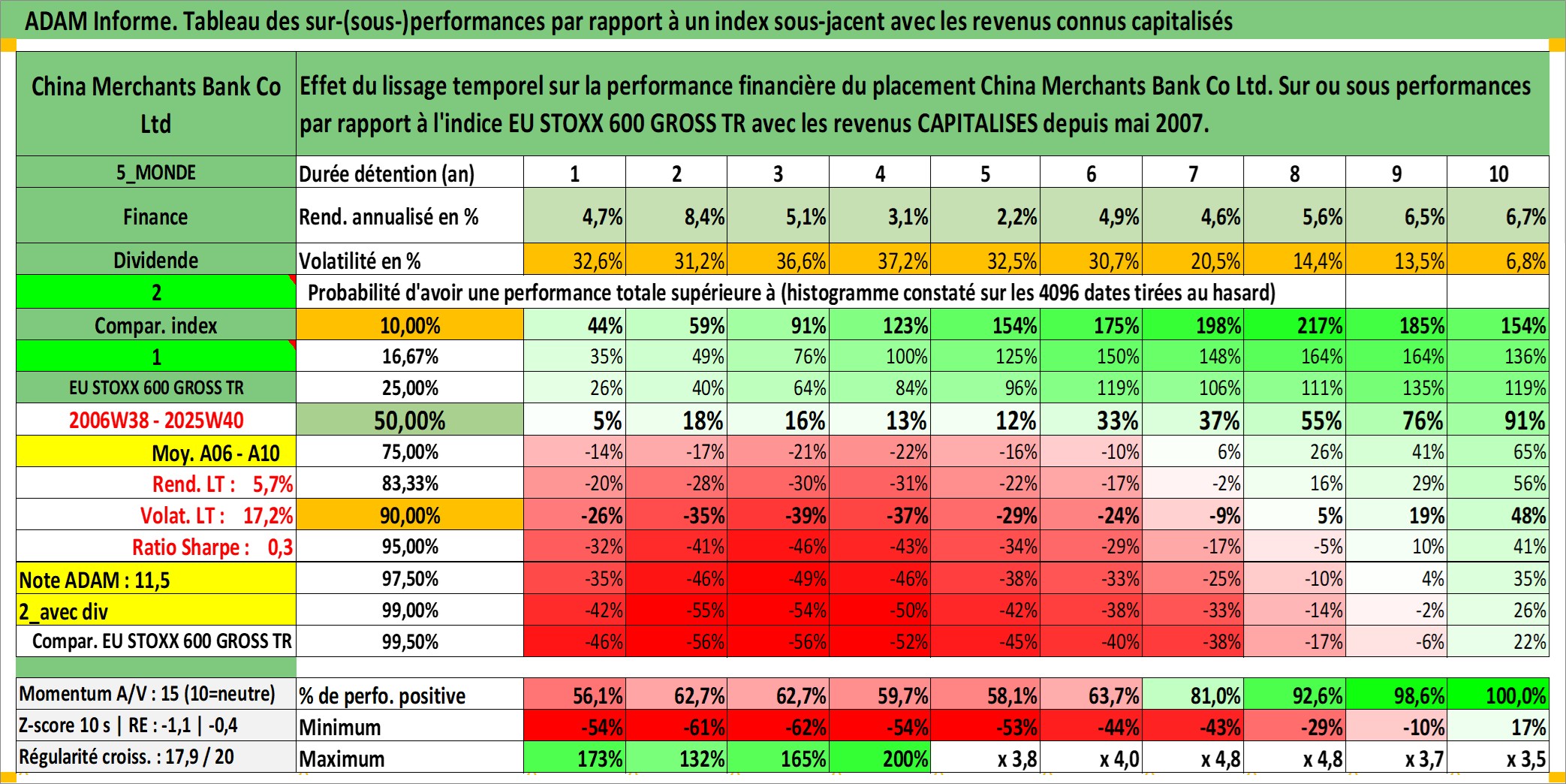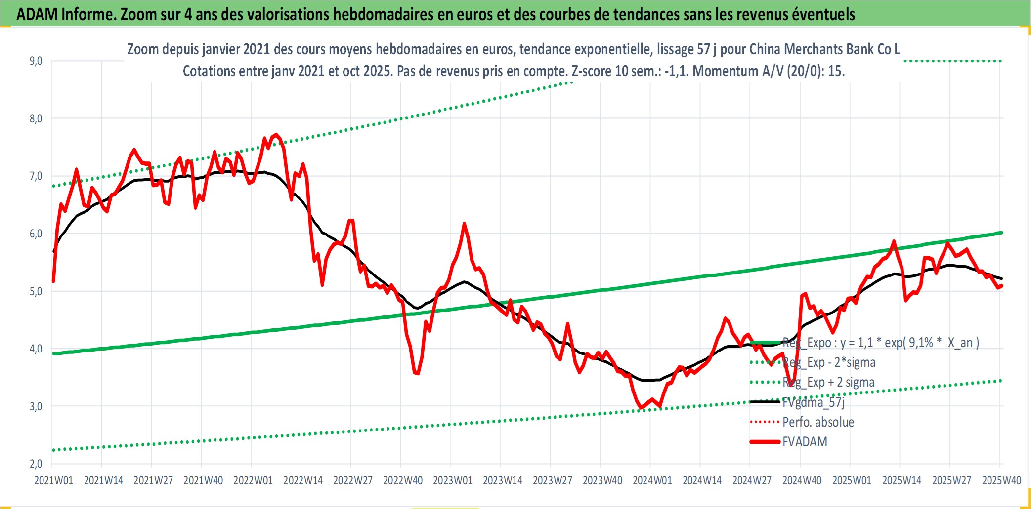 Site dédié aux investisseursPage dédiée sur site financeAnalyse des valorisations hebdomadaires de l'action China Merchants Bank Co Ltd. Cet actif est cote en HKD. Les valorisations sont en contrevaleur EURO et couvrent les semaines 2006W38 a 2025W40. Les revenus de cet actif financier sont pris en compte depuis la semaine 2007W20. La note globale ESG de cet actif est estimee a 4.0 (apres rebasage entre 0 et 20).