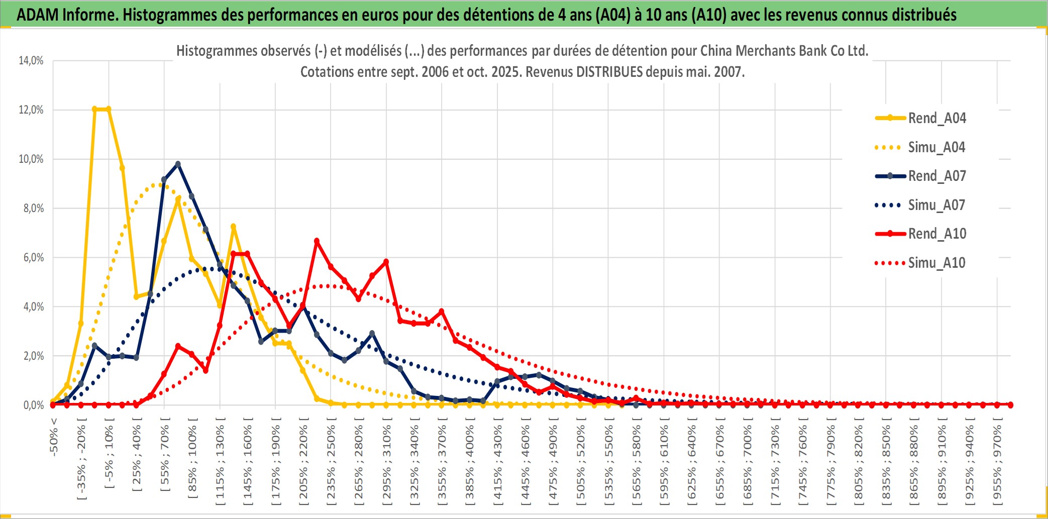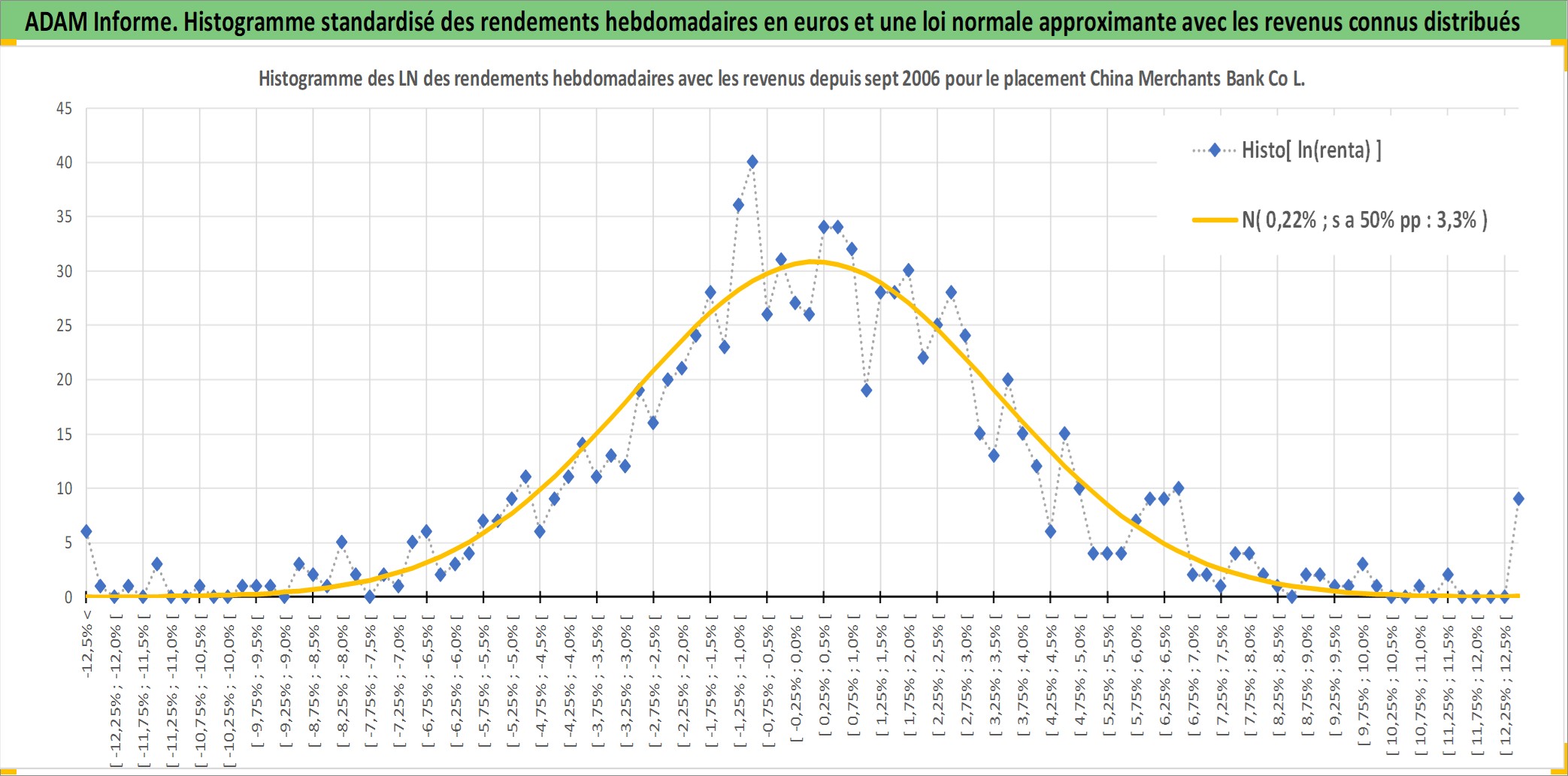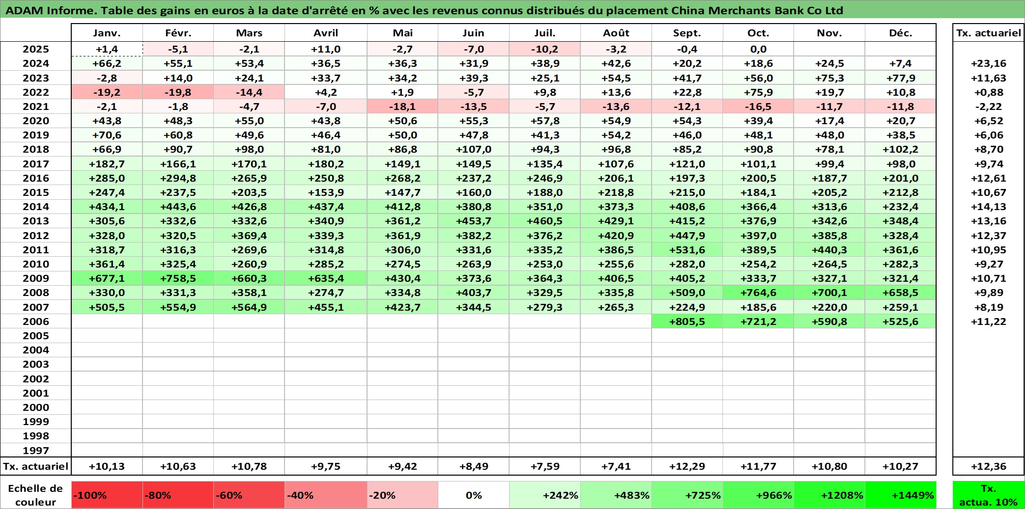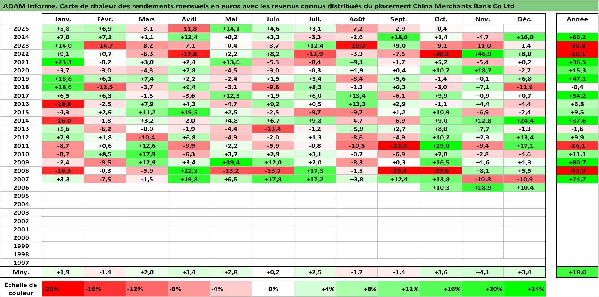 Site dédié aux investisseursPage dédiée sur site financeAnalyse des valorisations hebdomadaires de l'action China Merchants Bank Co Ltd. Cet actif est cote en HKD. Les valorisations sont en contrevaleur EURO et couvrent les semaines 2006W38 a 2025W40. Les revenus de cet actif financier sont pris en compte depuis la semaine 2007W20. La note globale ESG de cet actif est estimee a 4.0 (apres rebasage entre 0 et 20).