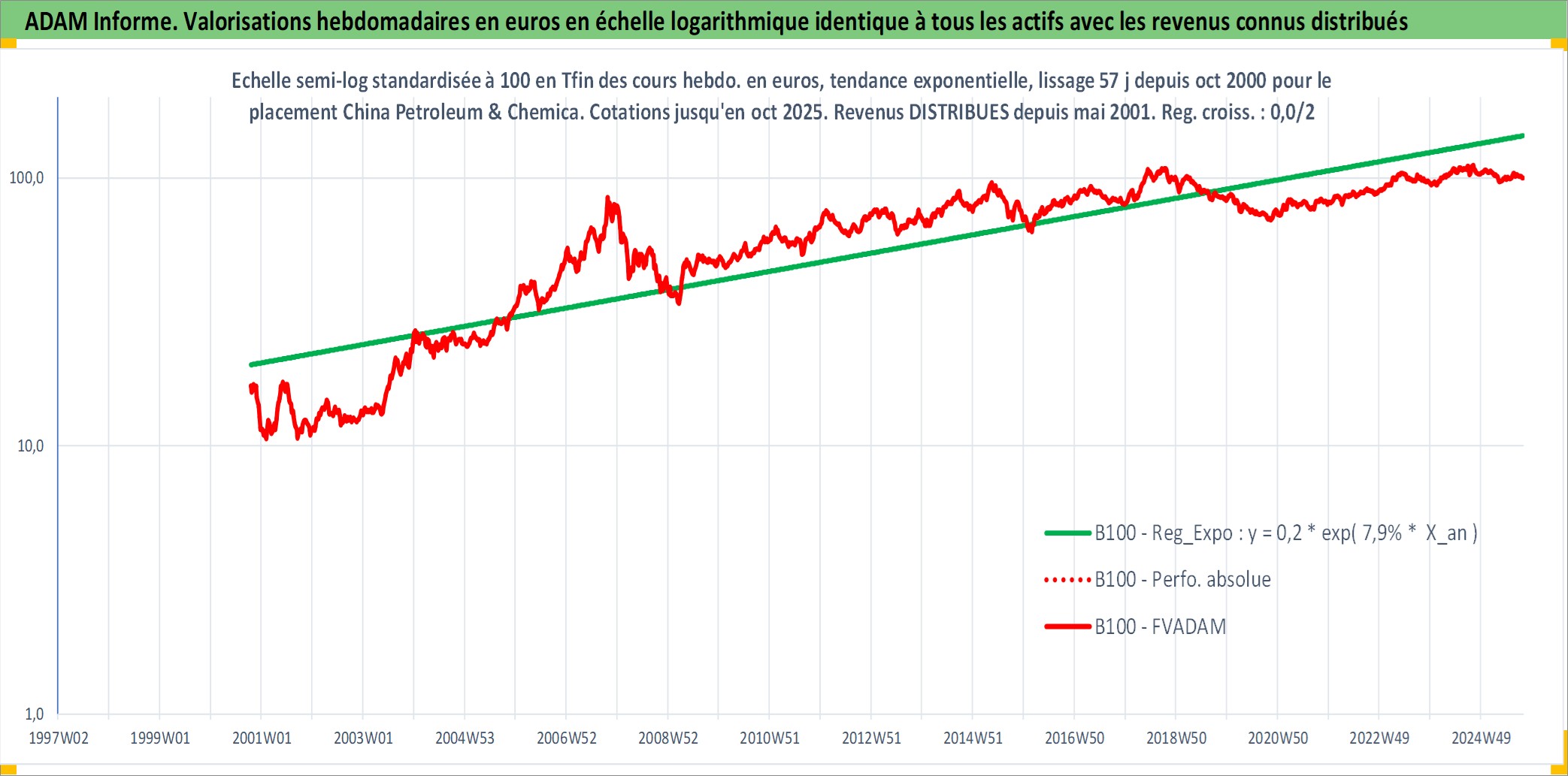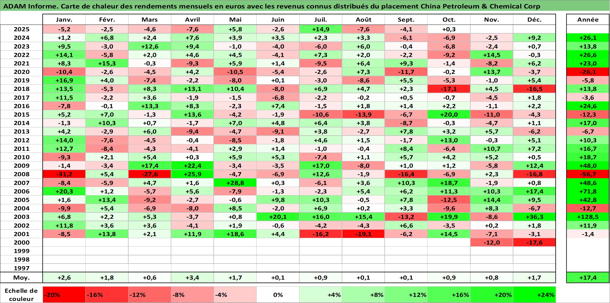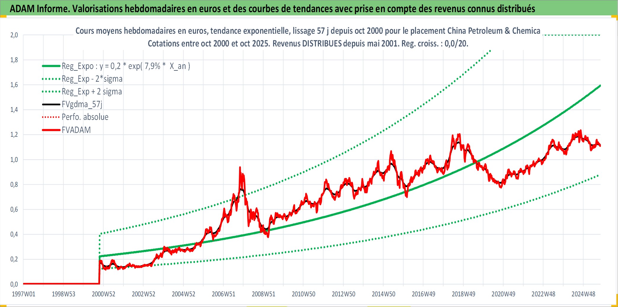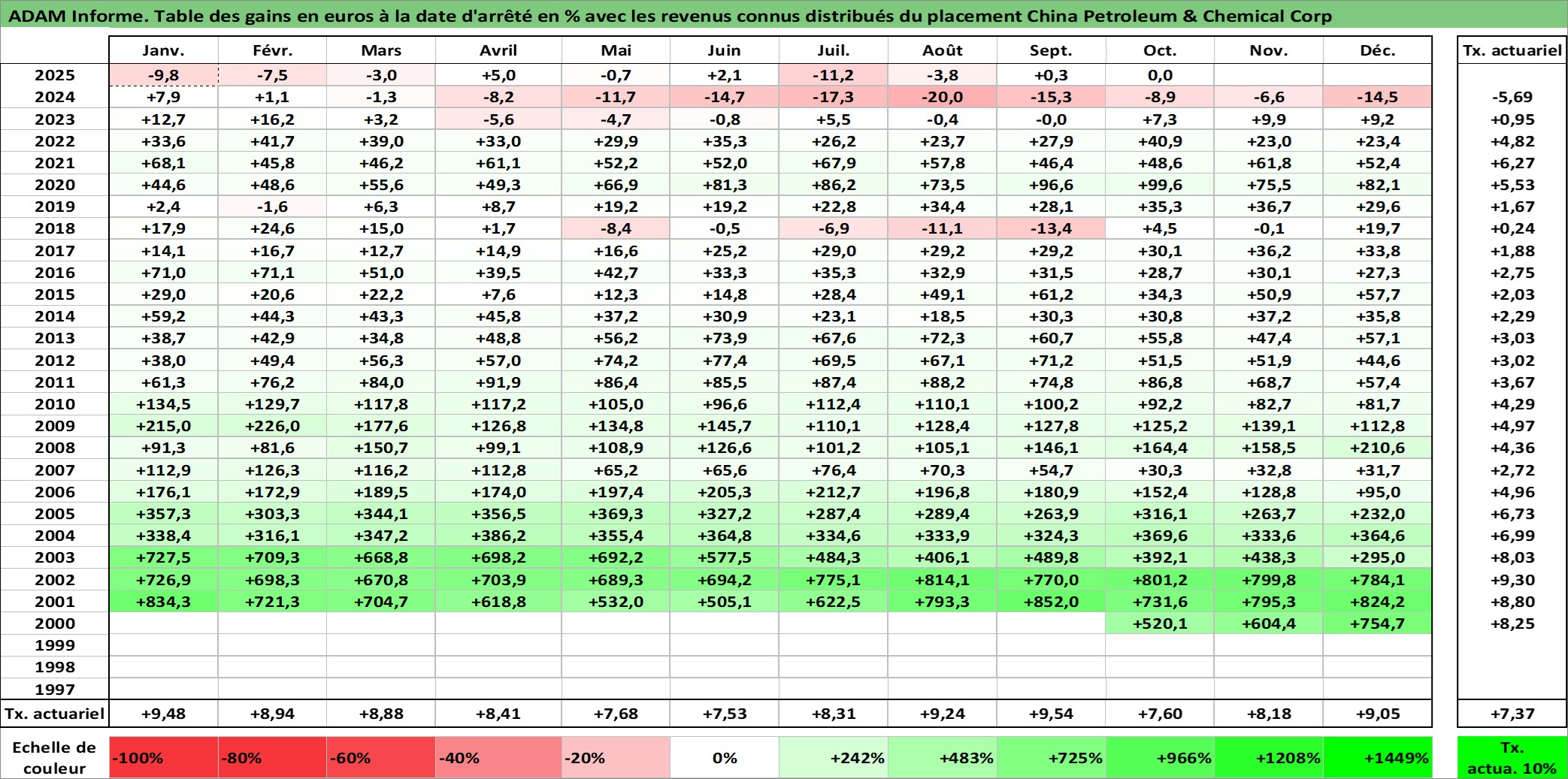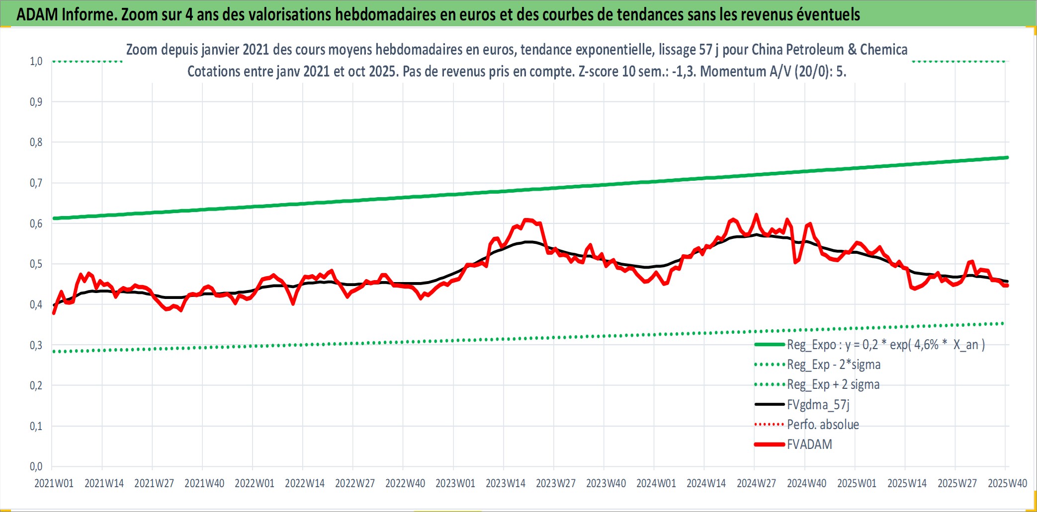 Site dédié aux investisseursPage dédiée sur site financeAnalyse des valorisations hebdomadaires de l'action China Petroleum & Chemical Corp. Cet actif est cote en HKD. Les valorisations sont en contrevaleur EURO et couvrent les semaines 2000W42 a 2025W40. Les revenus de cet actif financier sont pris en compte depuis la semaine 2001W18. La note ESG de cet actif n'est pas connue.