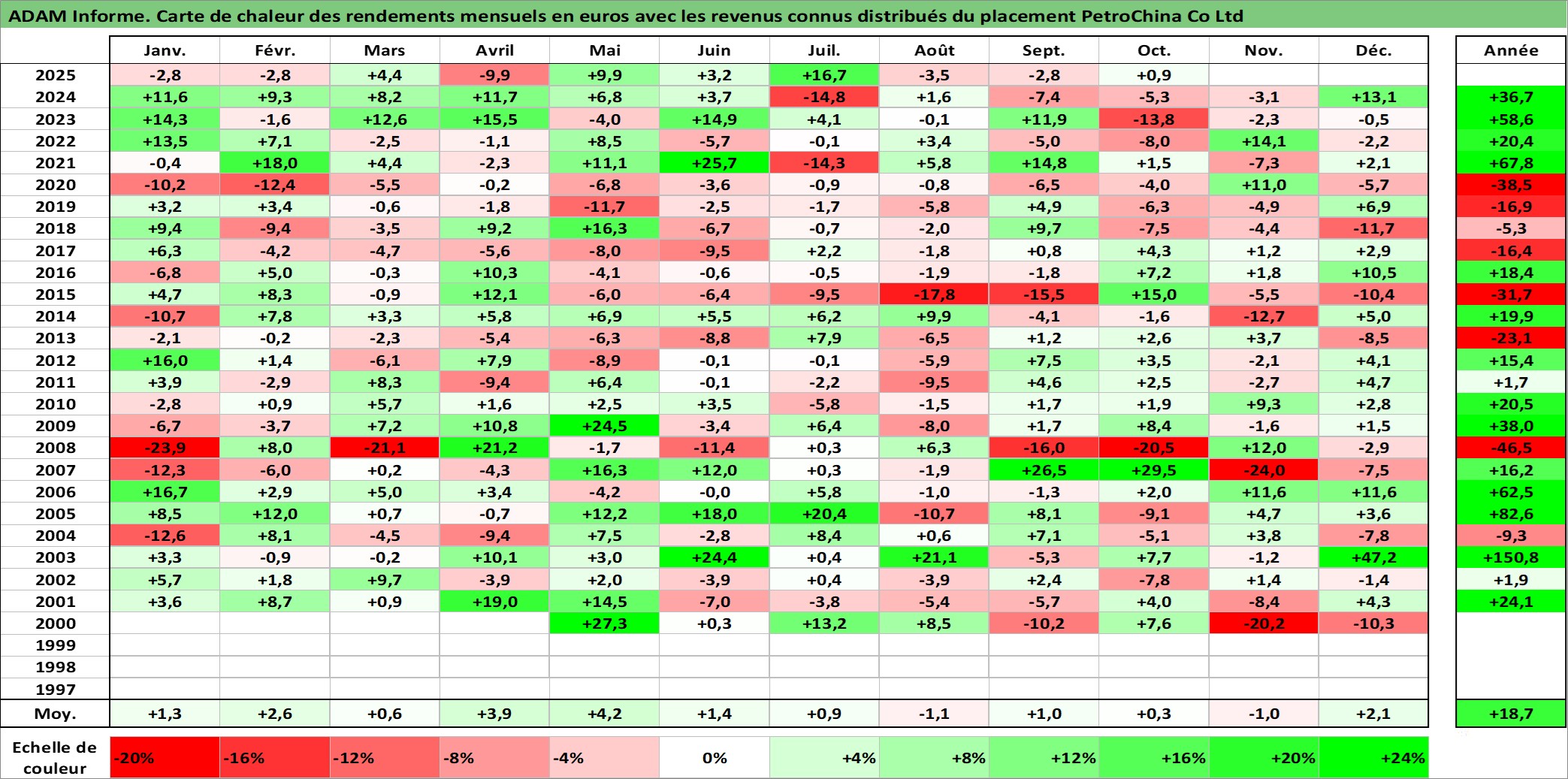 Site dédié aux investisseursPage dédiée sur site financeAnalyse des valorisations hebdomadaires de l'action PetroChina Co Ltd. Cet actif est cote en HKD. Les valorisations sont en contrevaleur EURO et couvrent les semaines 2000W14 a 2025W40. Les revenus de cet actif financier sont pris en compte depuis la semaine 2000W37. La note ESG de cet actif n'est pas connue.