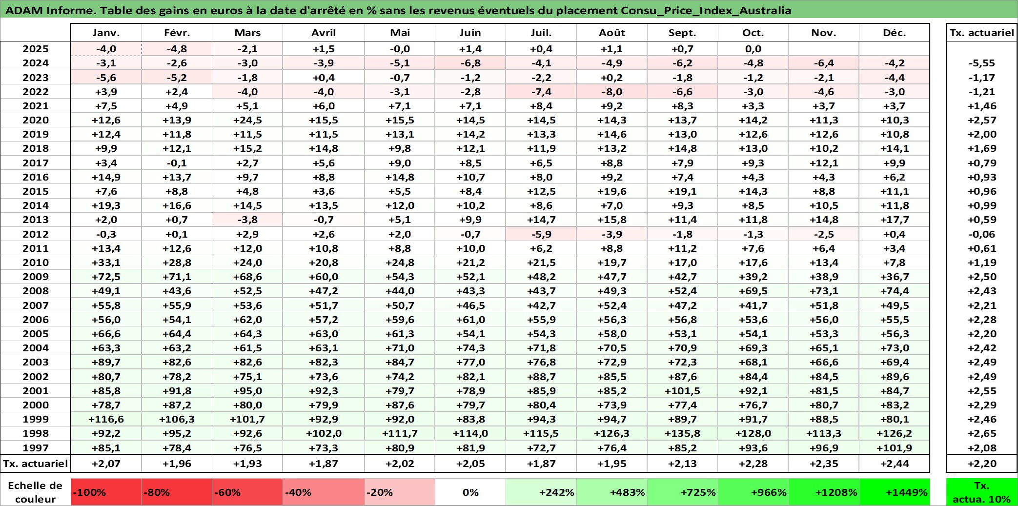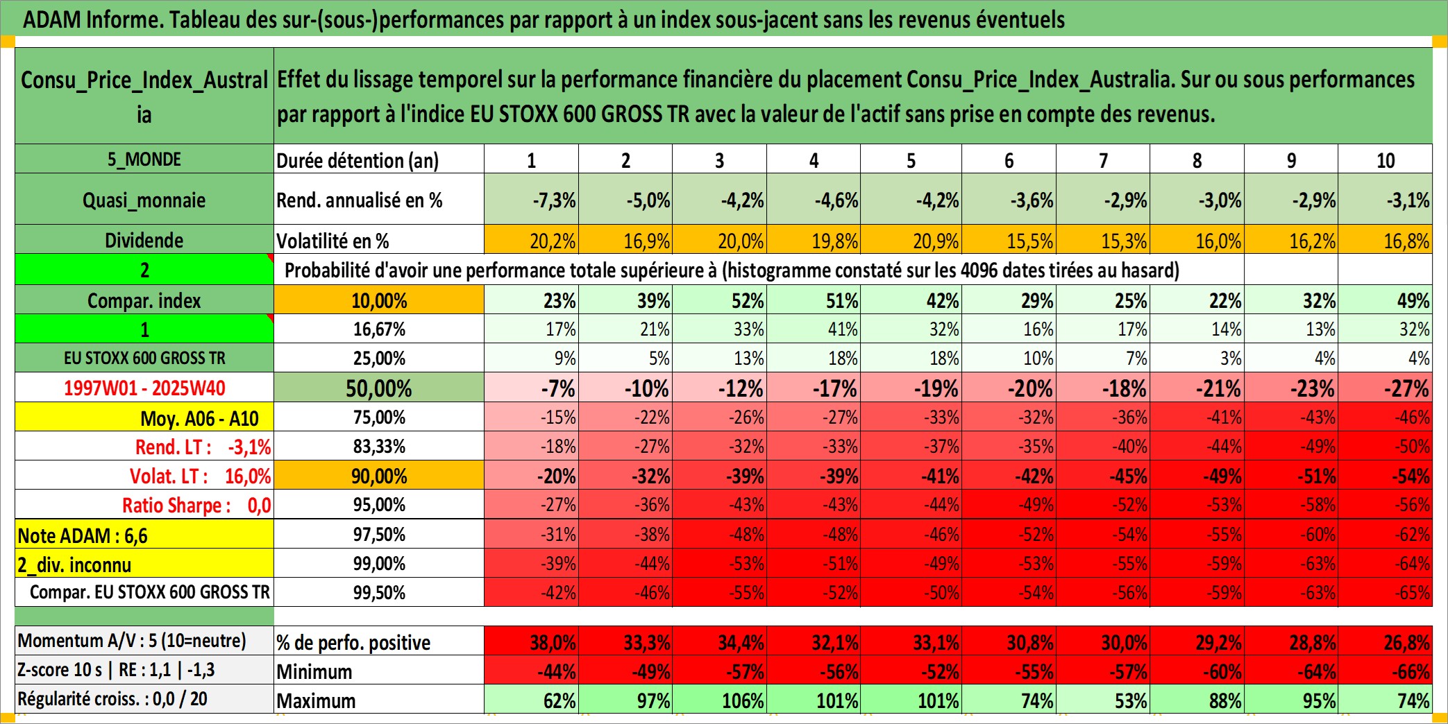 Site dédié aux investisseursPage dédiée sur site financeAnalyse des valorisations hebdomadaires de l'action Consu_Price_Index_Australia. Cet actif est cote en AUD. Les valorisations sont en contrevaleur EURO et couvrent les semaines 1997W01 a 2025W40. Les revenus de cet actif financier ne sont pas connus car non existants ou non disponibles sur le site Yahoo Finance. La note ESG de cet actif n'est pas connue.