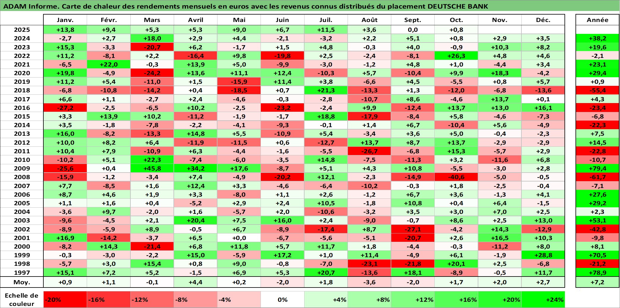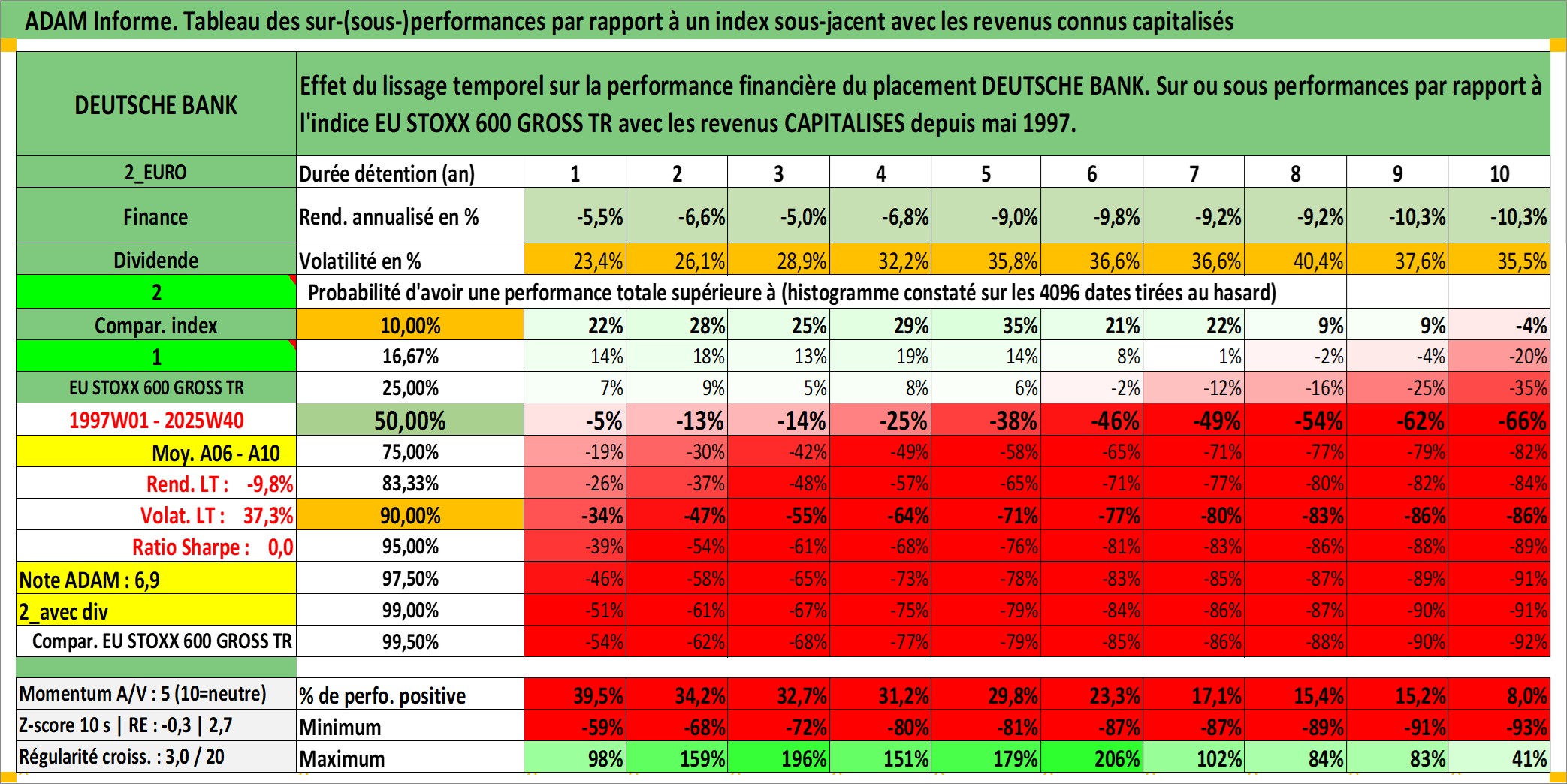 Site dédié aux investisseursPage dédiée sur site financeAnalyse des valorisations hebdomadaires de l'action DEUTSCHE BANK. Cet actif est cote en EUR. Les valorisations couvrent les semaines 1997W01 a 2025W40. Les revenus de cet actif financier sont pris en compte depuis la semaine 1997W21. La note globale ESG de cet actif est estimee a 6.0 (apres rebasage entre 0 et 20).