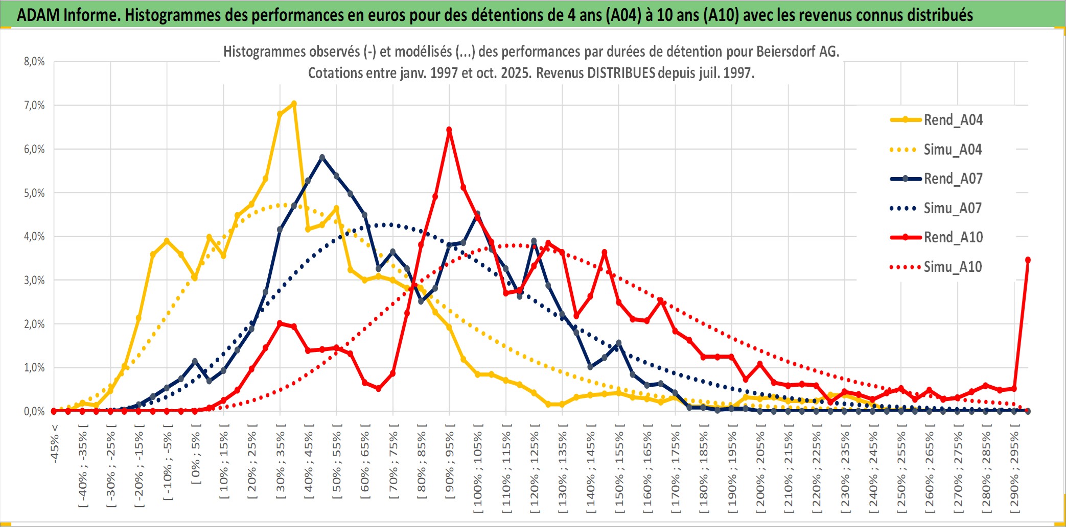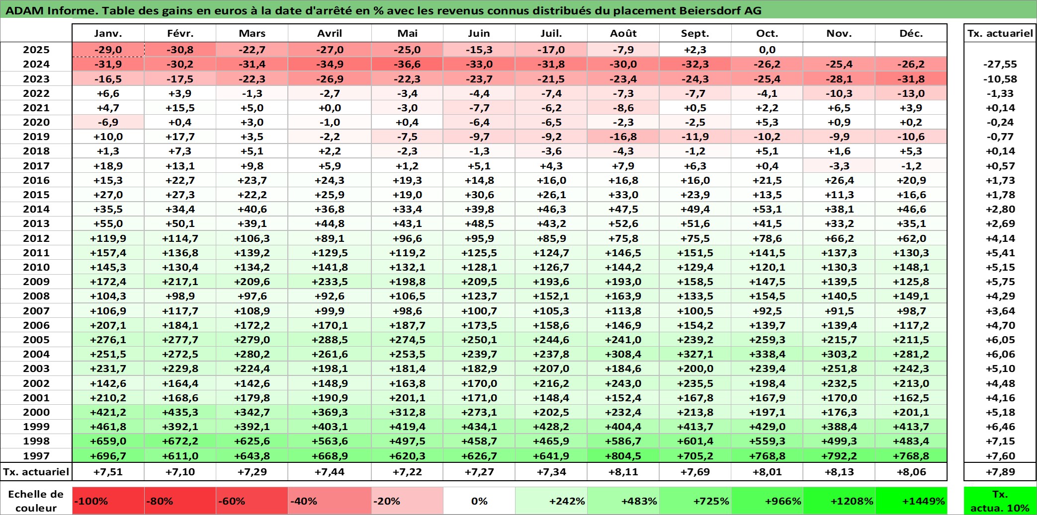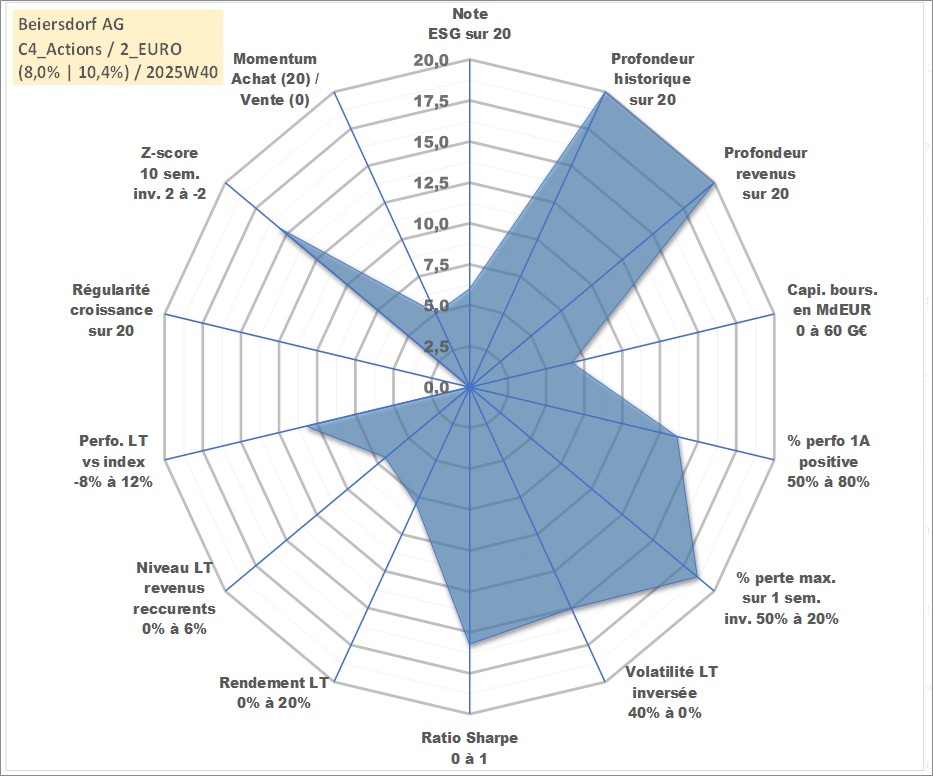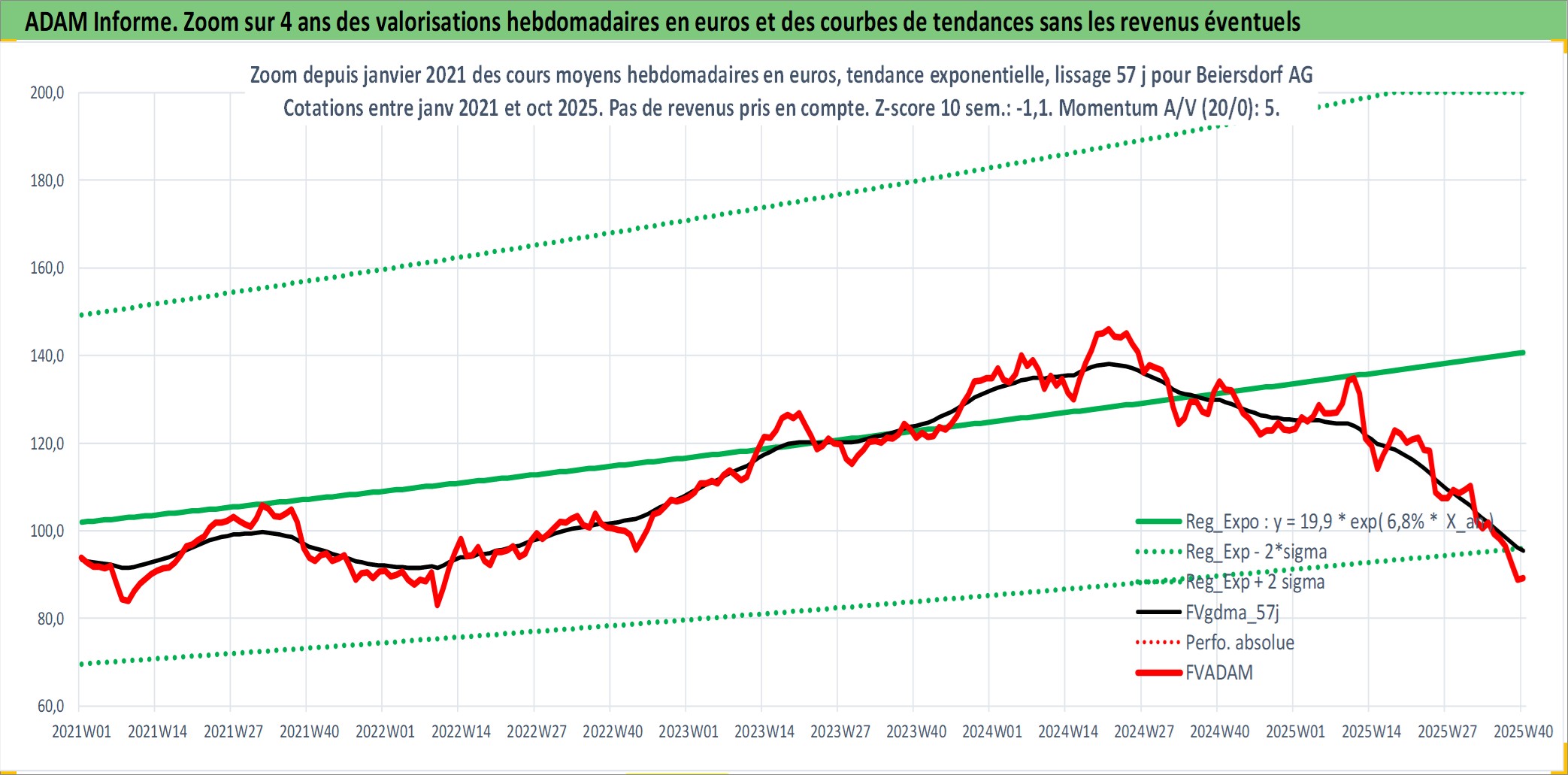 Site dédié aux investisseursPage dédiée sur site financeAnalyse des valorisations hebdomadaires de l'action Beiersdorf AG. Cet actif est cote en EUR. Les valorisations couvrent les semaines 1997W01 a 2025W40. Les revenus de cet actif financier sont pris en compte depuis la semaine 1997W27. La note globale ESG de cet actif est estimee a 6.0 (apres rebasage entre 0 et 20).