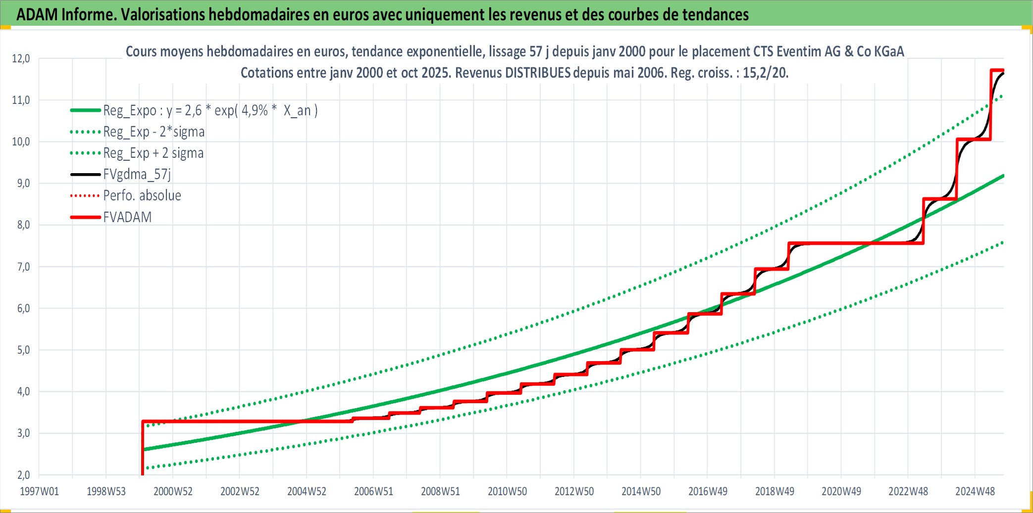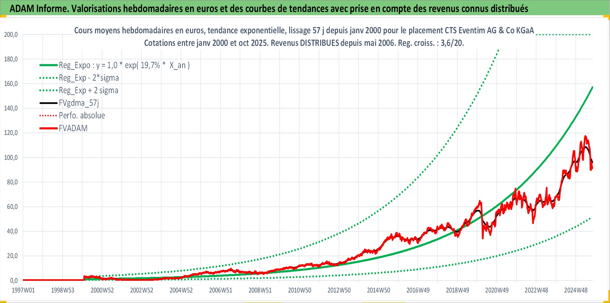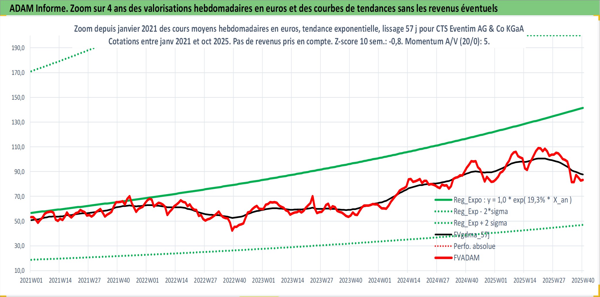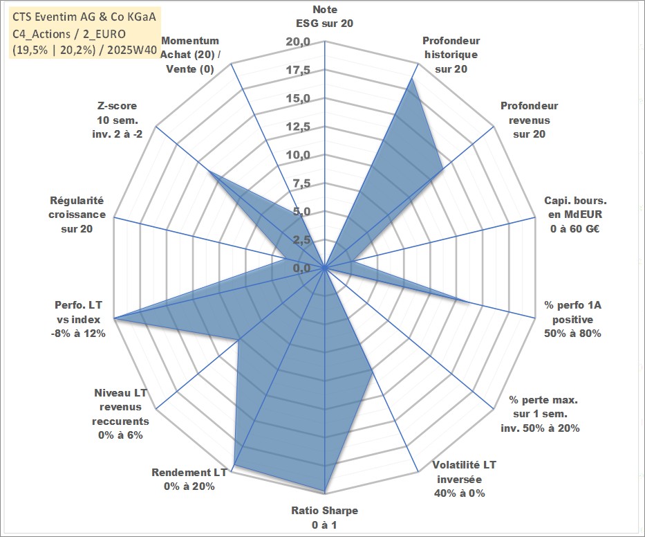 Site dédié aux investisseursPage dédiée sur site financeAnalyse des valorisations hebdomadaires de l'action CTS Eventim AG & Co KGaA. Cet actif est cote en EUR. Les valorisations couvrent les semaines 2000W05 a 2025W40. Les revenus de cet actif financier sont pris en compte depuis la semaine 2006W19. La note ESG de cet actif n'est pas connue.