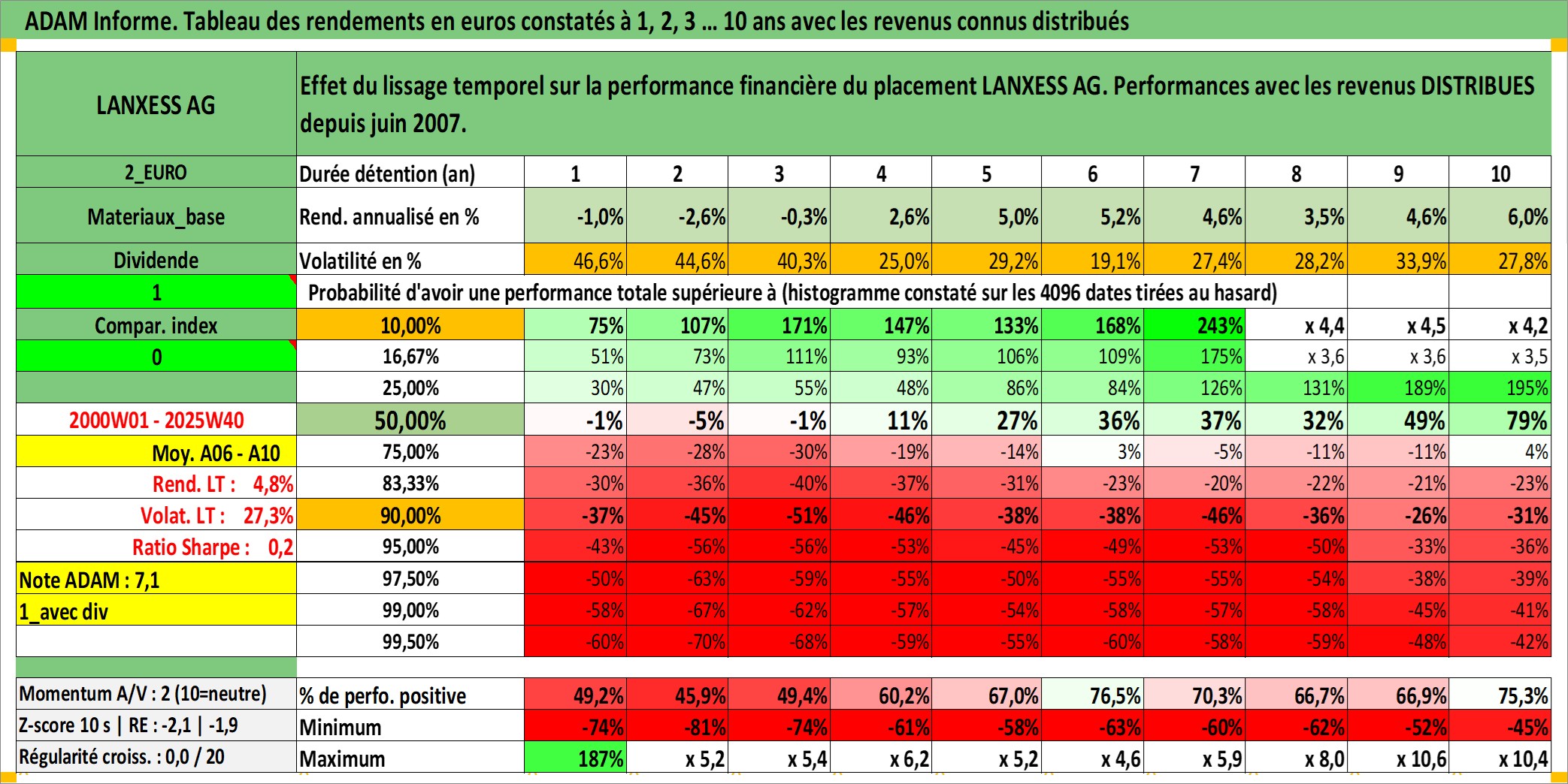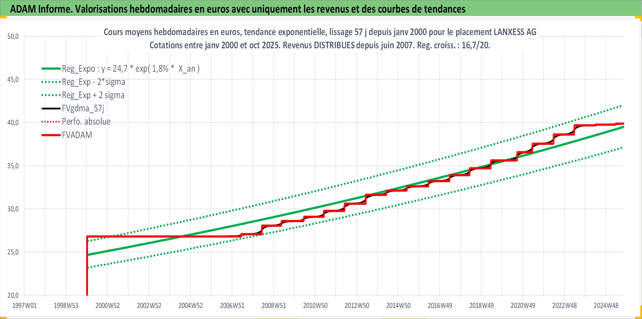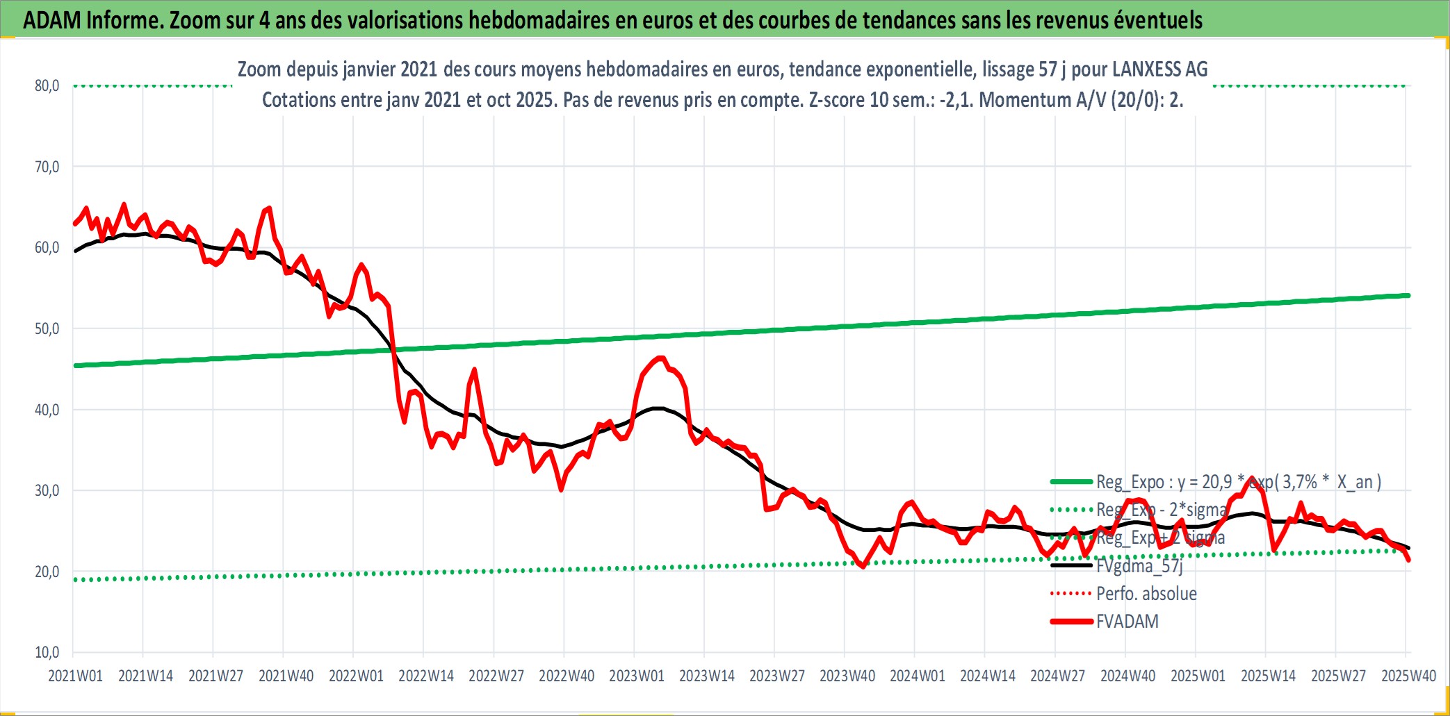 Site dédié aux investisseursPage dédiée sur site financeAnalyse des valorisations hebdomadaires de l'action LANXESS AG. Cet actif est cote en EUR. Les valorisations couvrent les semaines 2000W01 a 2025W40. Les revenus de cet actif financier sont pris en compte depuis la semaine 2007W22. La note globale ESG de cet actif est estimee a 7.0 (apres rebasage entre 0 et 20).