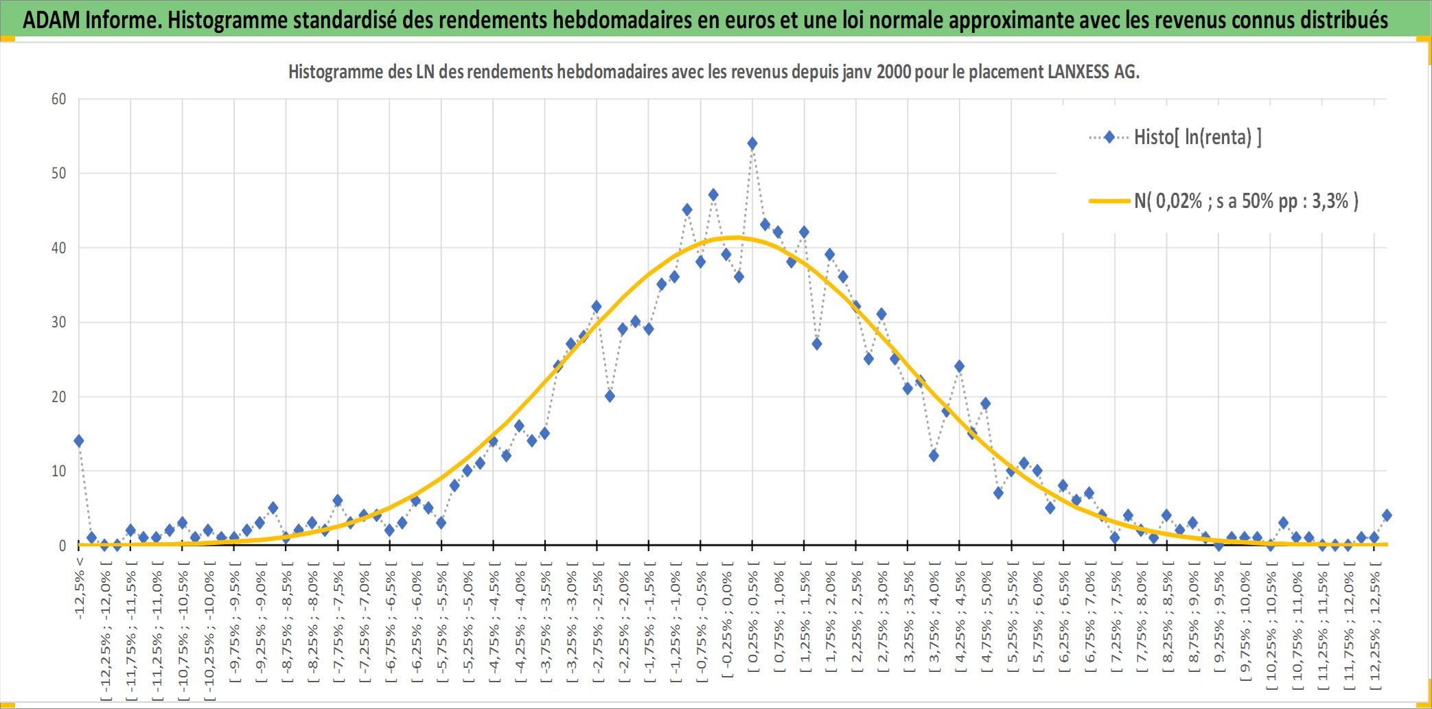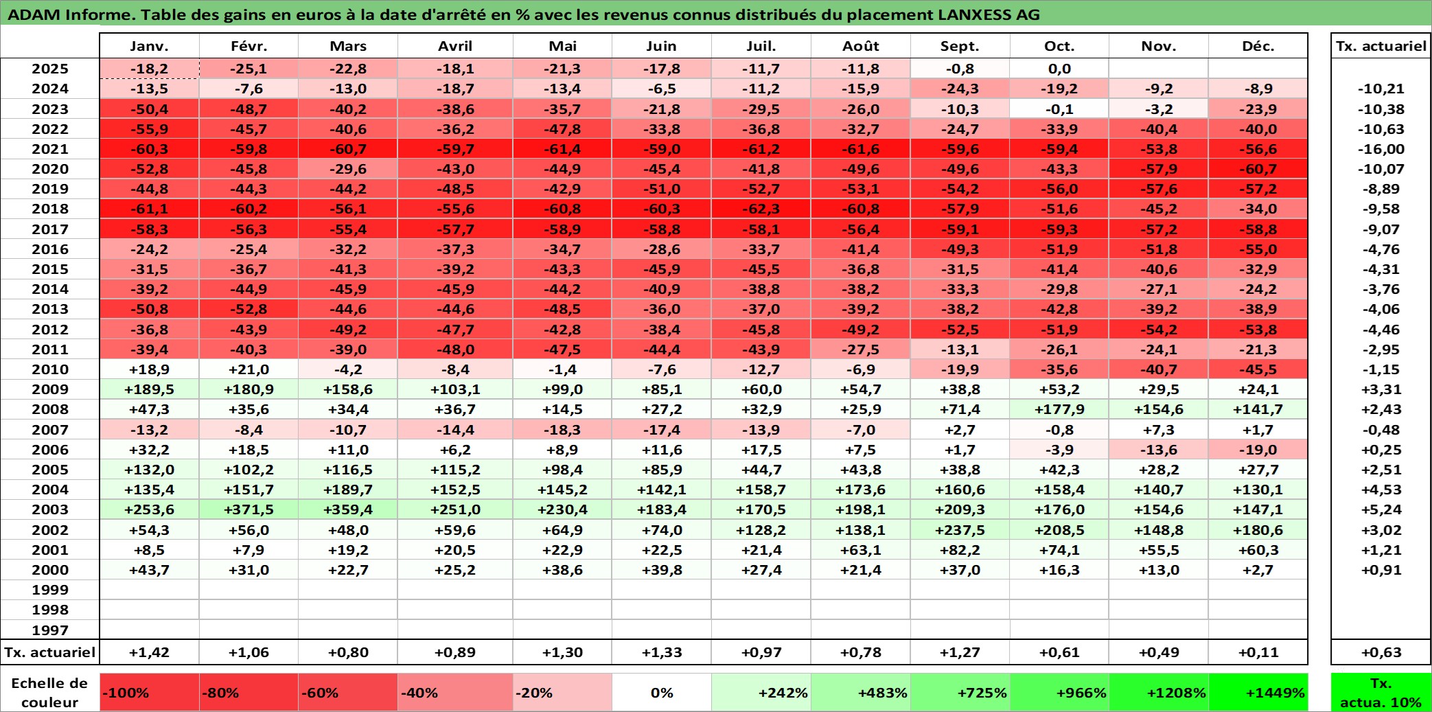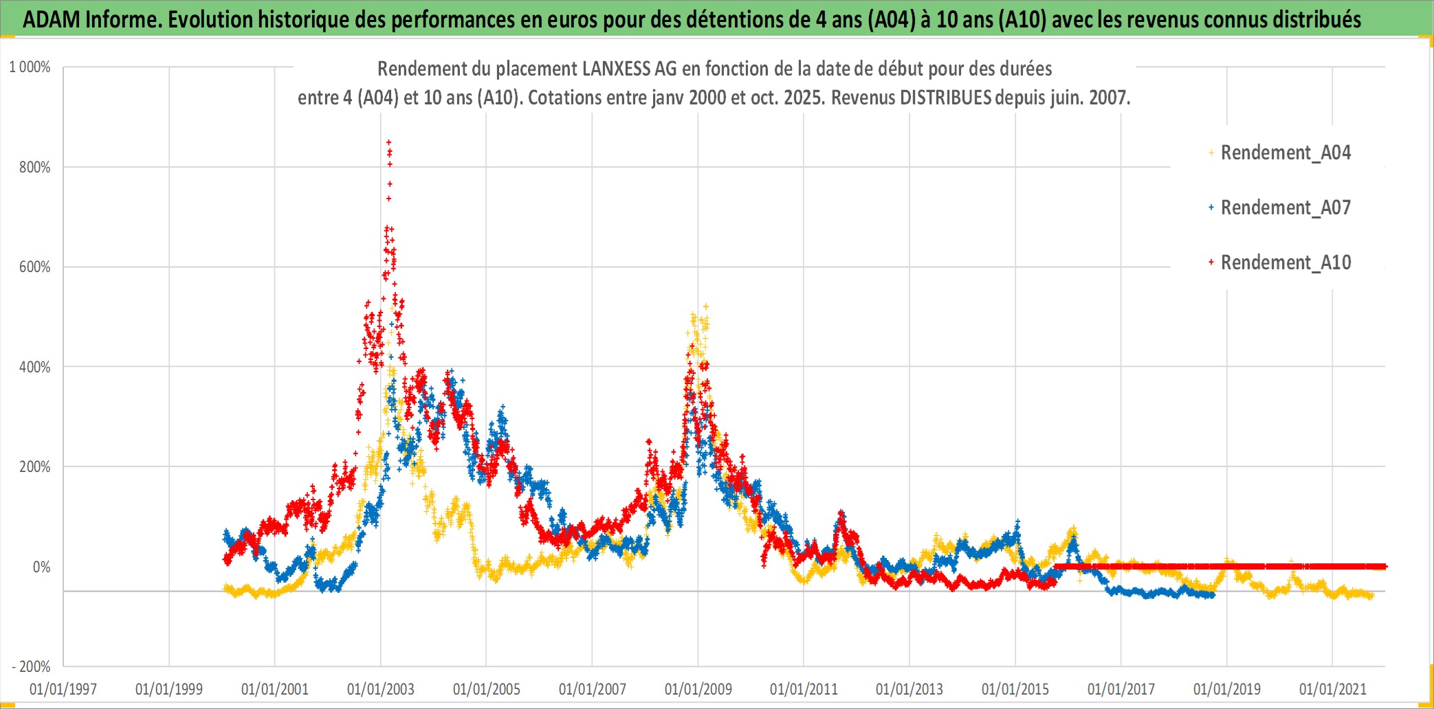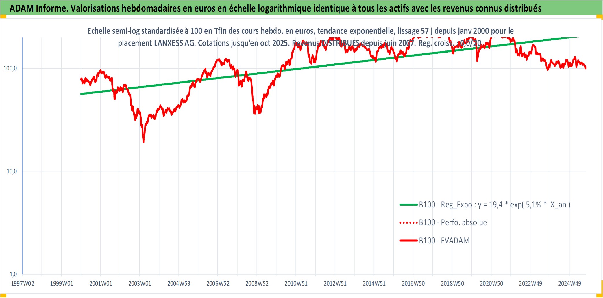 Site dédié aux investisseursPage dédiée sur site financeAnalyse des valorisations hebdomadaires de l'action LANXESS AG. Cet actif est cote en EUR. Les valorisations couvrent les semaines 2000W01 a 2025W40. Les revenus de cet actif financier sont pris en compte depuis la semaine 2007W22. La note globale ESG de cet actif est estimee a 7.0 (apres rebasage entre 0 et 20).