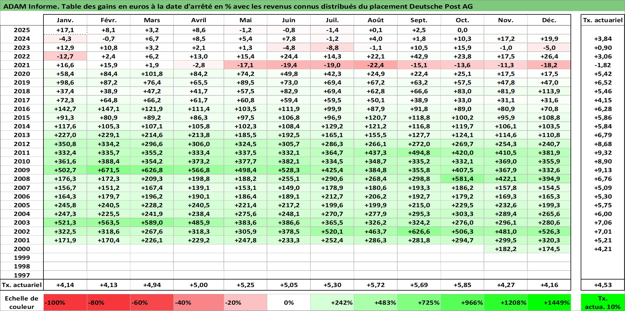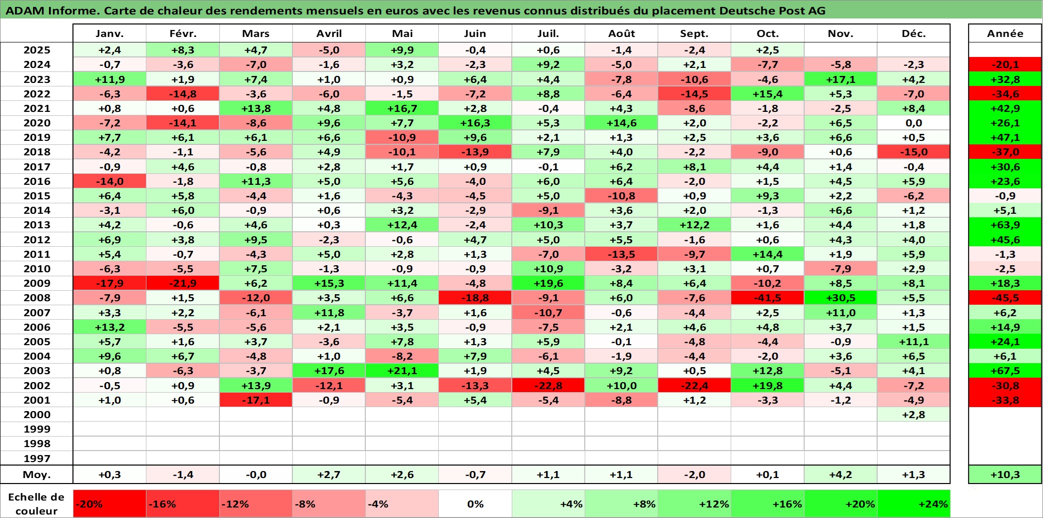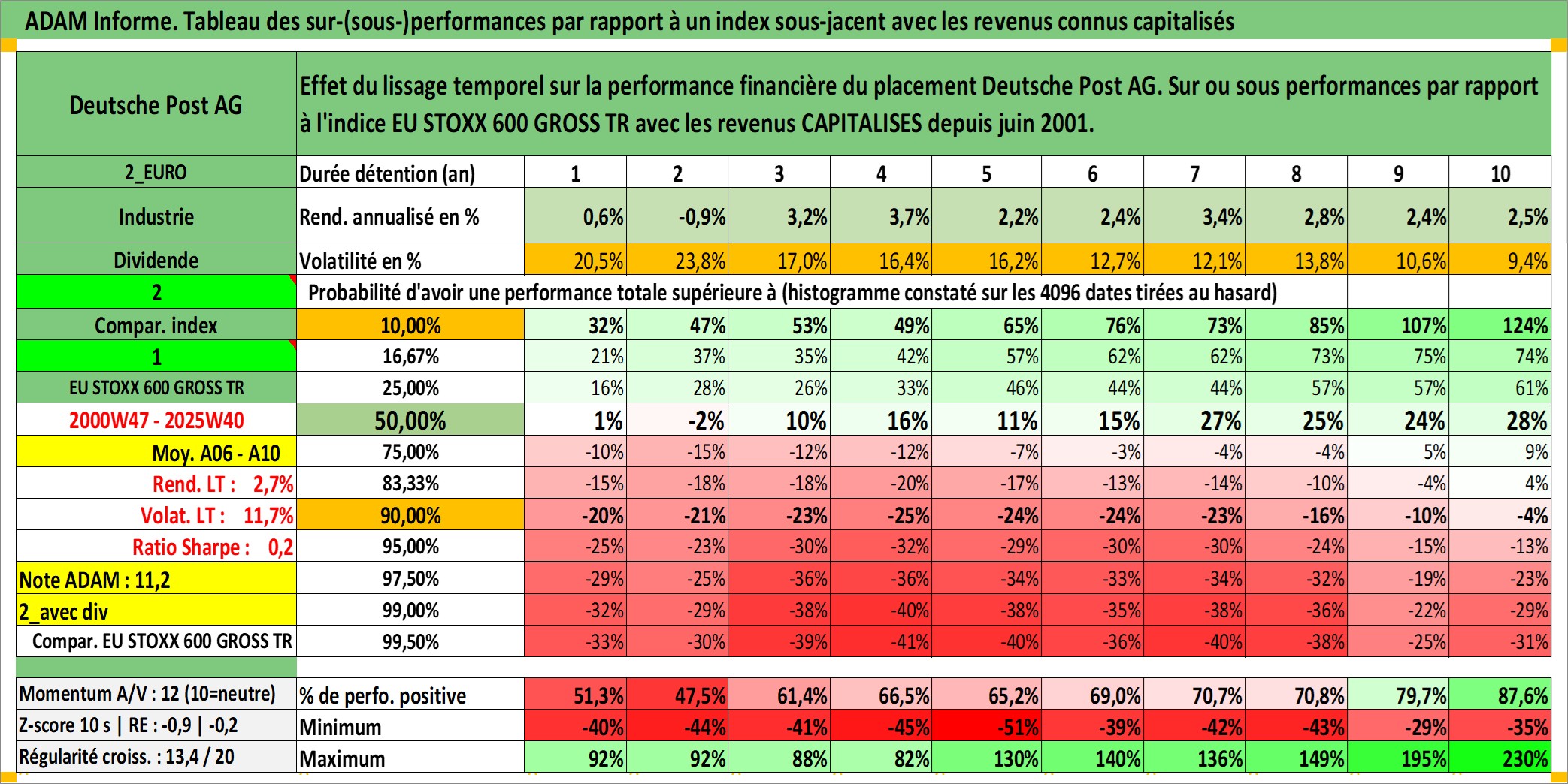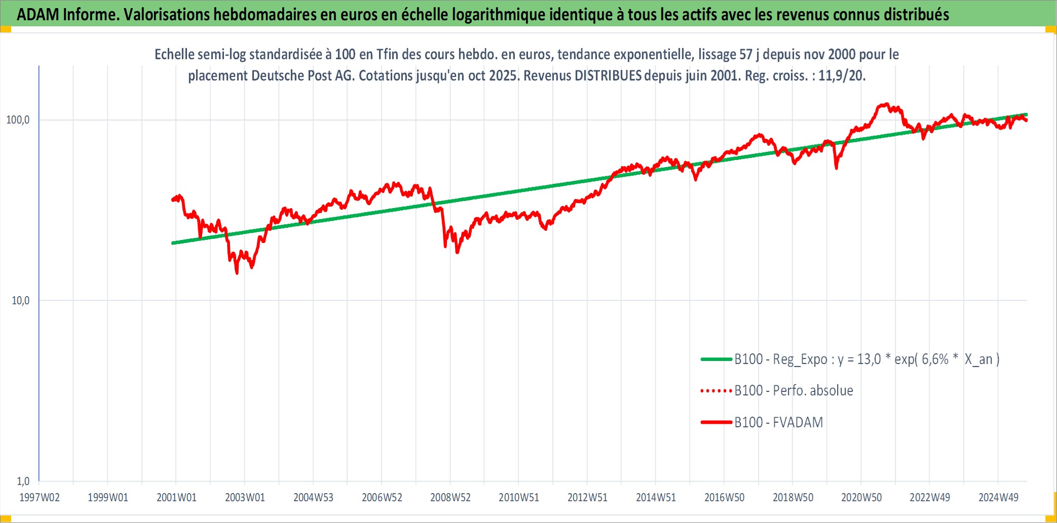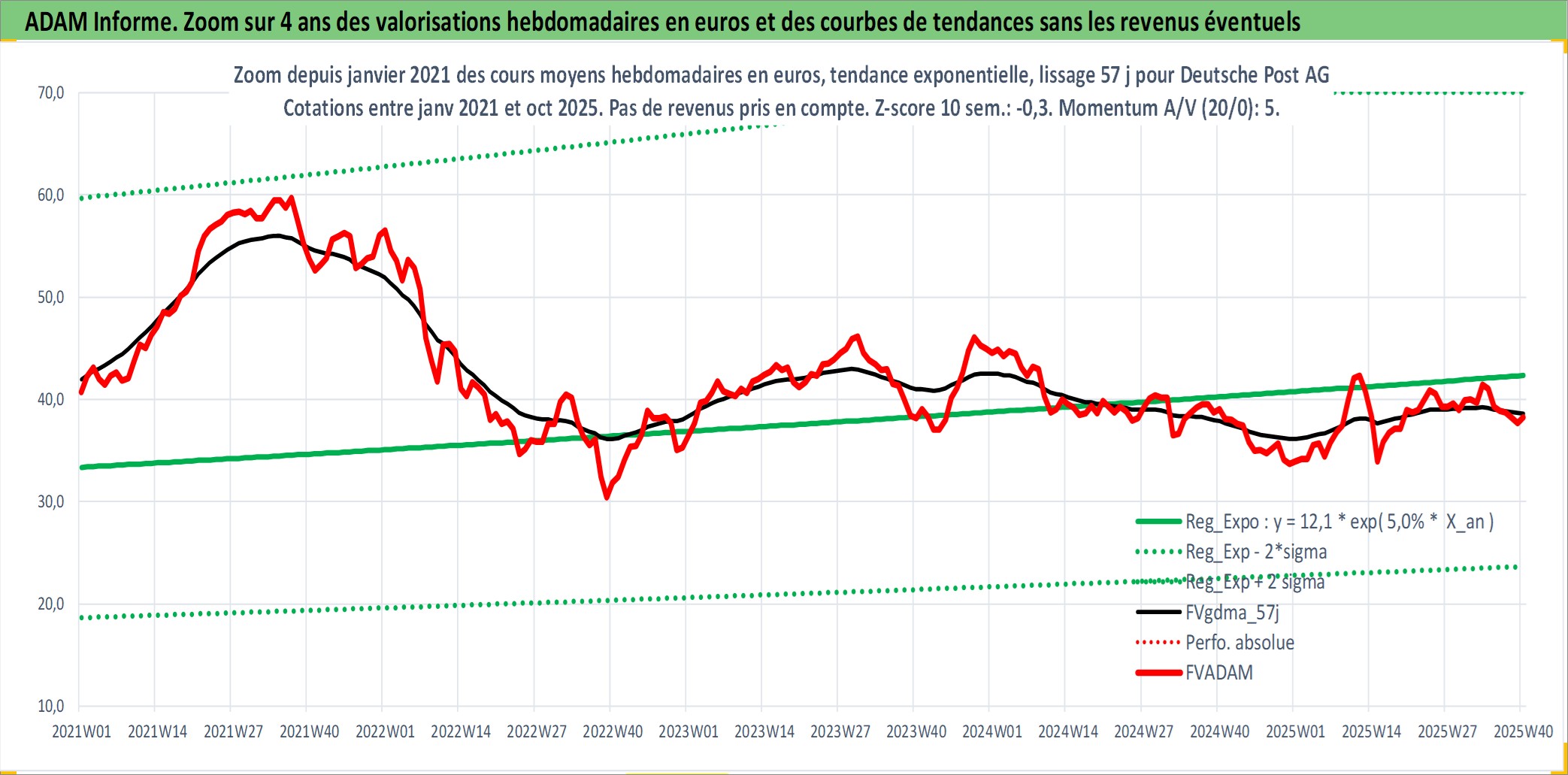 Site dédié aux investisseursPage dédiée sur site financeAnalyse des valorisations hebdomadaires de l'action Deutsche Post AG. Cet actif est cote en EUR. Les valorisations couvrent les semaines 2000W47 a 2025W40. Les revenus de cet actif financier sont pris en compte depuis la semaine 2001W26. La note ESG de cet actif n'est pas connue.