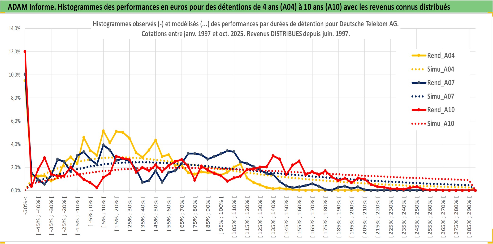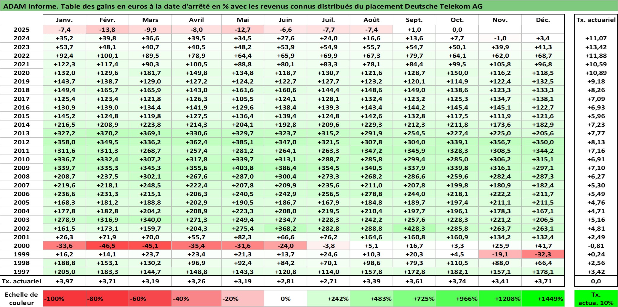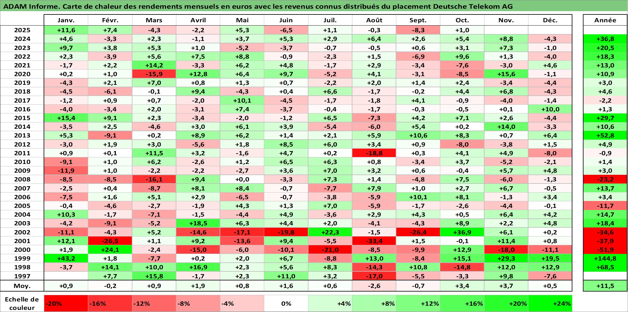Site dédié aux investisseursPage dédiée sur site financeAnalyse des valorisations hebdomadaires de l'action Deutsche Telekom AG. Cet actif est cote en EUR. Les valorisations couvrent les semaines 1997W01 a 2025W40. Les revenus de cet actif financier sont pris en compte depuis la semaine 1997W26. La note globale ESG de cet actif est estimee a 13.0 (apres rebasage entre 0 et 20).