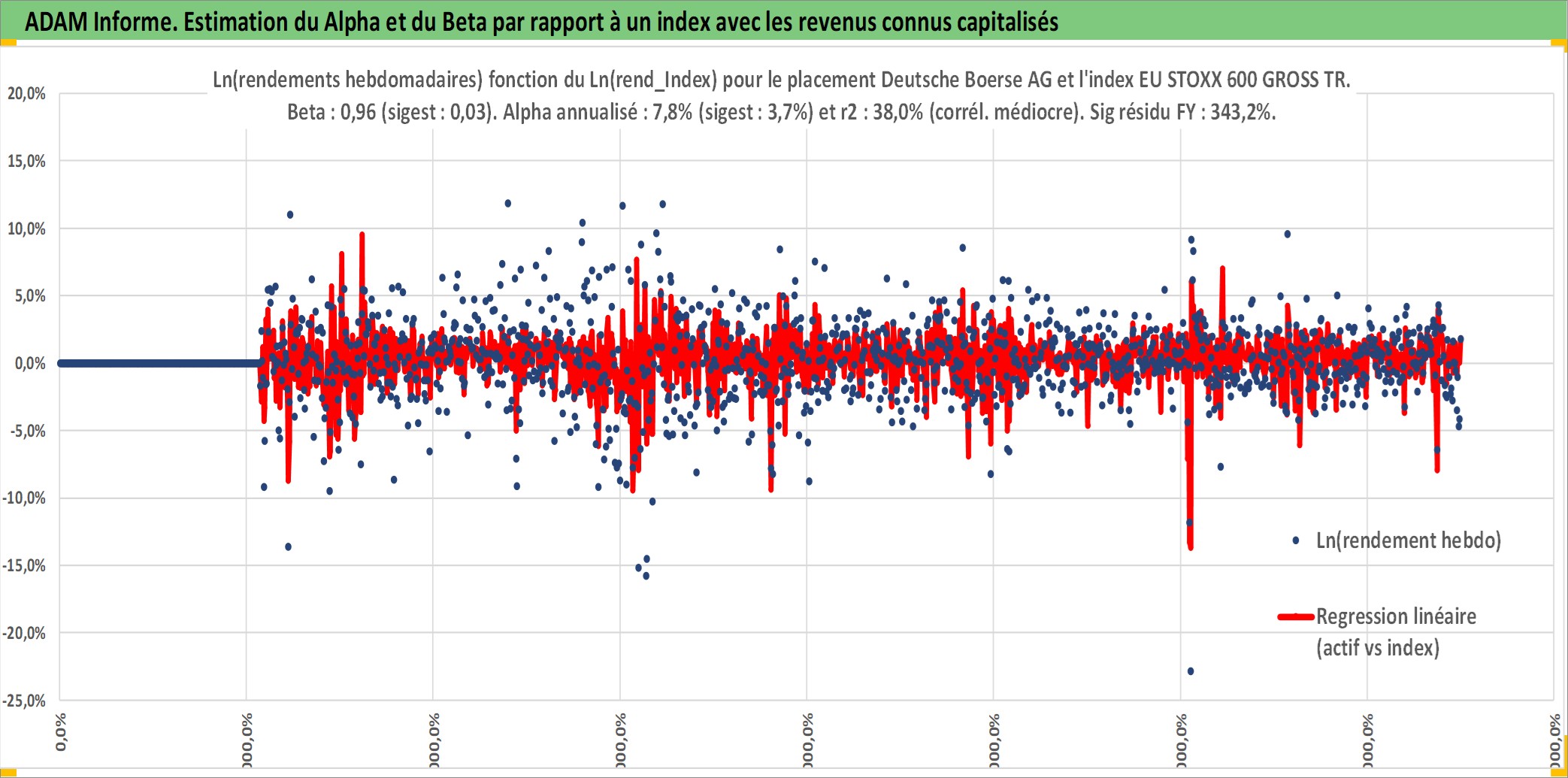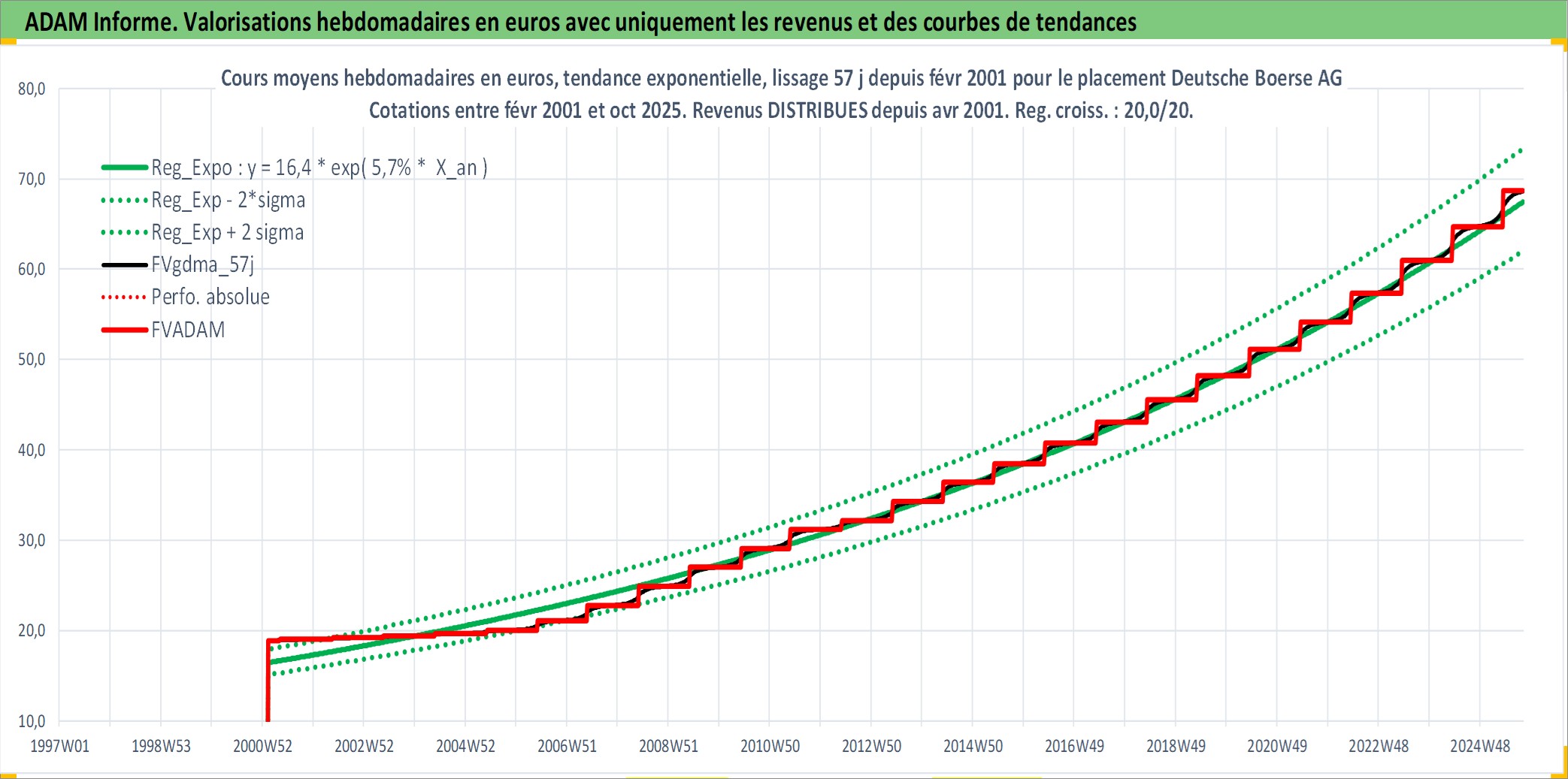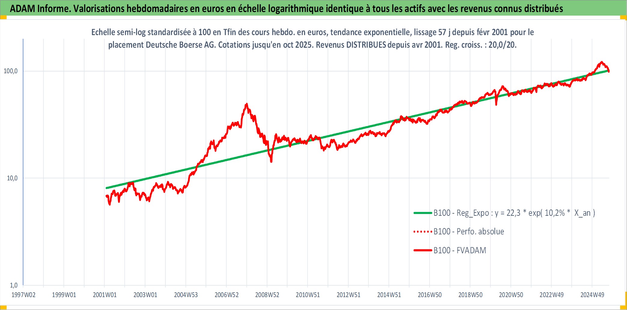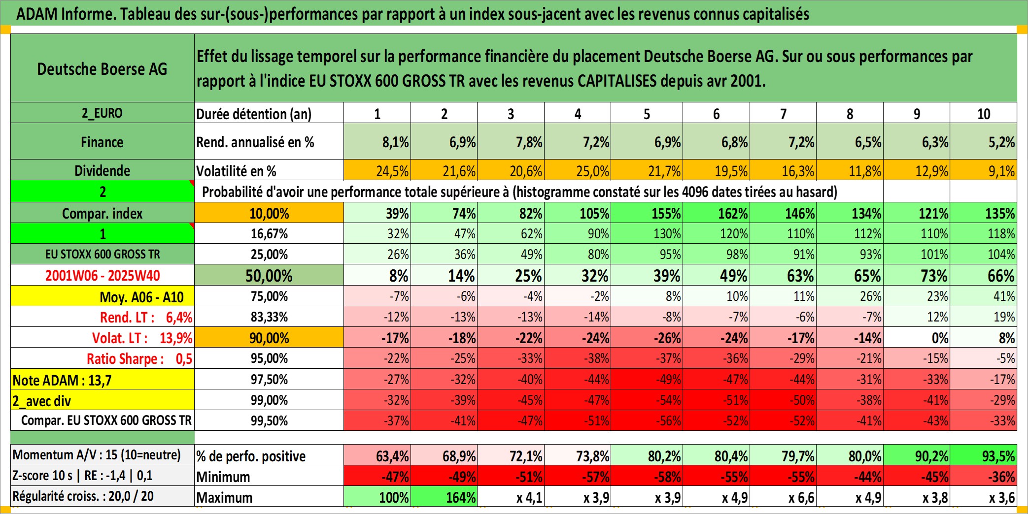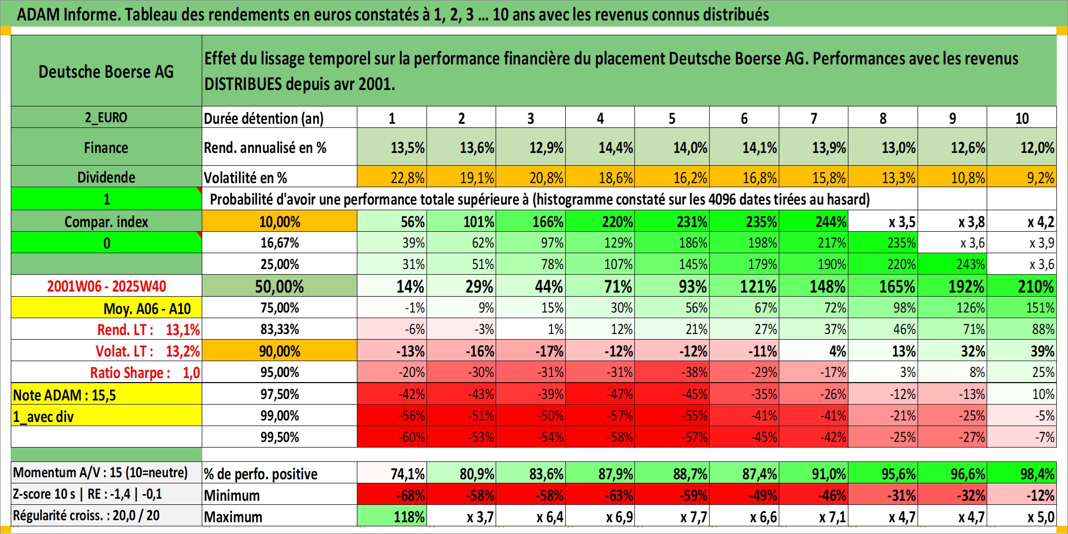Site dédié aux investisseursPage dédiée sur site financeAnalyse des valorisations hebdomadaires de l'action Deutsche Boerse AG. Cet actif est cote en EUR. Les valorisations couvrent les semaines 2001W06 a 2025W40. Les revenus de cet actif financier sont pris en compte depuis la semaine 2001W18. La note globale ESG de cet actif est estimee a 15.0 (apres rebasage entre 0 et 20).