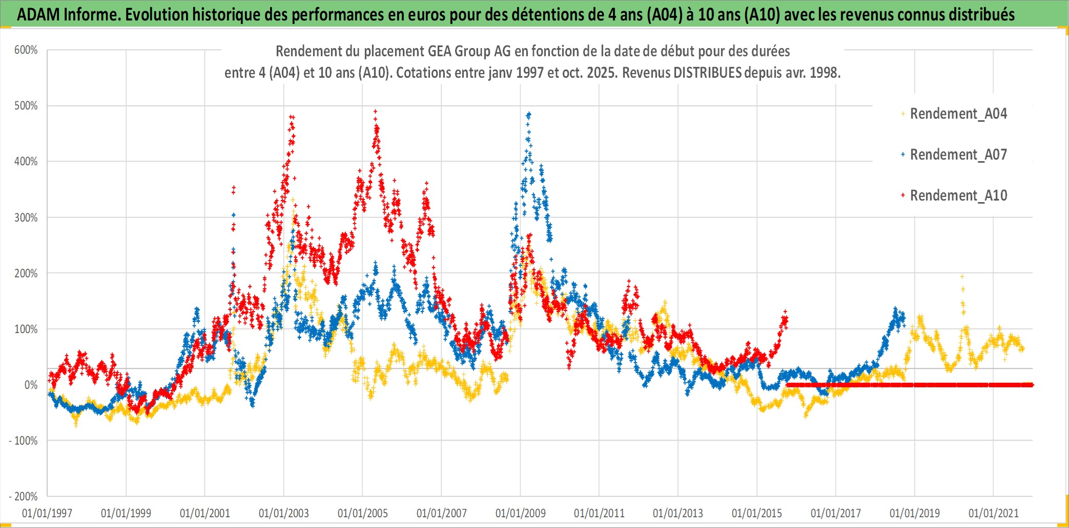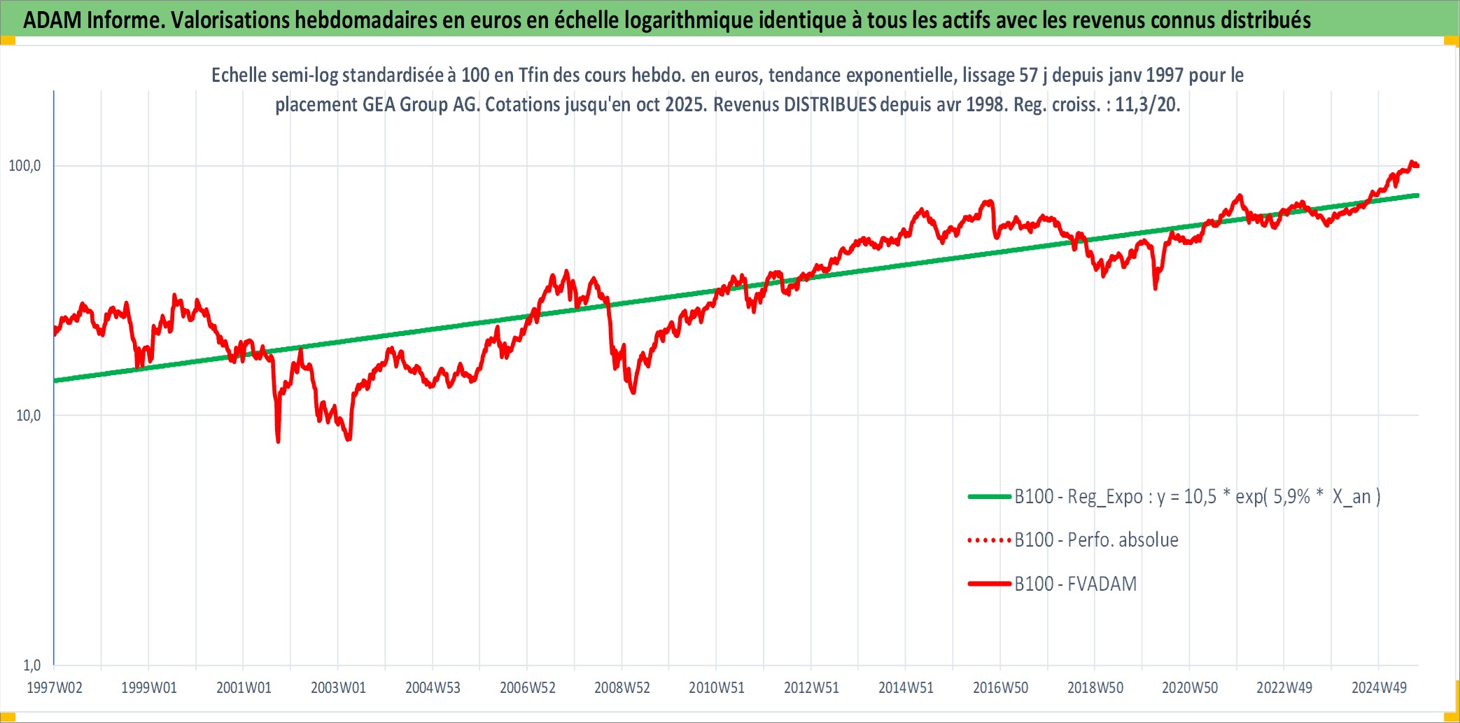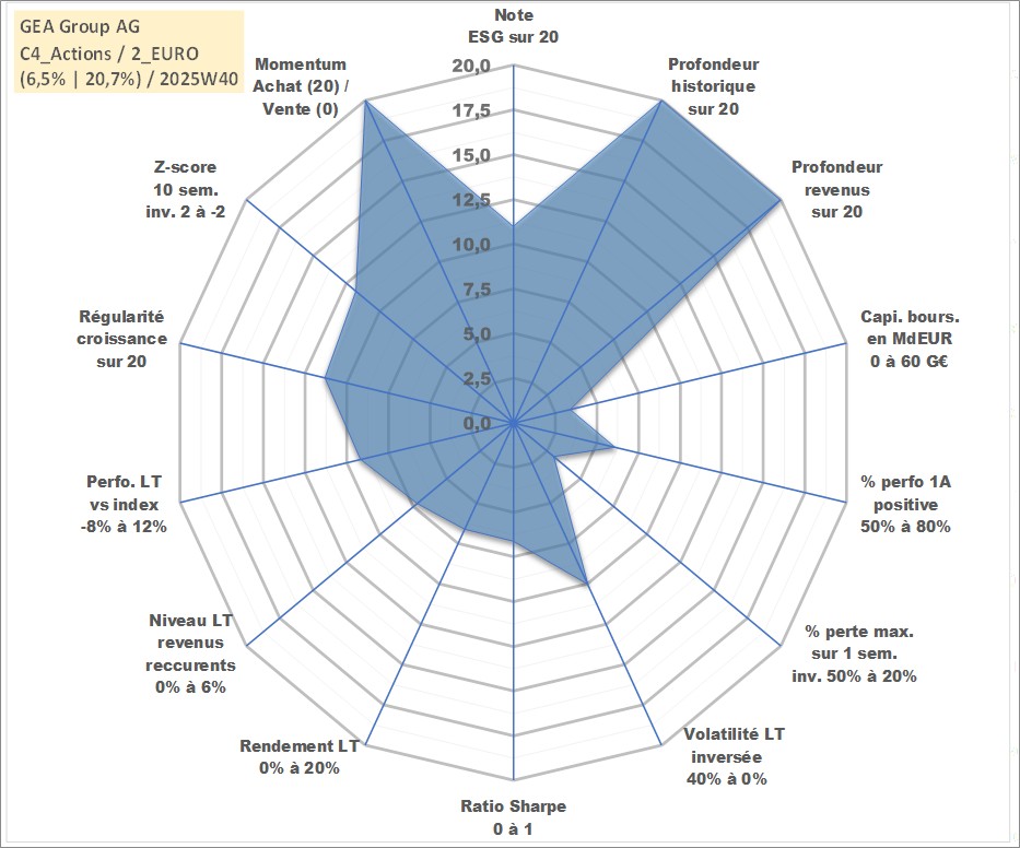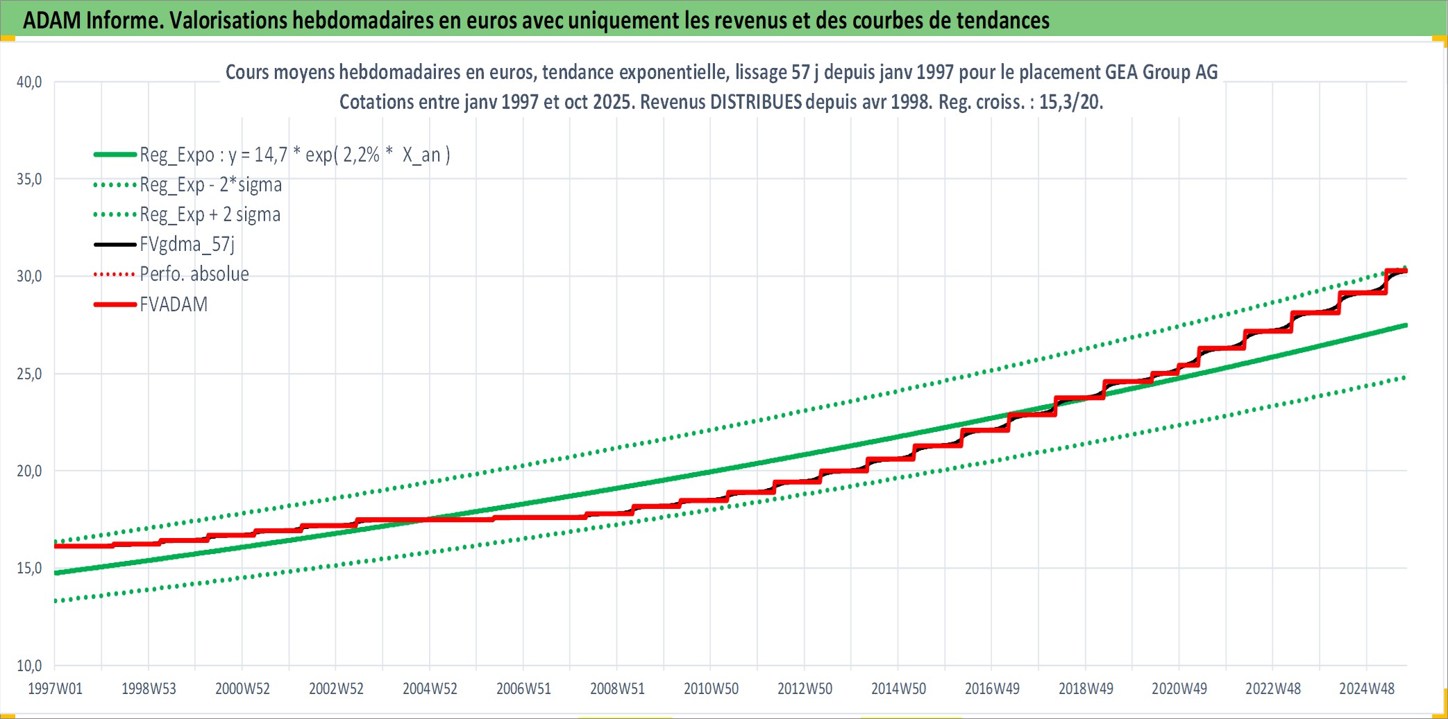 Site dédié aux investisseursPage dédiée sur site financeAnalyse des valorisations hebdomadaires de l'action GEA Group AG. Cet actif est cote en EUR. Les valorisations couvrent les semaines 1997W01 a 2025W40. Les revenus de cet actif financier sont pris en compte depuis la semaine 1998W14. La note globale ESG de cet actif est estimee a 11.0 (apres rebasage entre 0 et 20).
