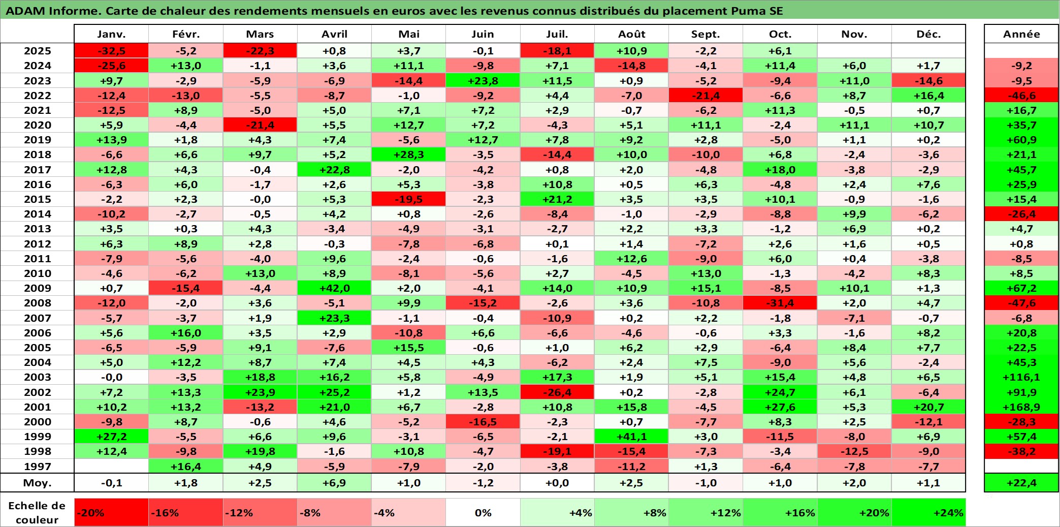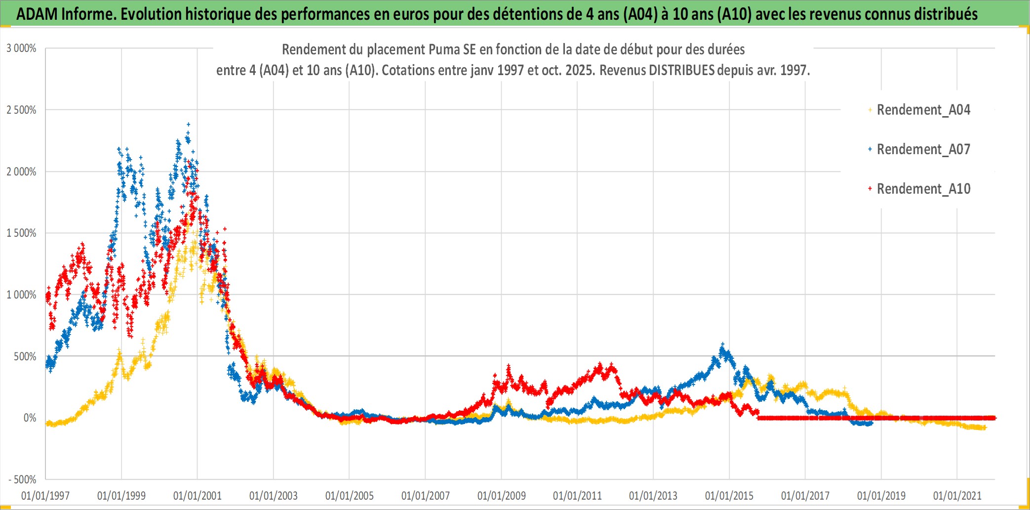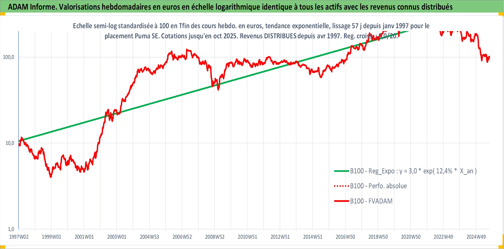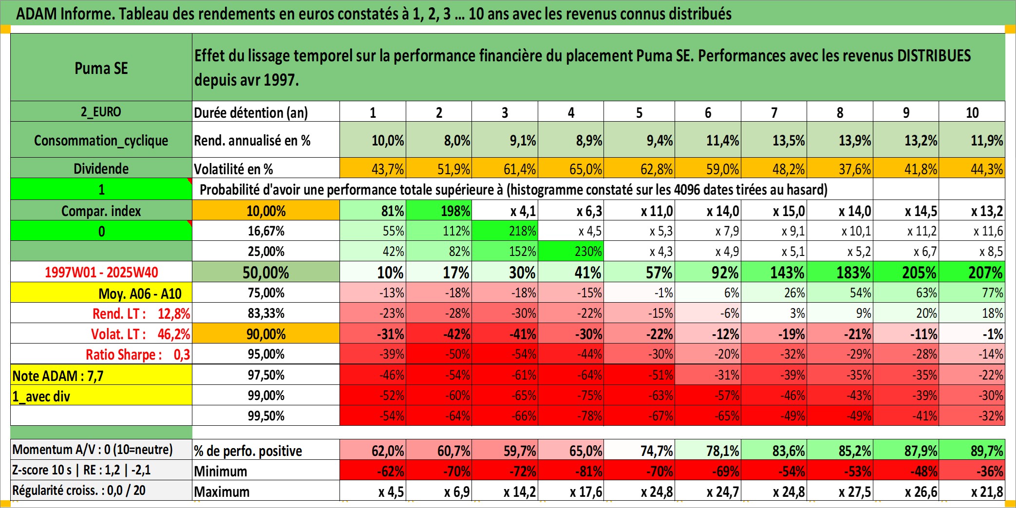 Site dédié aux investisseursPage dédiée sur site financeAnalyse des valorisations hebdomadaires de l'action Puma SE. Cet actif est cote en EUR. Les valorisations couvrent les semaines 1997W01 a 2025W40. Les revenus de cet actif financier sont pris en compte depuis la semaine 1997W17. La note ESG de cet actif n'est pas connue.