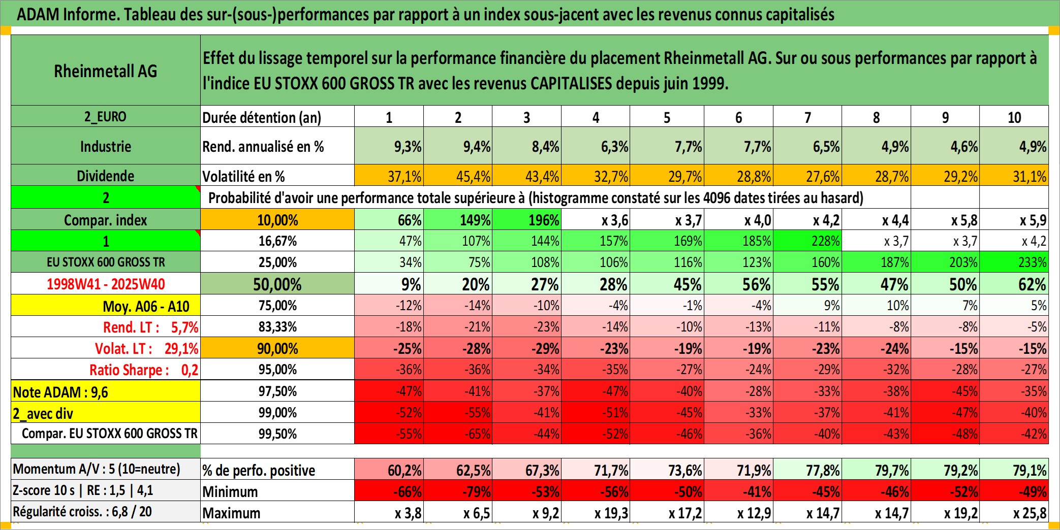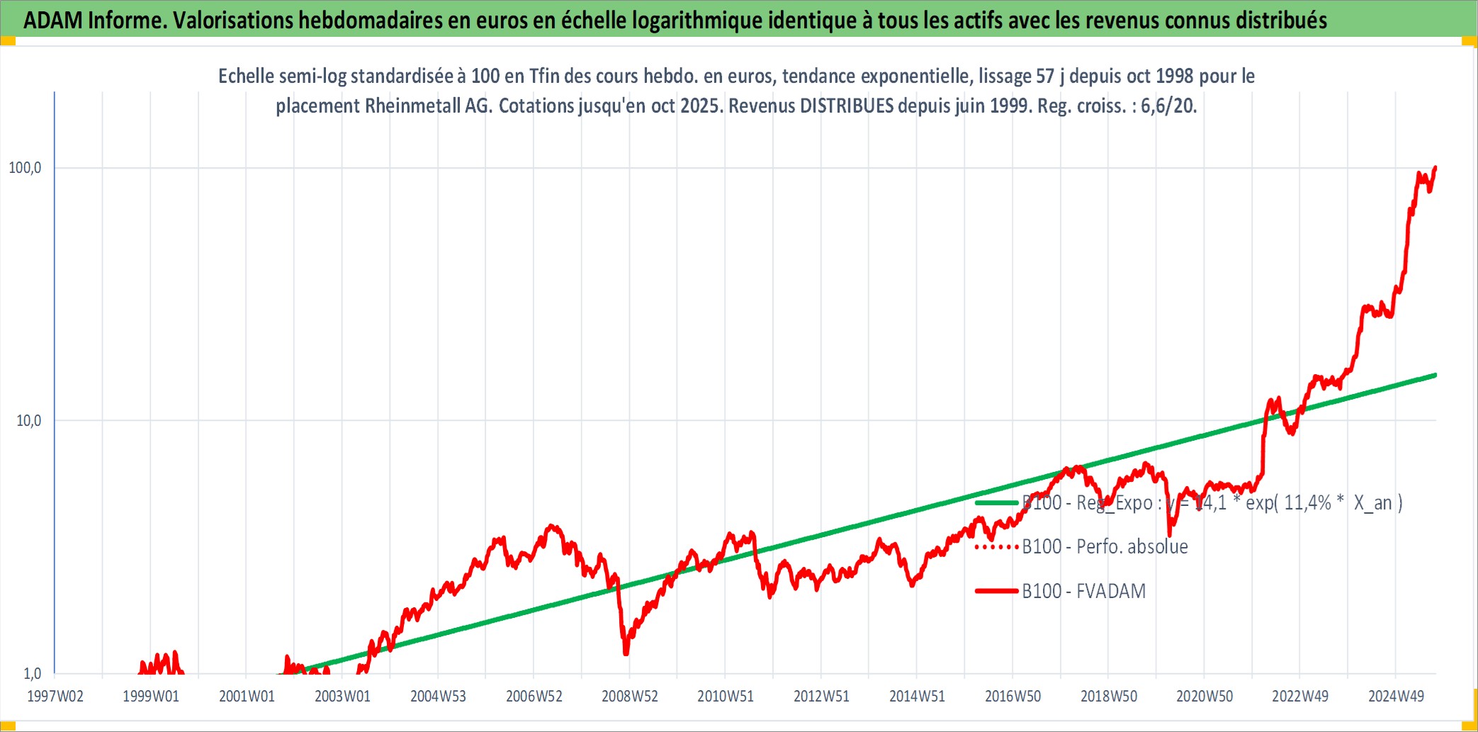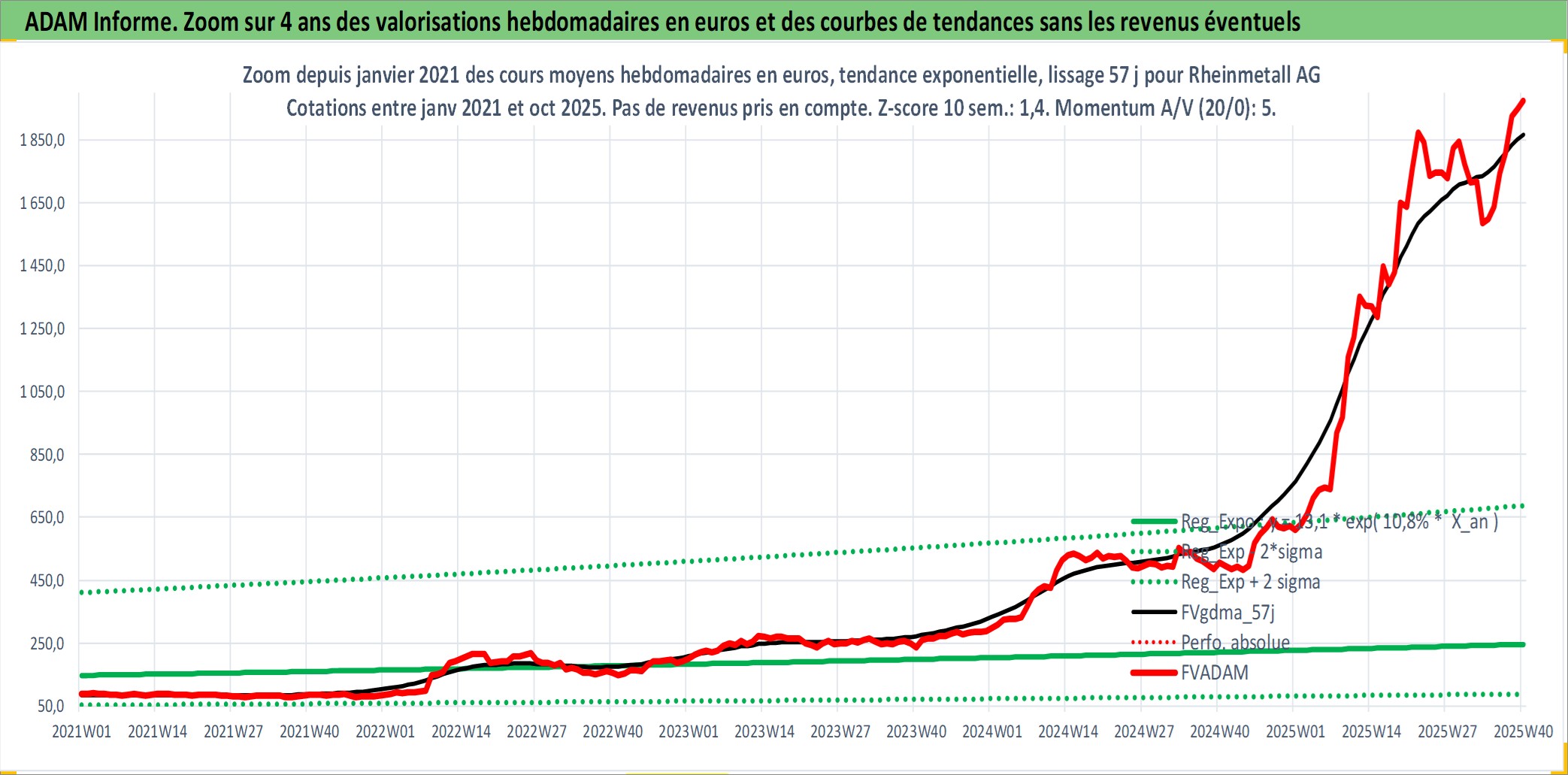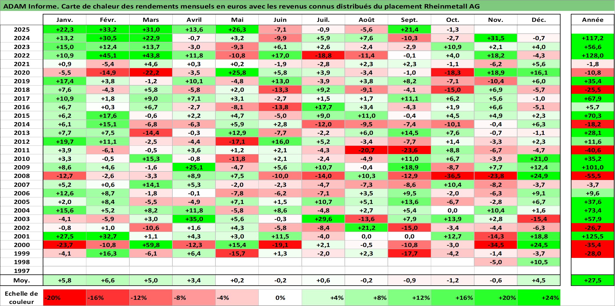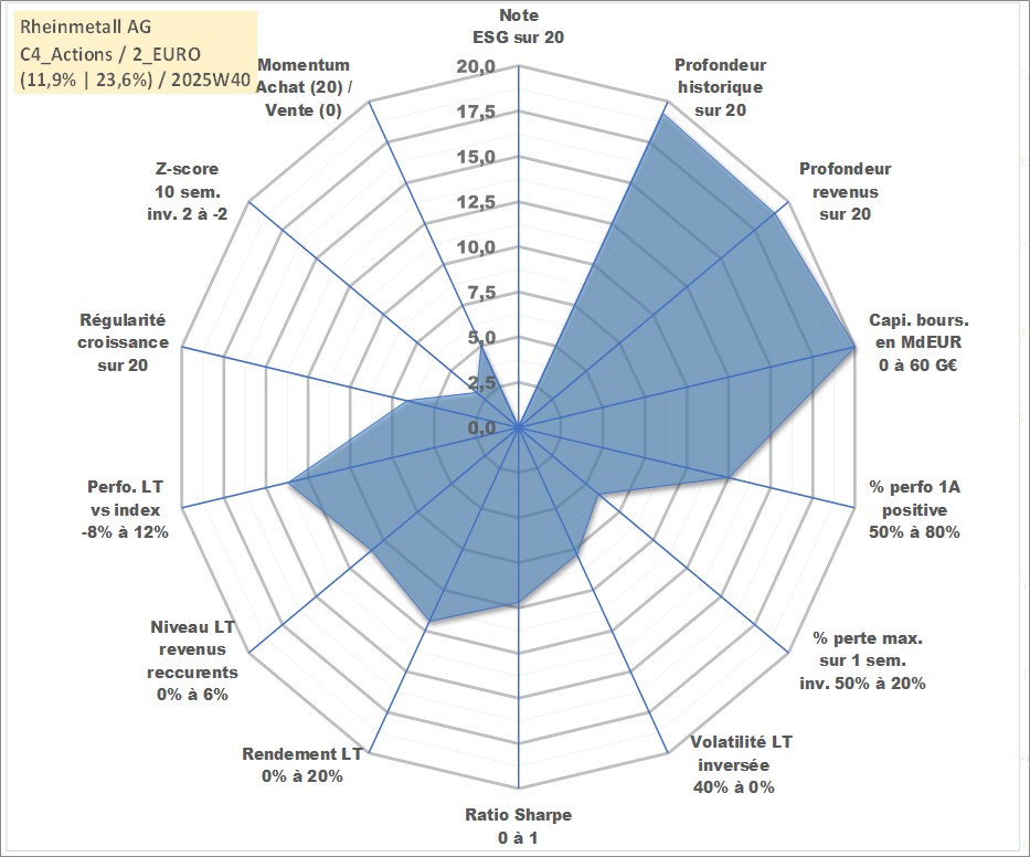 Site dédié aux investisseursPage dédiée sur site financeAnalyse des valorisations hebdomadaires de l'action Rheinmetall AG. Cet actif est cote en EUR. Les valorisations couvrent les semaines 1998W41 a 2025W40. Les revenus de cet actif financier sont pris en compte depuis la semaine 1999W25. La note ESG de cet actif n'est pas connue.