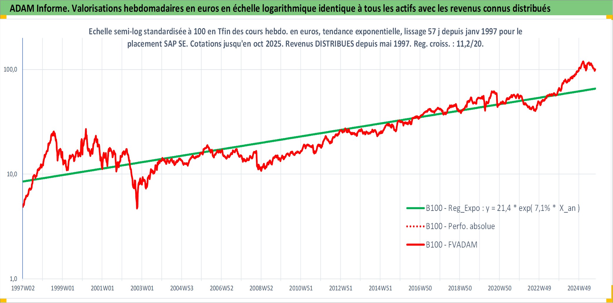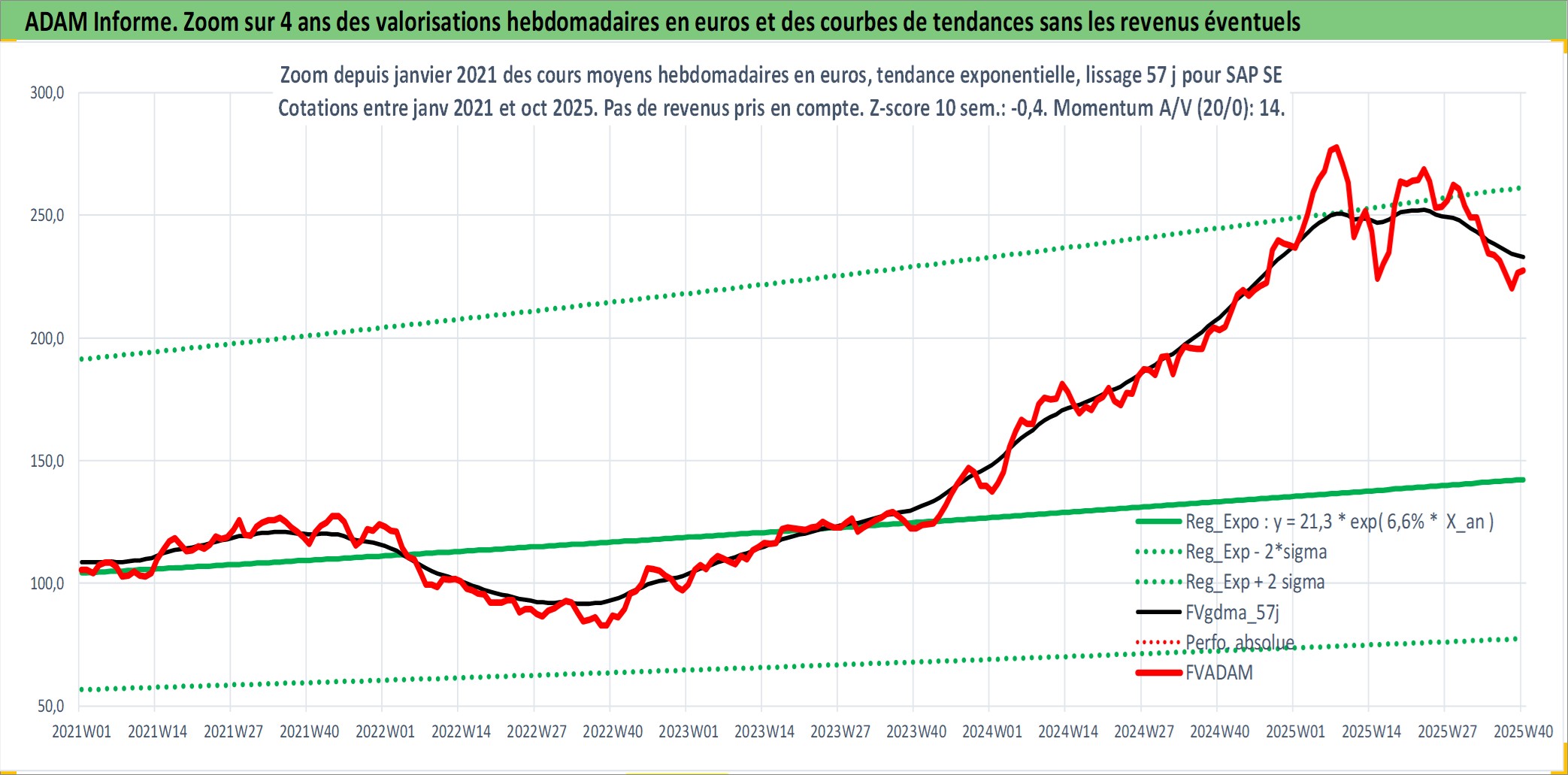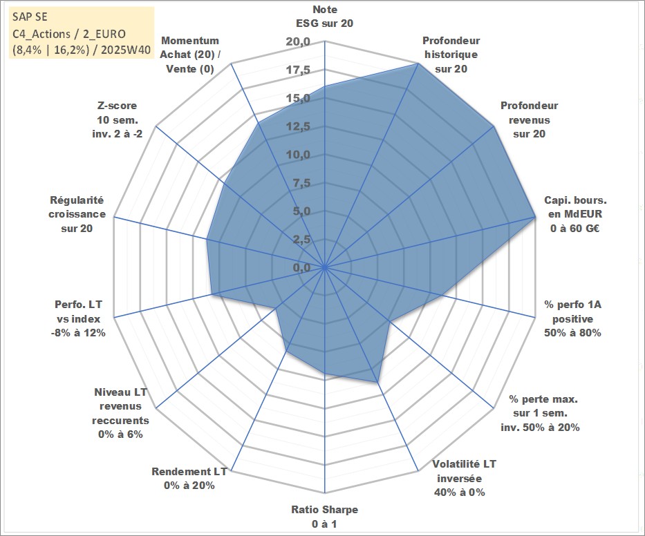 Site dédié aux investisseursPage dédiée sur site financeAnalyse des valorisations hebdomadaires de l'action SAP SE. Cet actif est cote en EUR. Les valorisations couvrent les semaines 1997W01 a 2025W40. Les revenus de cet actif financier sont pris en compte depuis la semaine 1997W19. La note globale ESG de cet actif est estimee a 16.0 (apres rebasage entre 0 et 20).