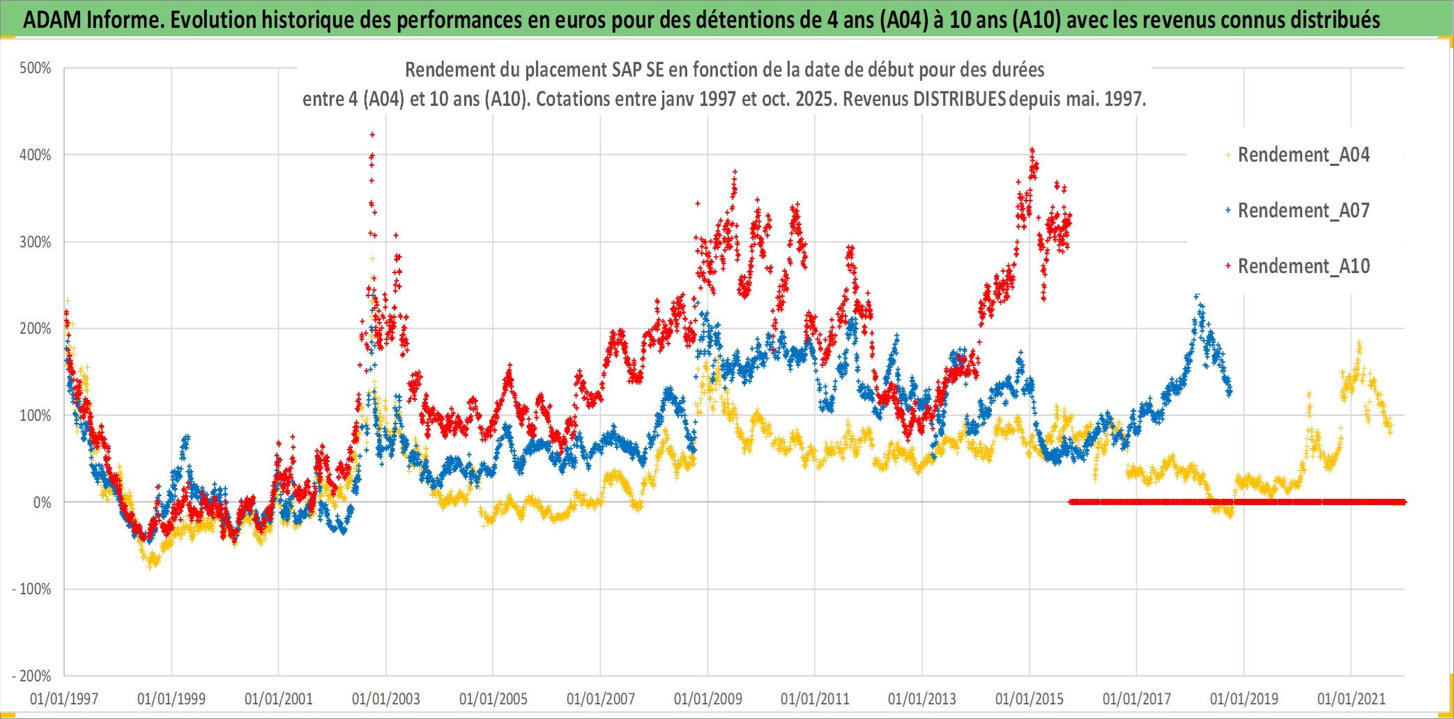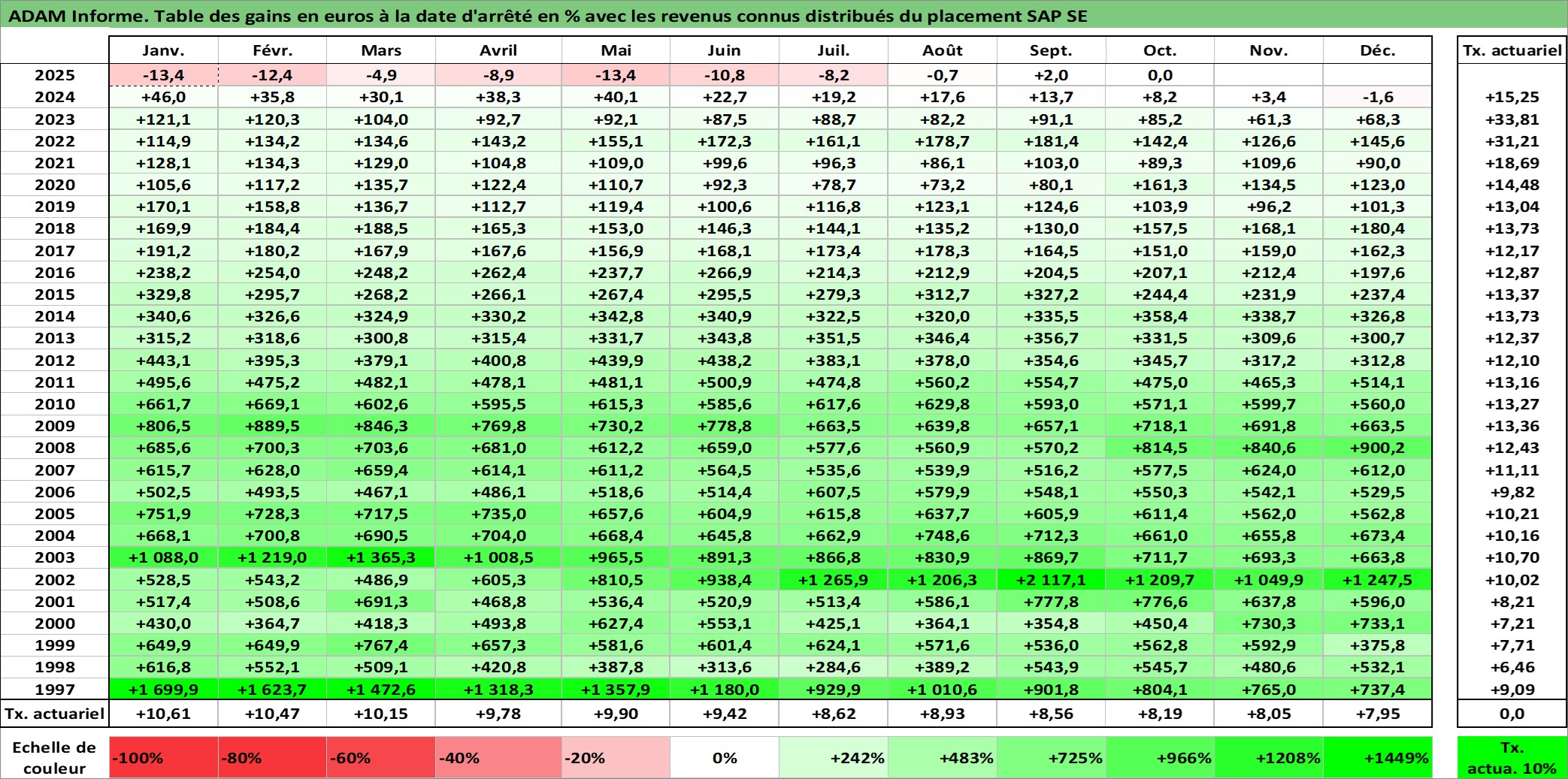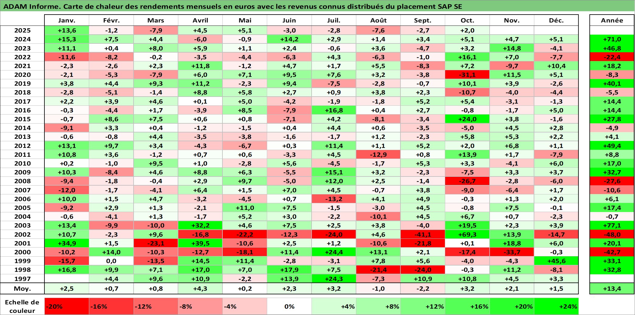 Site dédié aux investisseursPage dédiée sur site financeAnalyse des valorisations hebdomadaires de l'action SAP SE. Cet actif est cote en EUR. Les valorisations couvrent les semaines 1997W01 a 2025W40. Les revenus de cet actif financier sont pris en compte depuis la semaine 1997W19. La note globale ESG de cet actif est estimee a 16.0 (apres rebasage entre 0 et 20).