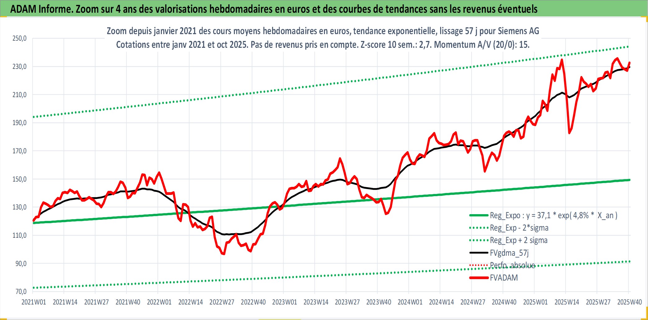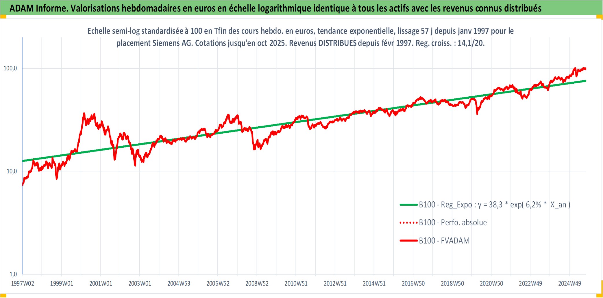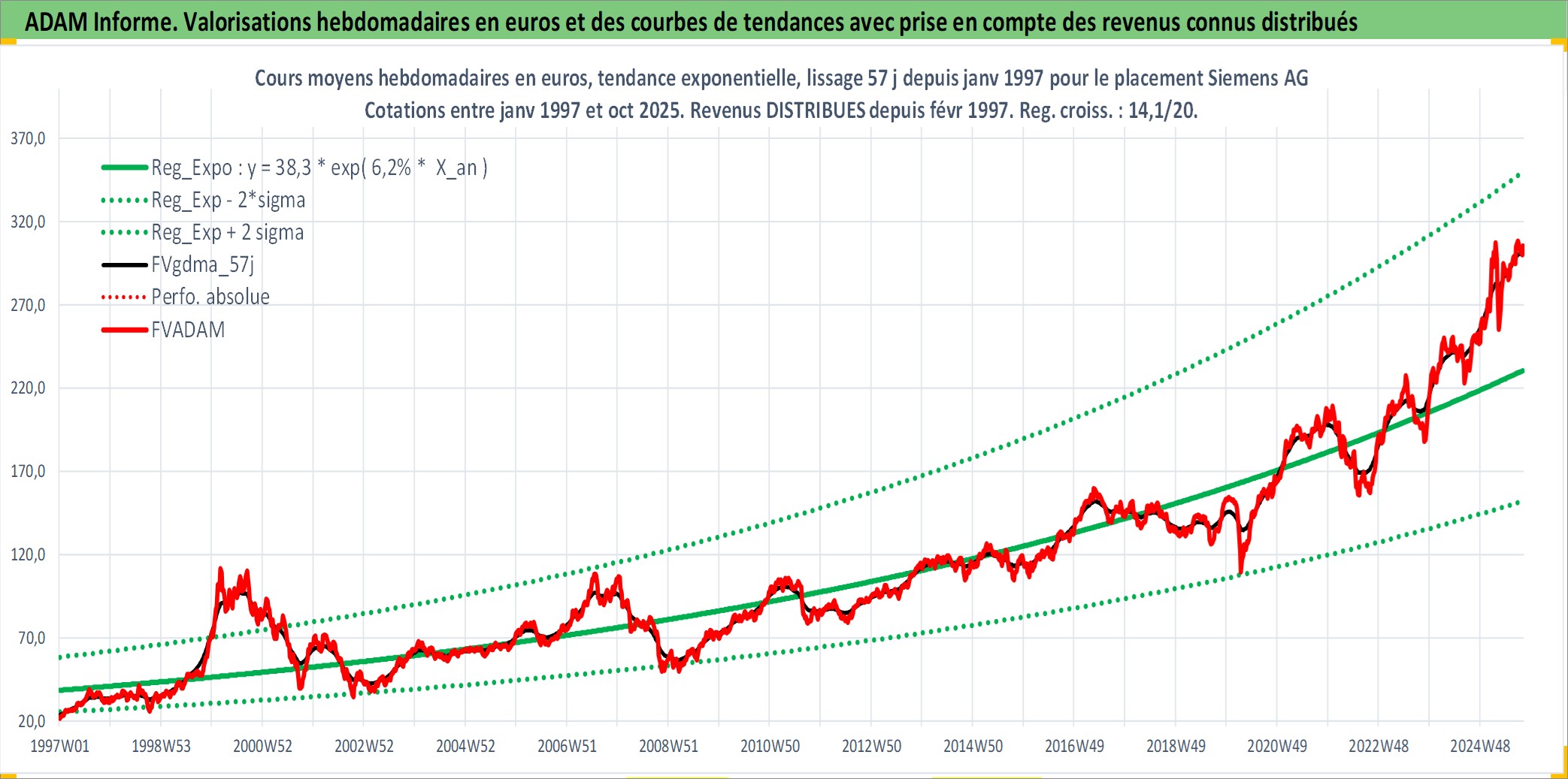 Site dédié aux investisseursPage dédiée sur site financeAnalyse des valorisations hebdomadaires de l'action Siemens AG. Cet actif est cote en EUR. Les valorisations couvrent les semaines 1997W01 a 2025W40. Les revenus de cet actif financier sont pris en compte depuis la semaine 1997W07. La note globale ESG de cet actif est estimee a 5.0 (apres rebasage entre 0 et 20).