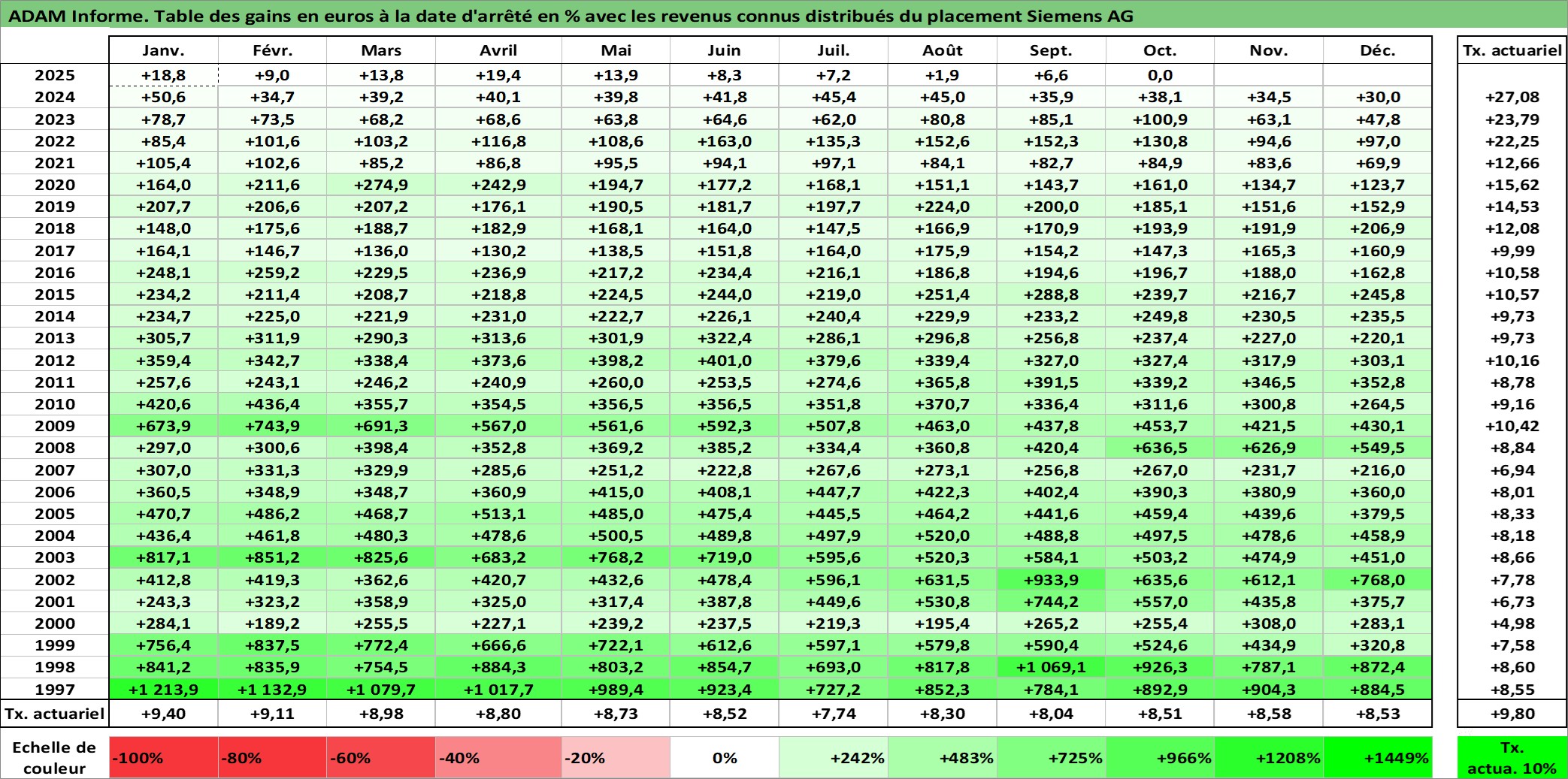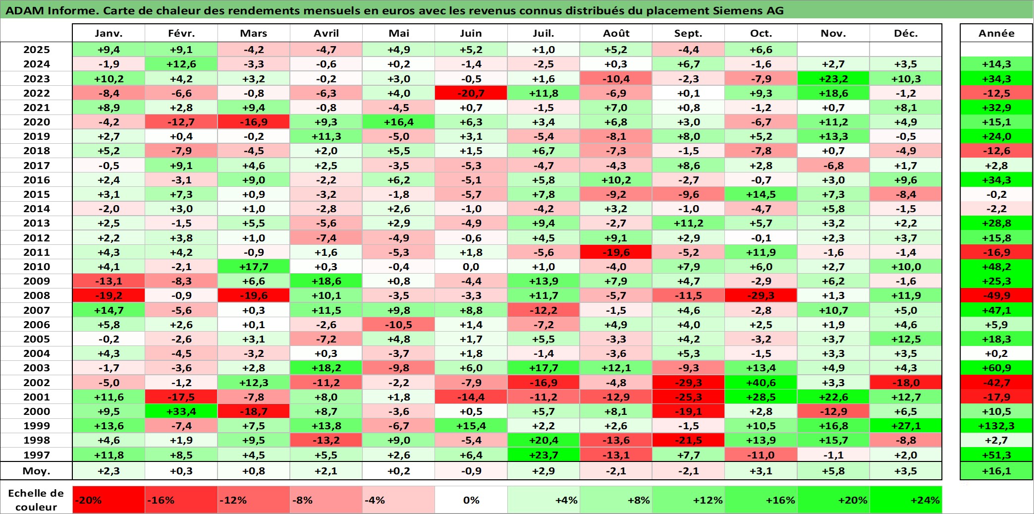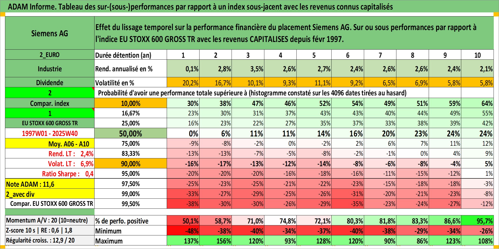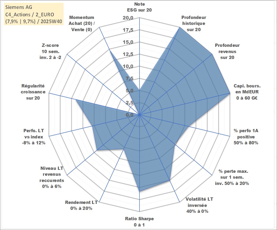 Site dédié aux investisseursPage dédiée sur site financeAnalyse des valorisations hebdomadaires de l'action Siemens AG. Cet actif est cote en EUR. Les valorisations couvrent les semaines 1997W01 a 2025W40. Les revenus de cet actif financier sont pris en compte depuis la semaine 1997W07. La note globale ESG de cet actif est estimee a 5.0 (apres rebasage entre 0 et 20).