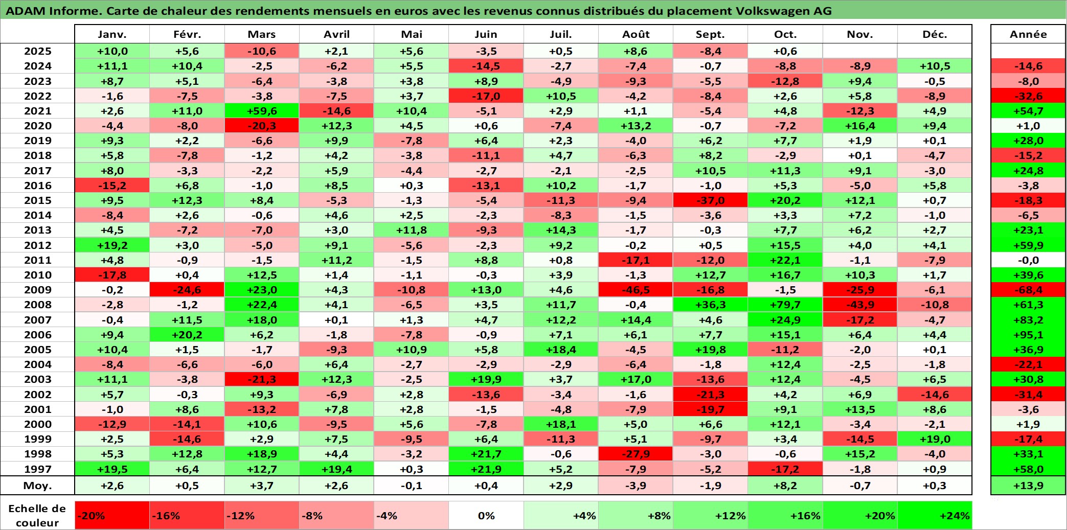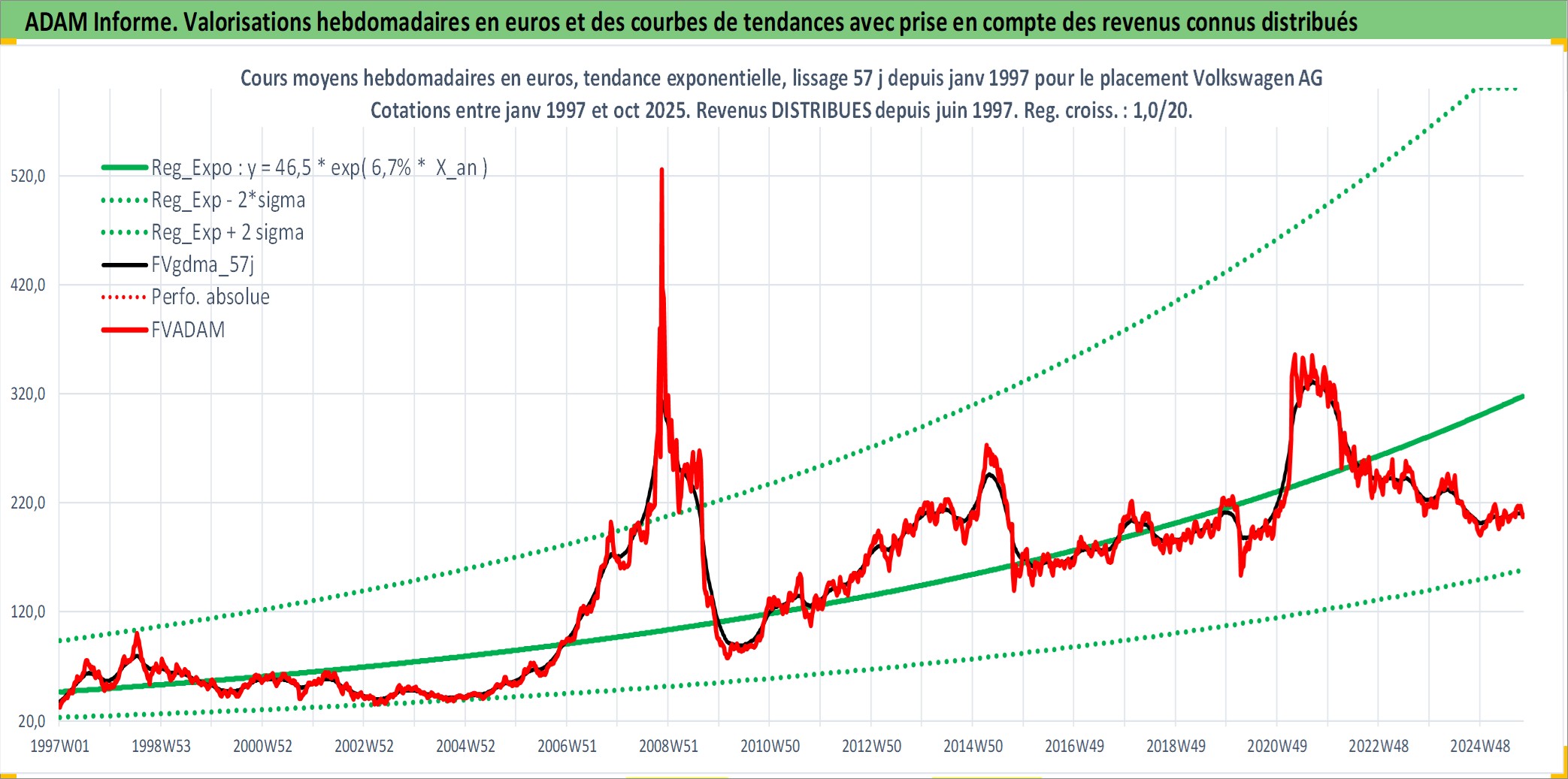 Site dédié aux investisseursPage dédiée sur site financeAnalyse des valorisations hebdomadaires de l'action Volkswagen AG. Cet actif est cote en EUR. Les valorisations couvrent les semaines 1997W01 a 2025W40. Les revenus de cet actif financier sont pris en compte depuis la semaine 1997W25. La note ESG de cet actif n'est pas connue.