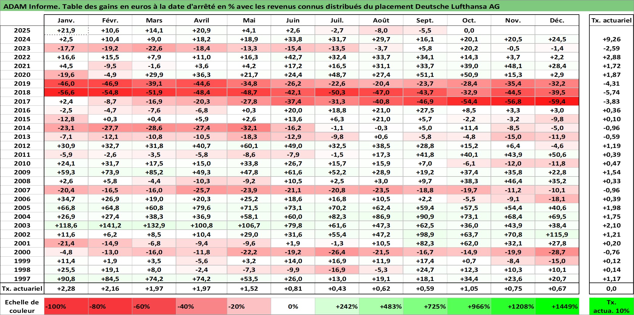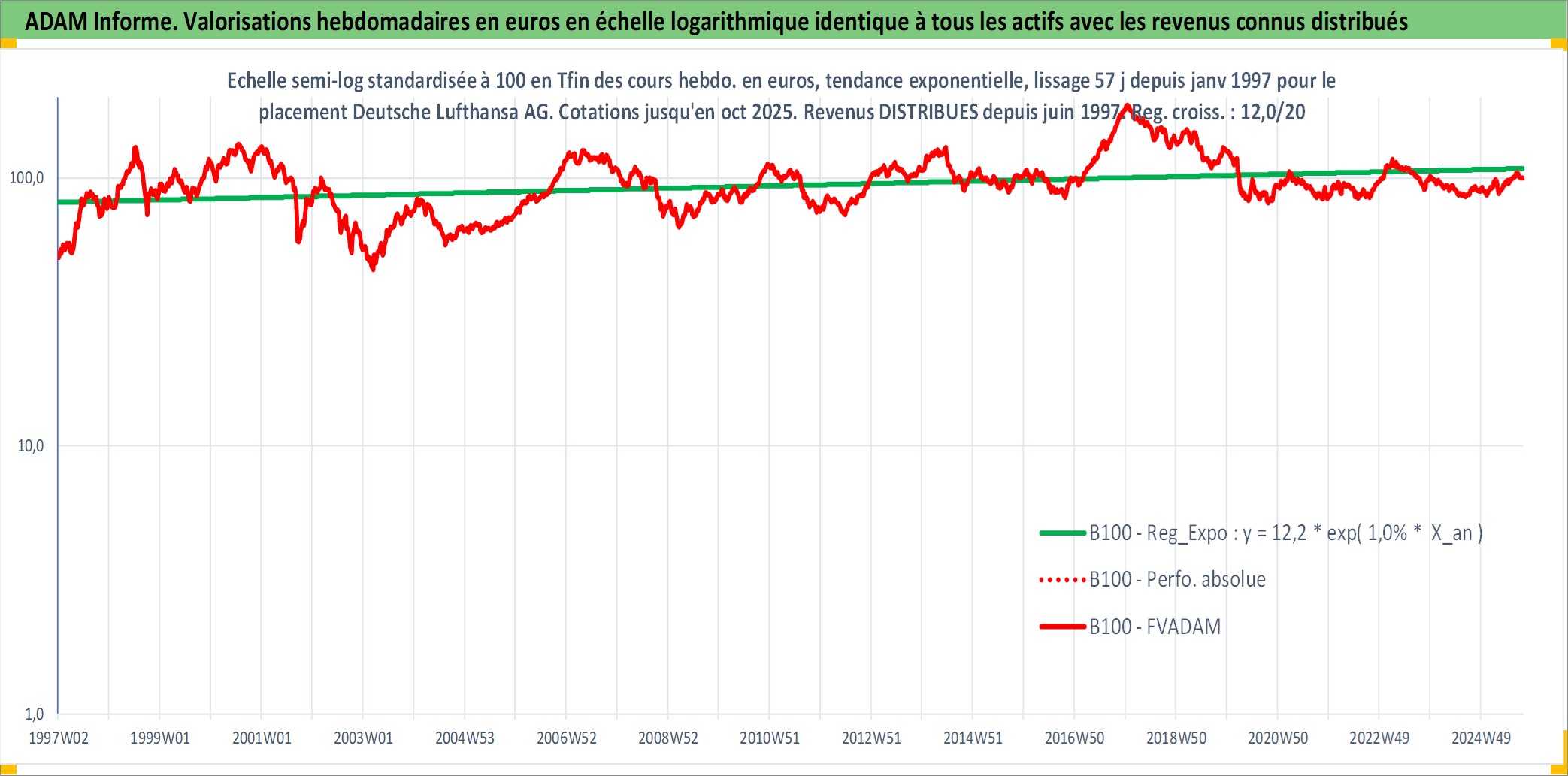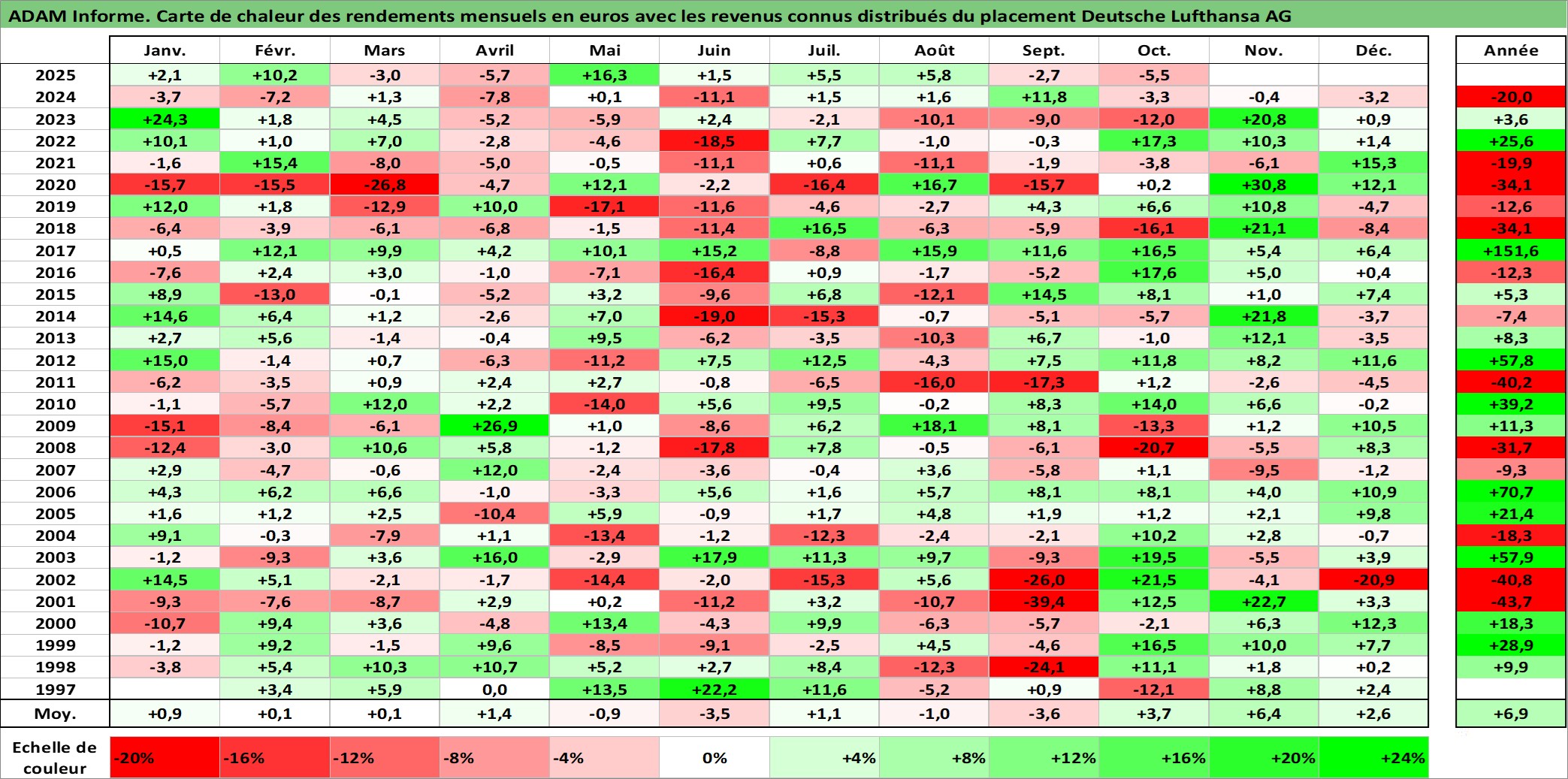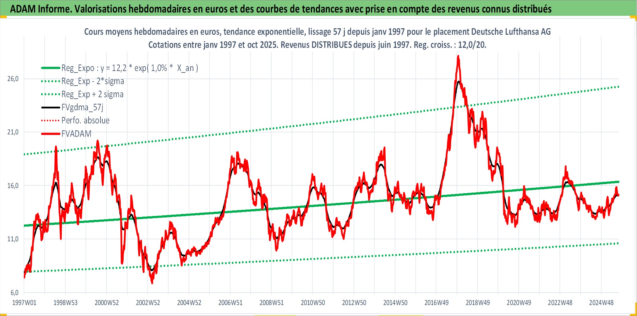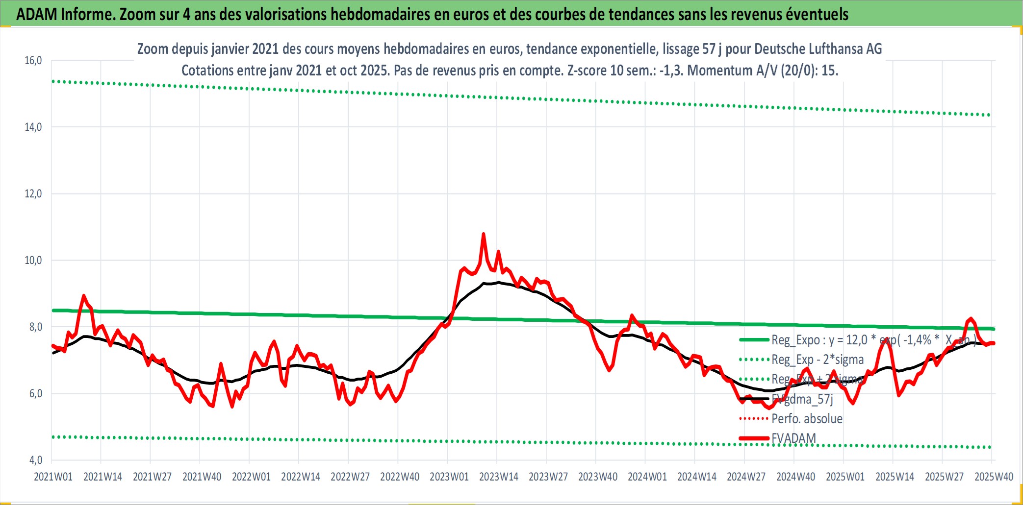 Site dédié aux investisseursPage dédiée sur site financeAnalyse des valorisations hebdomadaires de l'action Deutsche Lufthansa AG. Cet actif est cote en EUR. Les valorisations couvrent les semaines 1997W01 a 2025W40. Les revenus de cet actif financier sont pris en compte depuis la semaine 1997W26. La note globale ESG de cet actif est estimee a 6.0 (apres rebasage entre 0 et 20).
