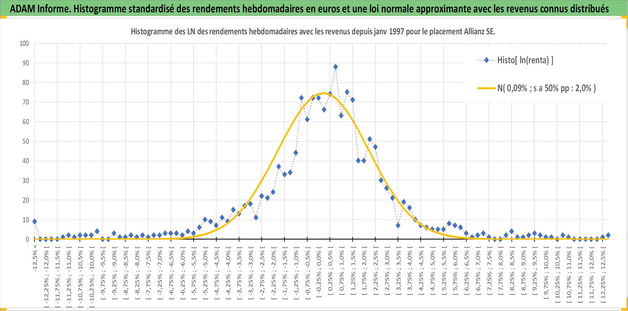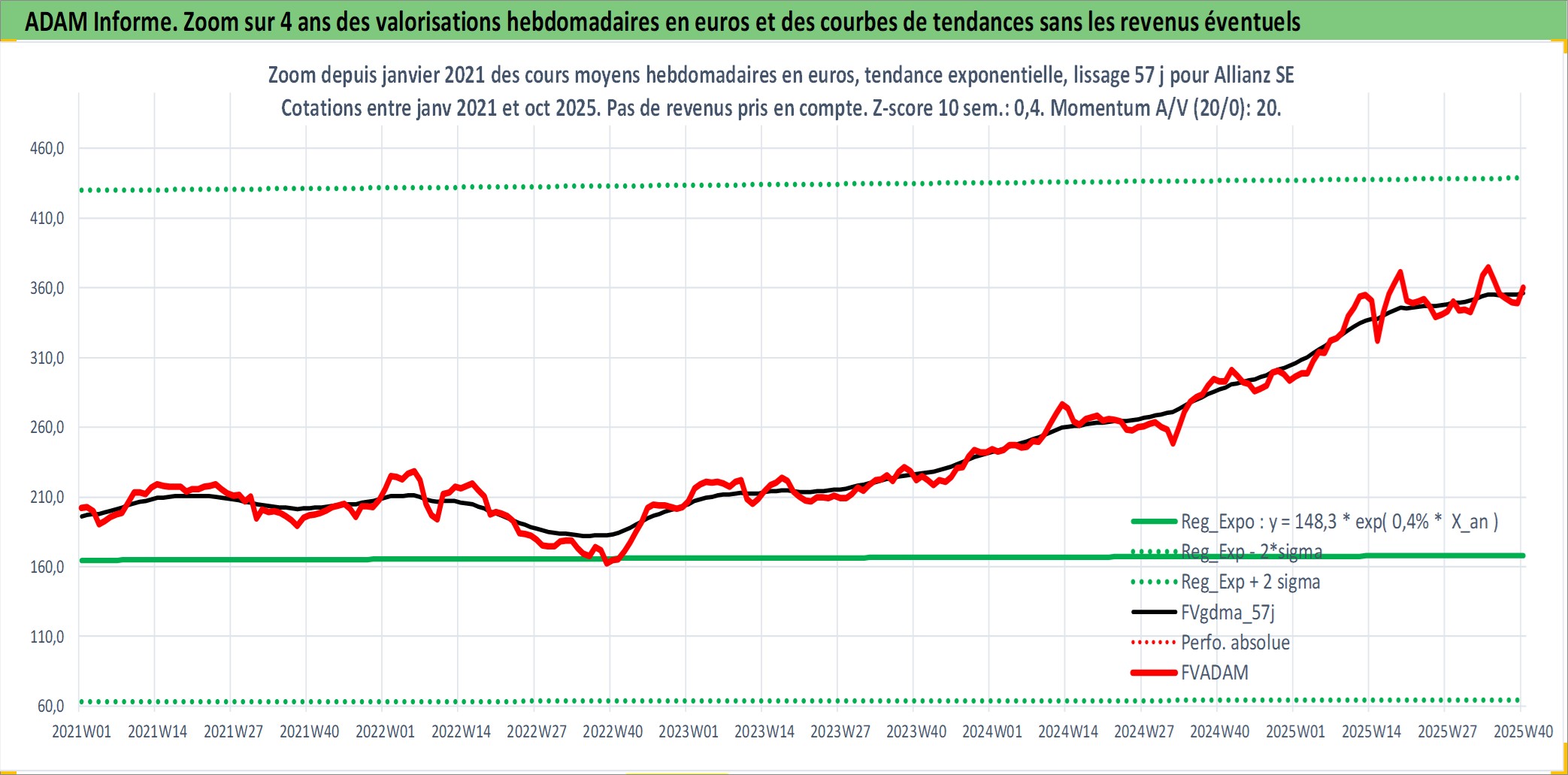Site dédié aux investisseursPage dédiée sur site financeAnalyse des valorisations hebdomadaires de l'action Allianz SE. Cet actif est cote en EUR. Les valorisations couvrent les semaines 1997W01 a 2025W40. Les revenus de cet actif financier sont pris en compte depuis la semaine 1997W28. La note globale ESG de cet actif est estimee a 12.0 (apres rebasage entre 0 et 20).