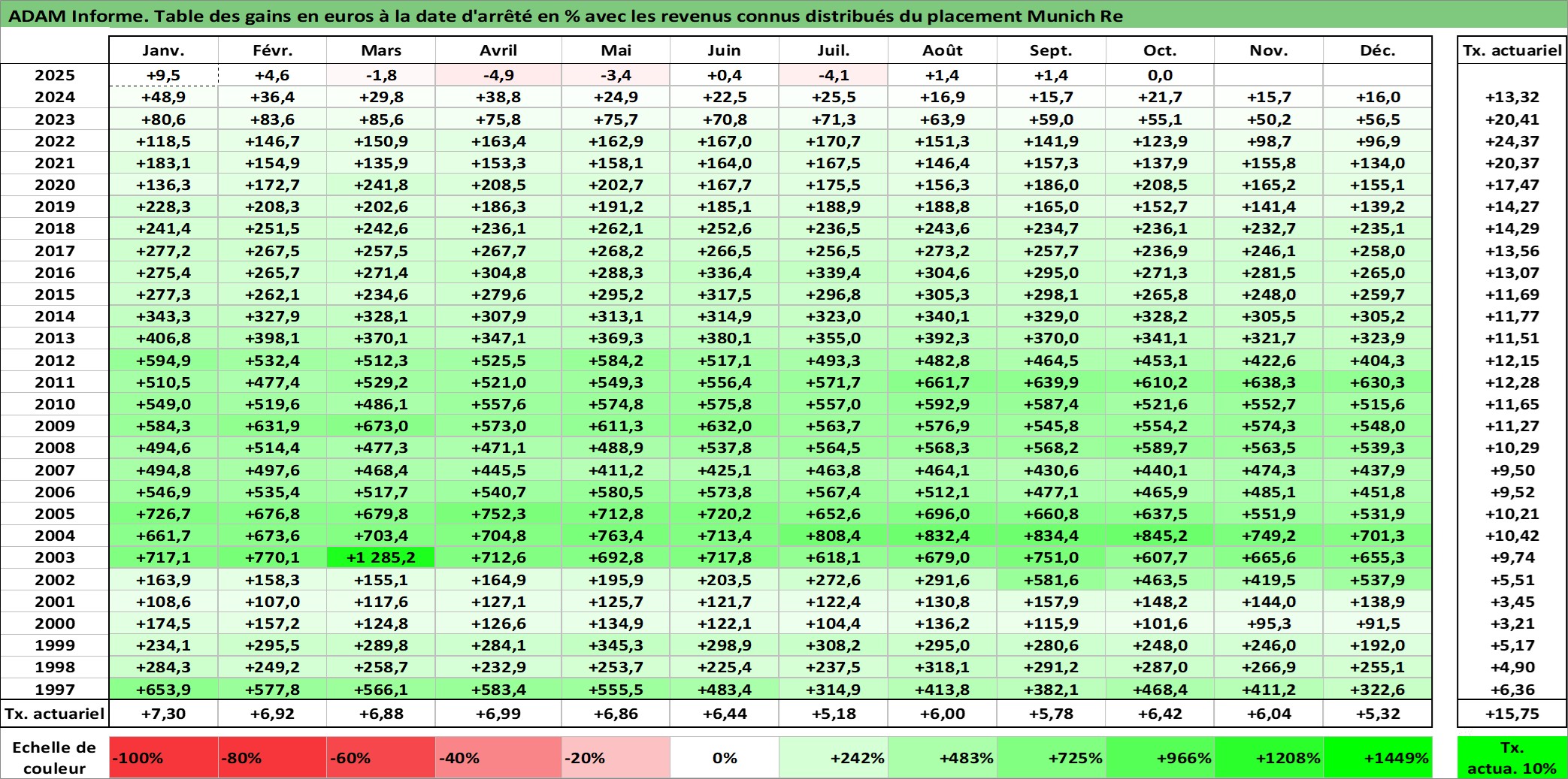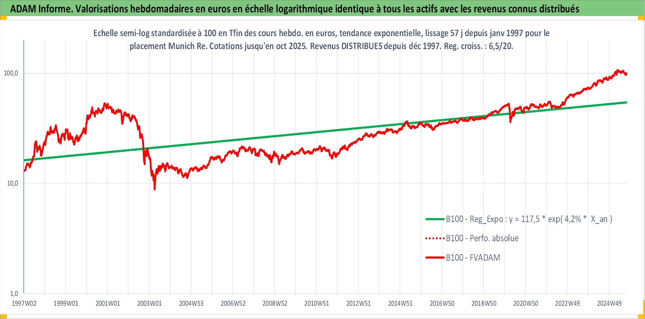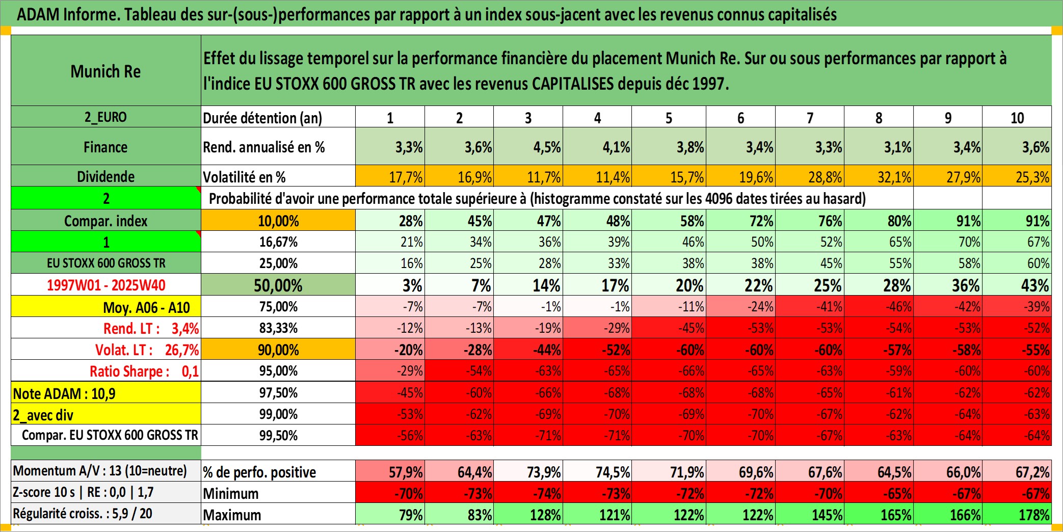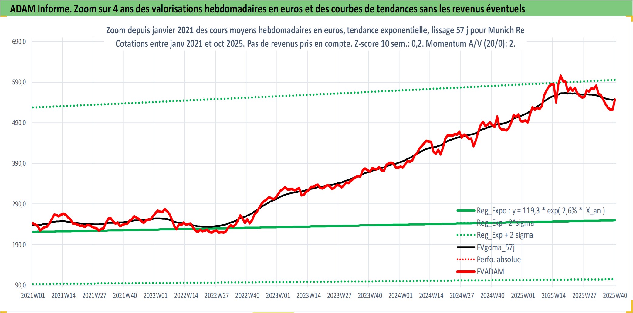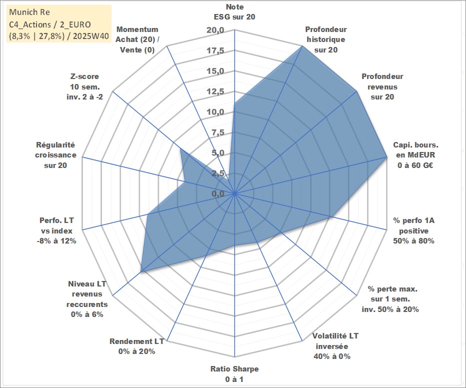 Site dédié aux investisseursPage dédiée sur site financeAnalyse des valorisations hebdomadaires de l'action Munich Re. Cet actif est cote en EUR. Les valorisations couvrent les semaines 1997W01 a 2025W40. Les revenus de cet actif financier sont pris en compte depuis la semaine 1997W50. La note globale ESG de cet actif est estimee a 11.0 (apres rebasage entre 0 et 20).