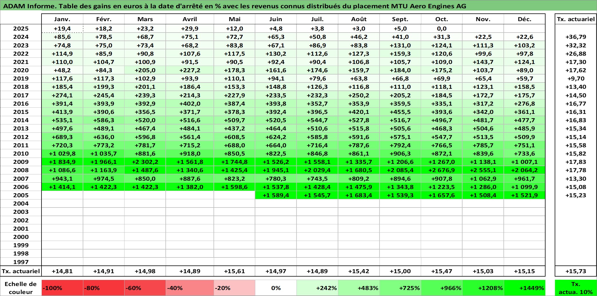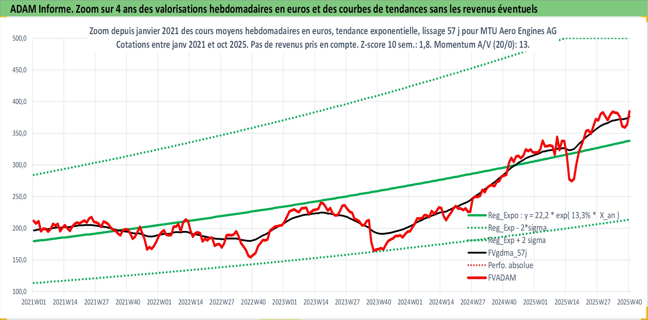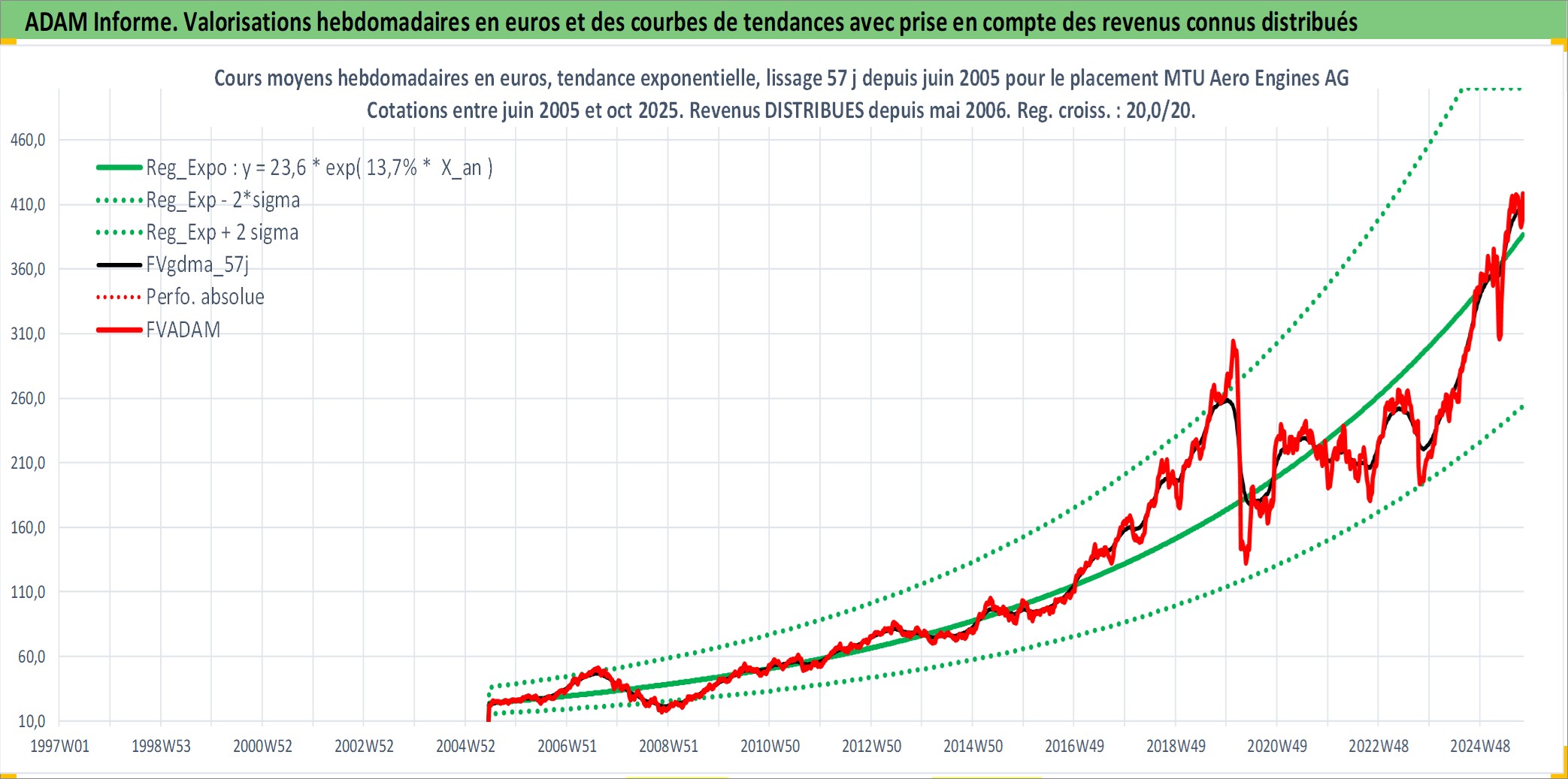 Site dédié aux investisseursPage dédiée sur site financeAnalyse des valorisations hebdomadaires de l'action MTU Aero Engines AG. Cet actif est cote en EUR. Les valorisations couvrent les semaines 2005W23 a 2025W40. Les revenus de cet actif financier sont pris en compte depuis la semaine 2006W20. La note globale ESG de cet actif est estimee a 6.0 (apres rebasage entre 0 et 20).