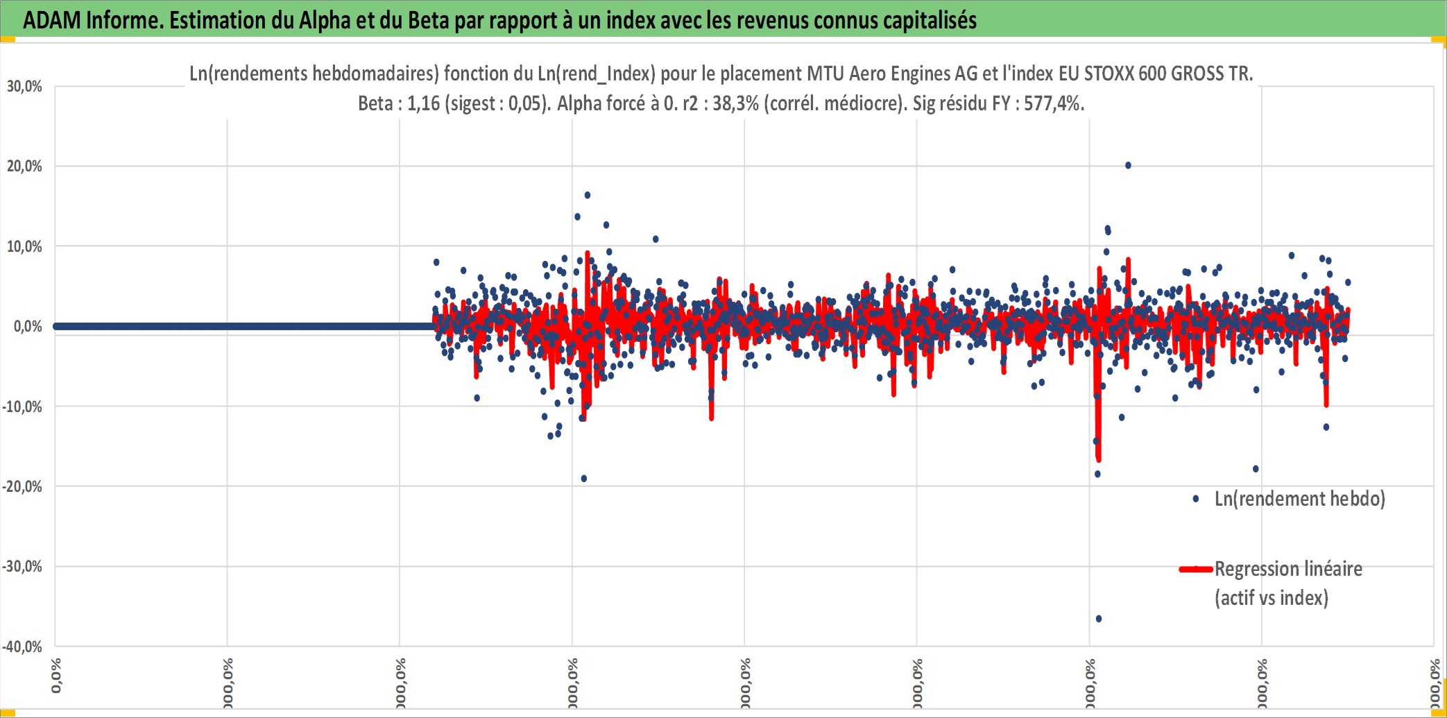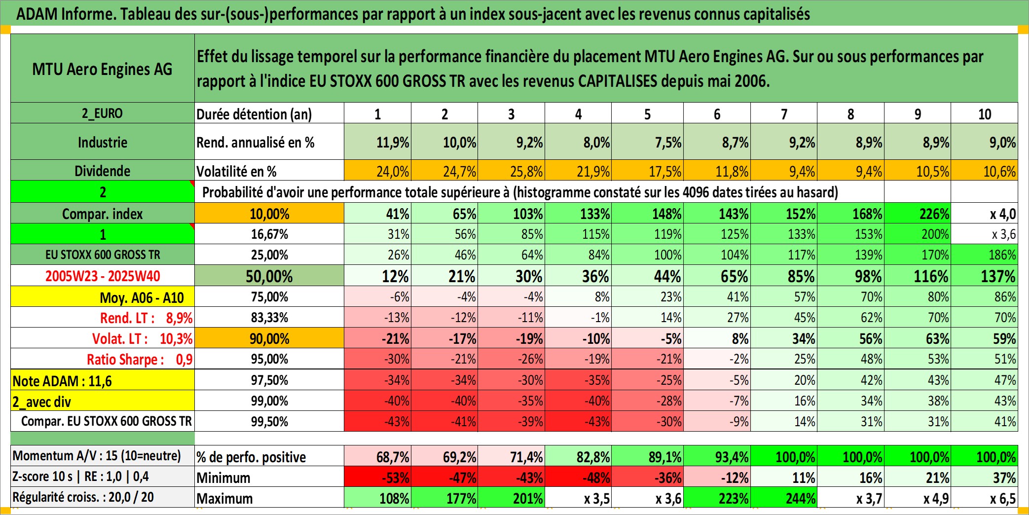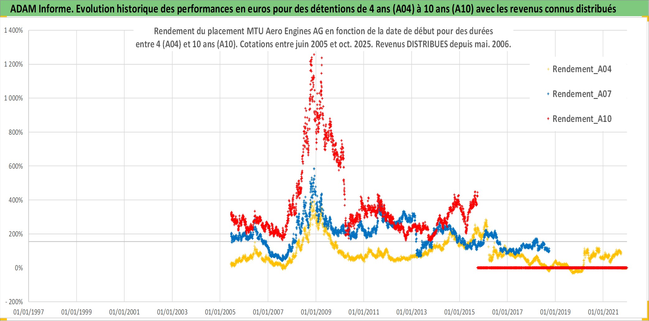 Site dédié aux investisseursPage dédiée sur site financeAnalyse des valorisations hebdomadaires de l'action MTU Aero Engines AG. Cet actif est cote en EUR. Les valorisations couvrent les semaines 2005W23 a 2025W40. Les revenus de cet actif financier sont pris en compte depuis la semaine 2006W20. La note globale ESG de cet actif est estimee a 6.0 (apres rebasage entre 0 et 20).