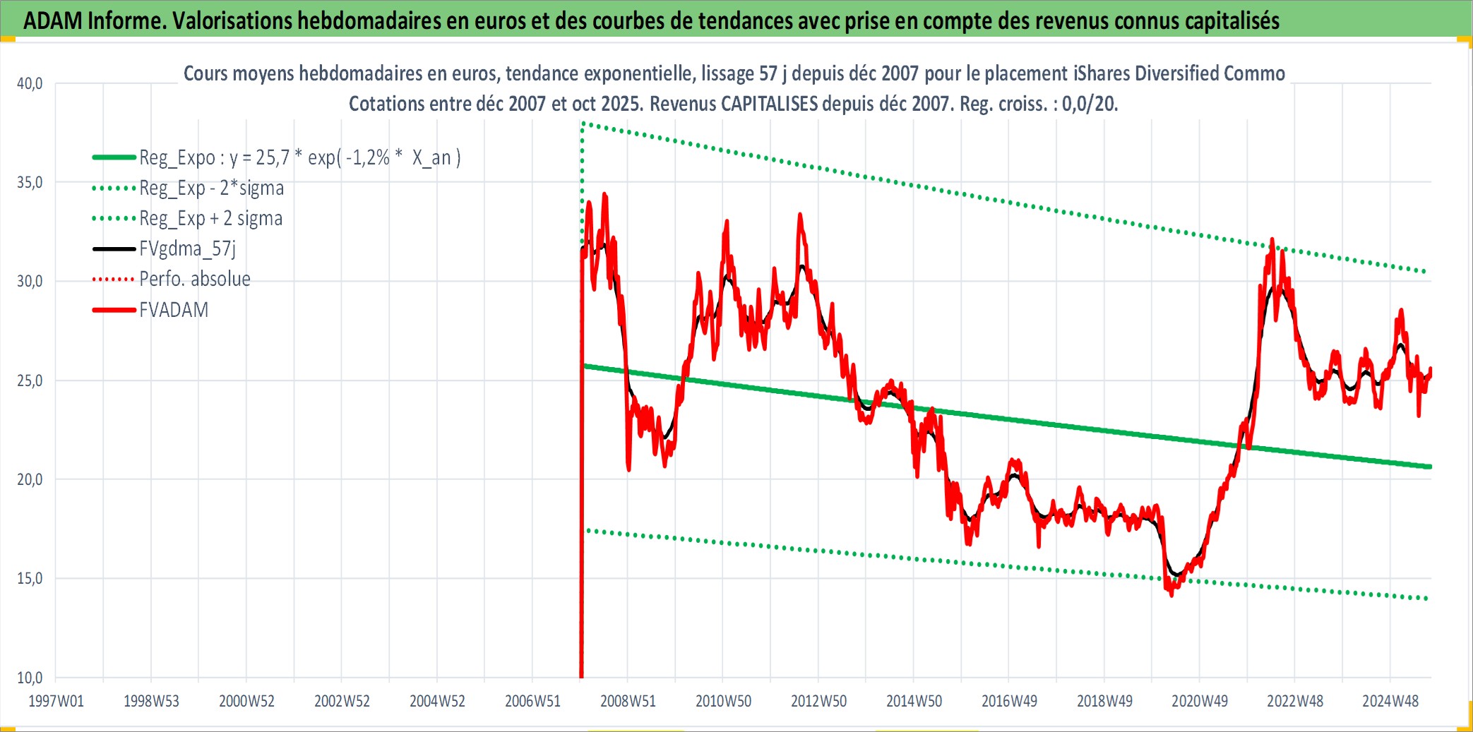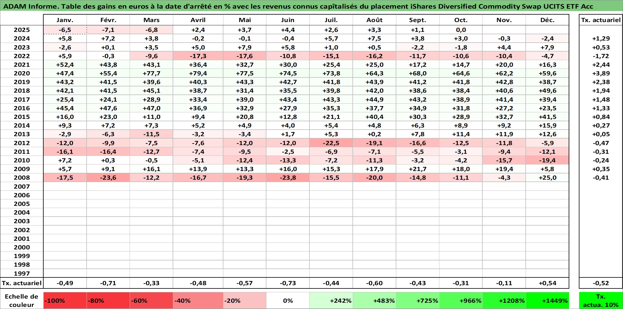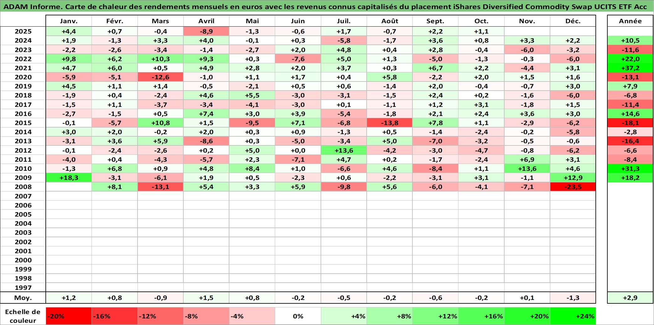 Site dédié aux investisseursPage dédiée sur site financeAnalyse des valorisations hebdomadaires du fonds iShares Diversified Commodity Swap UCITS ETF Acc. Cet actif est cote en USD. Les valorisations sont en contrevaleur EURO et couvrent les semaines 2008W01 a 2025W40. Les revenus de cet actif financier sont pris en compte depuis la semaine 2008W01. La note ESG de cet actif n'est pas connue.
