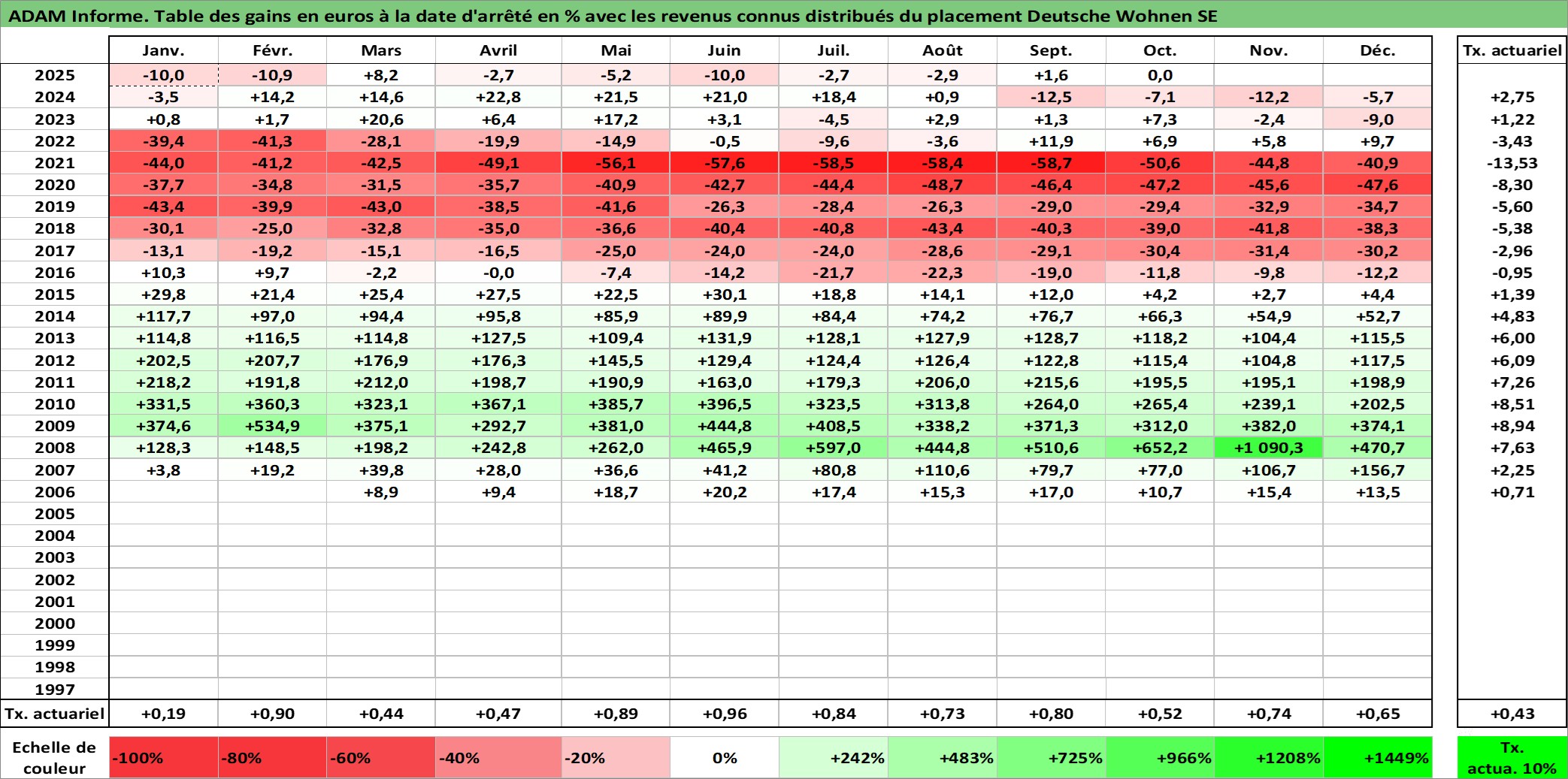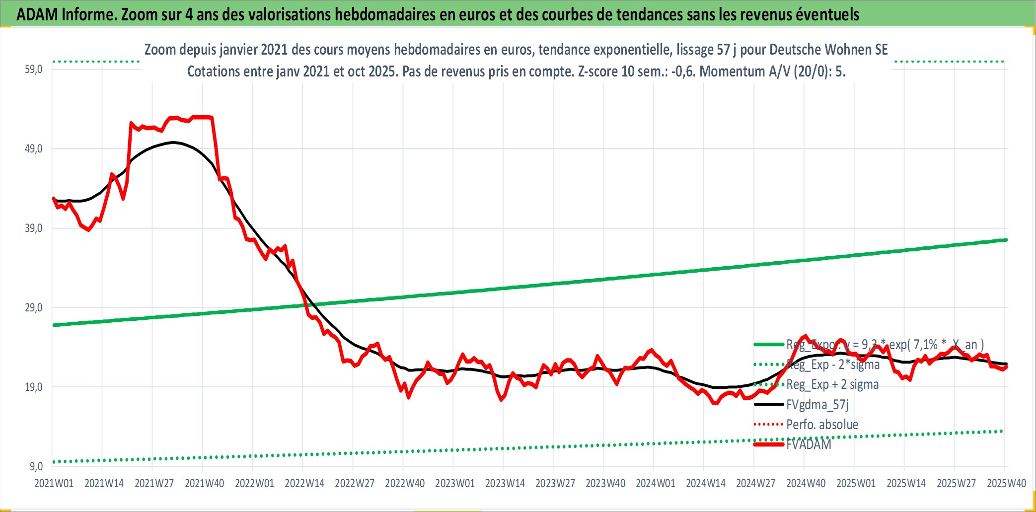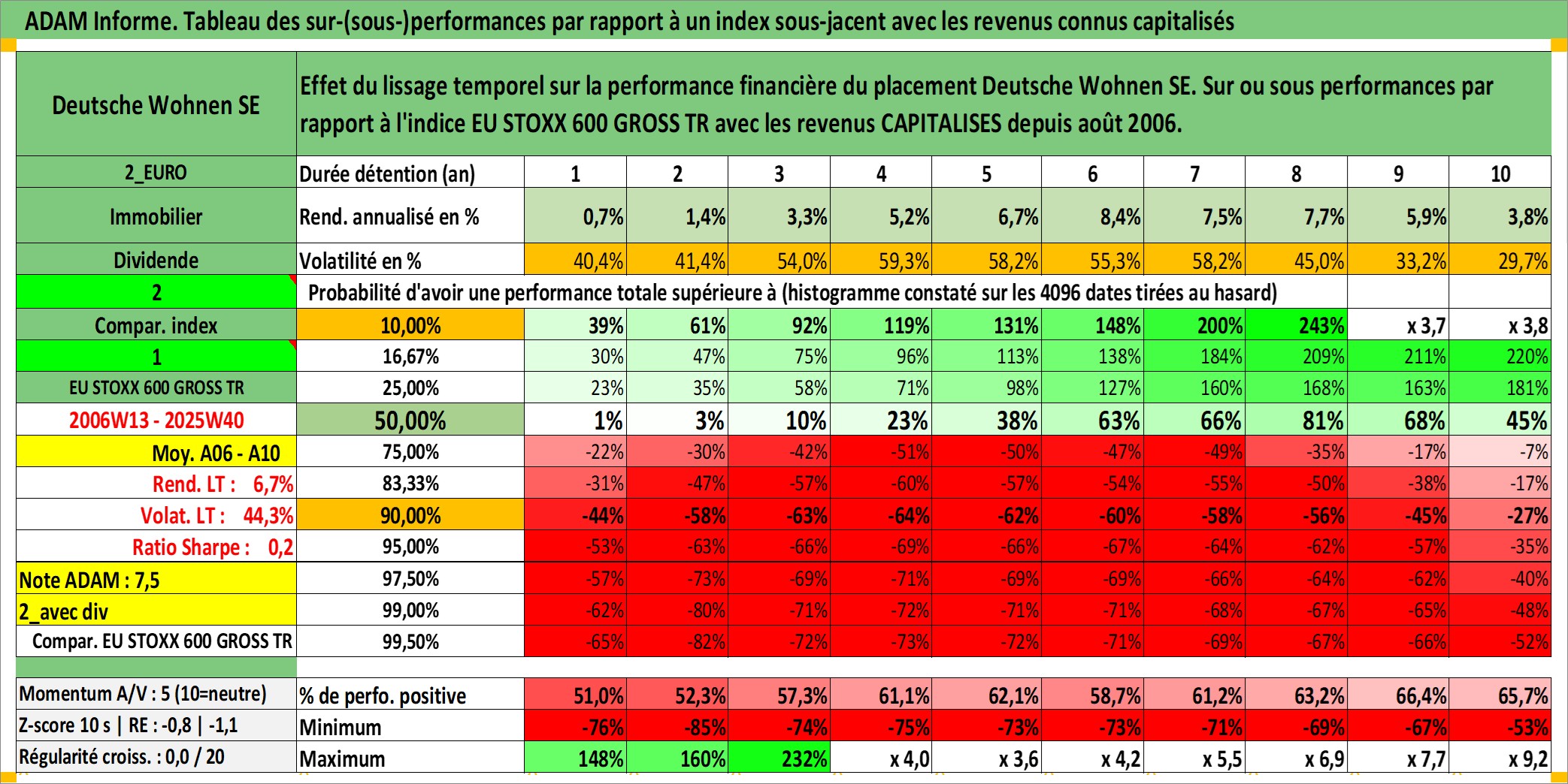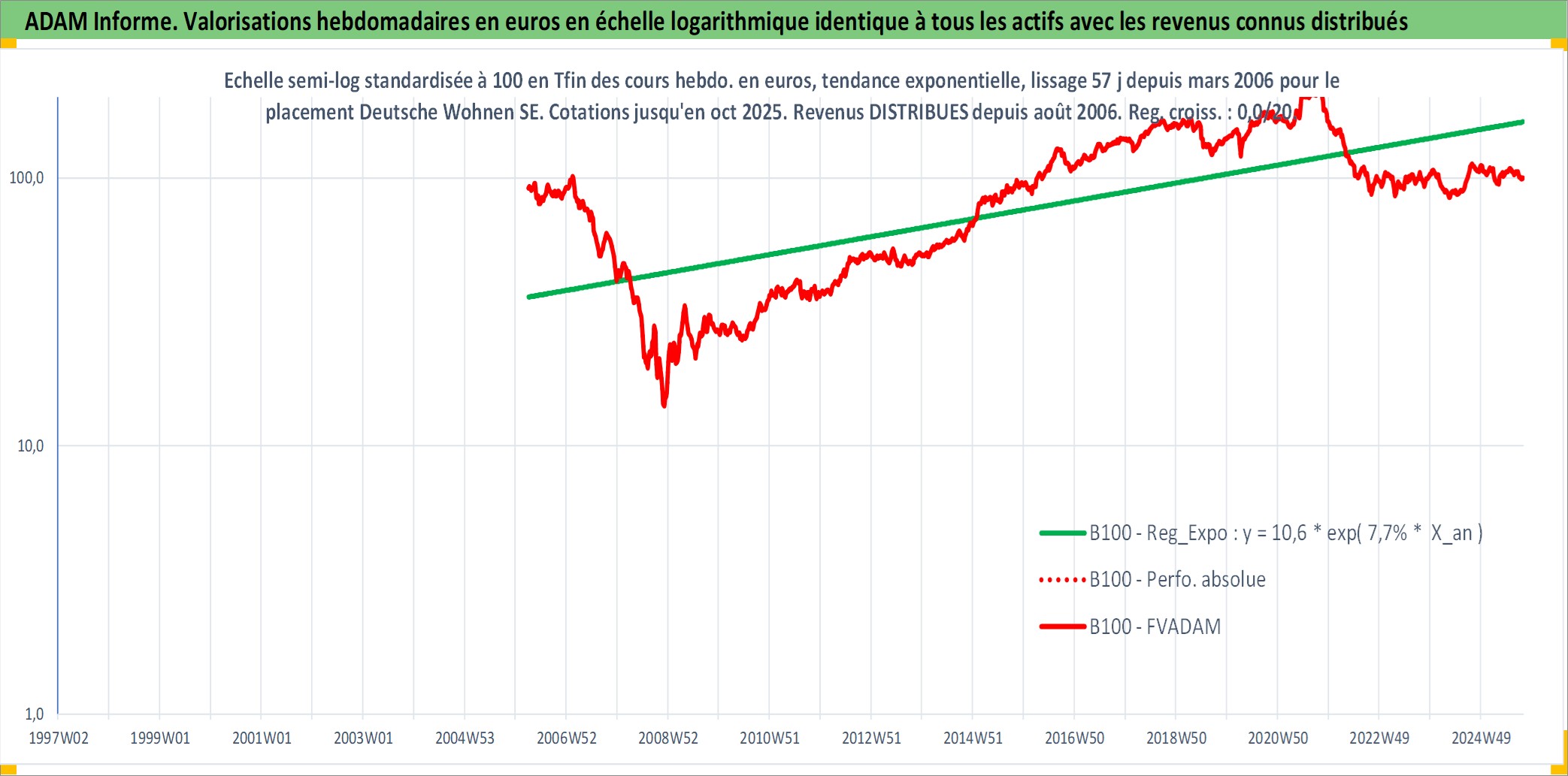 Site dédié aux investisseursPage dédiée sur site financeAnalyse des valorisations hebdomadaires de l'action Deutsche Wohnen SE. Cet actif est cote en EUR. Les valorisations couvrent les semaines 2006W13 a 2025W40. Les revenus de cet actif financier sont pris en compte depuis la semaine 2006W32. La note globale ESG de cet actif est estimee a 15.0 (apres rebasage entre 0 et 20).
