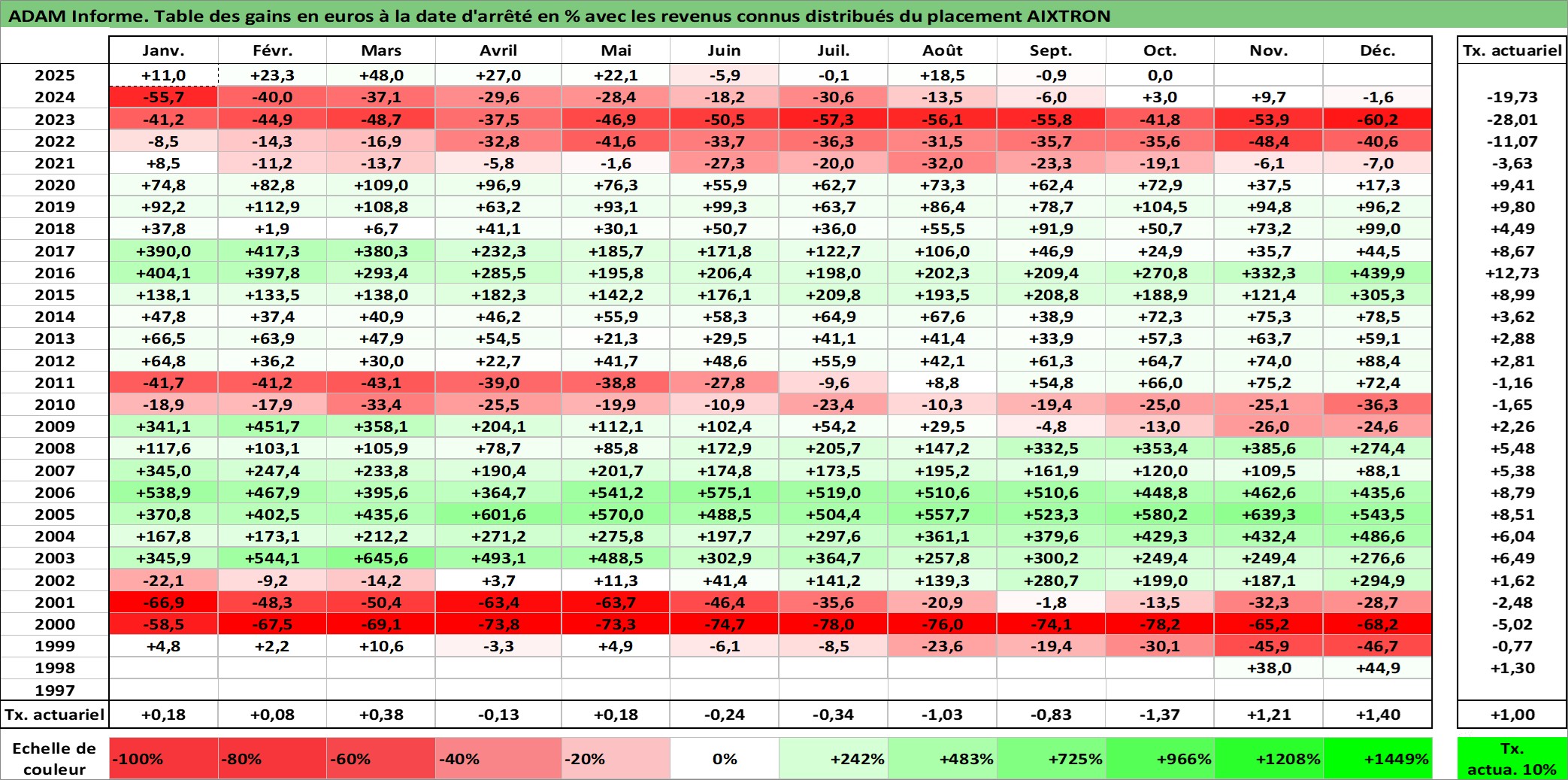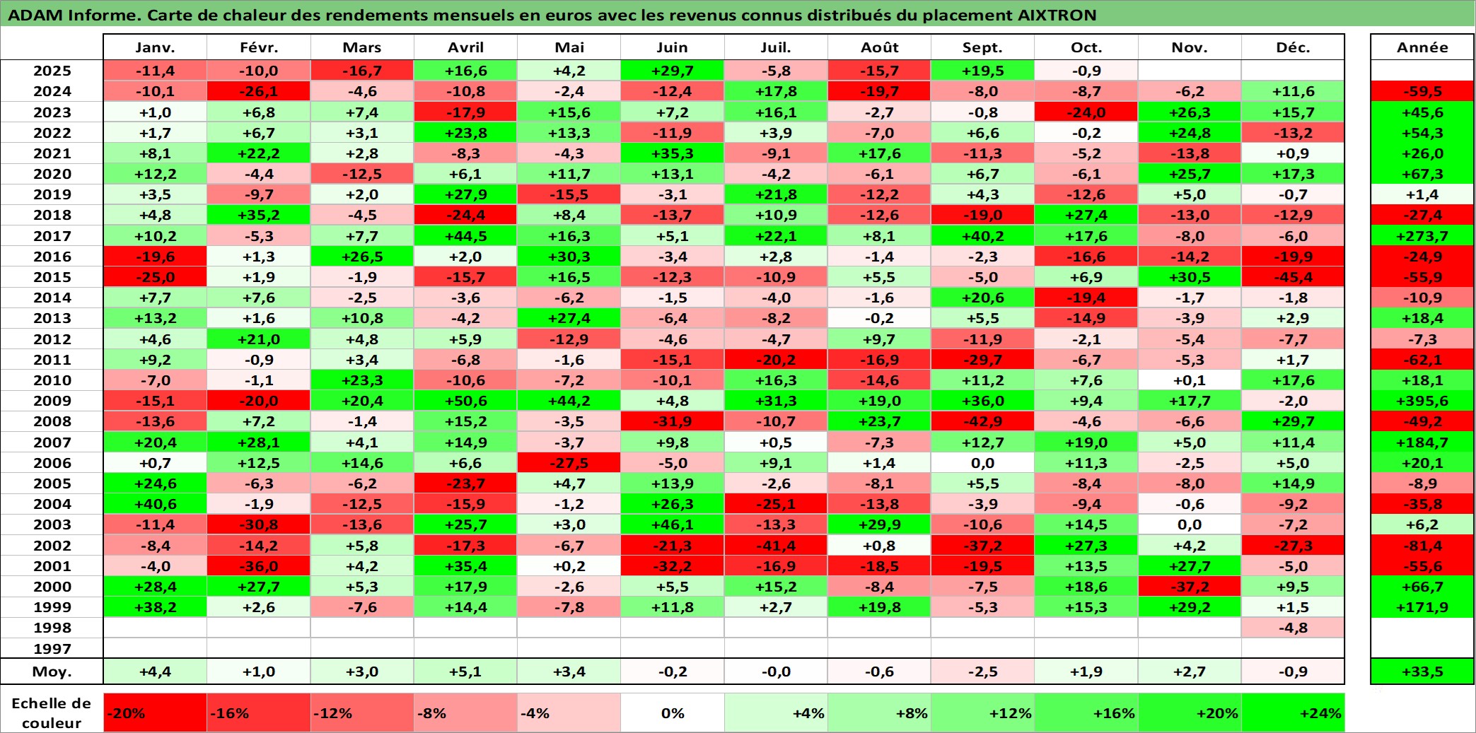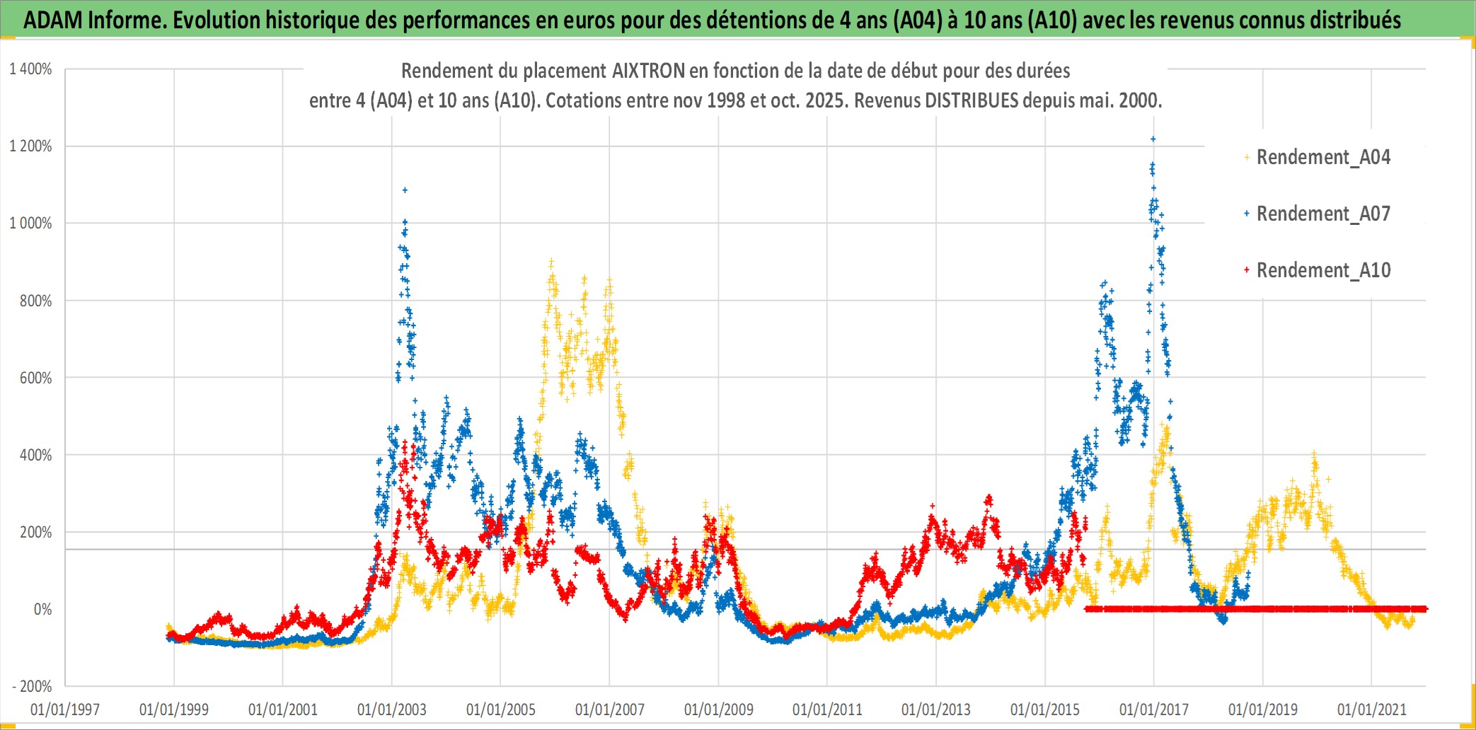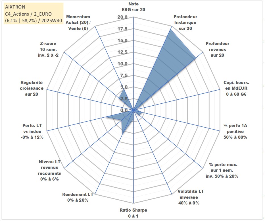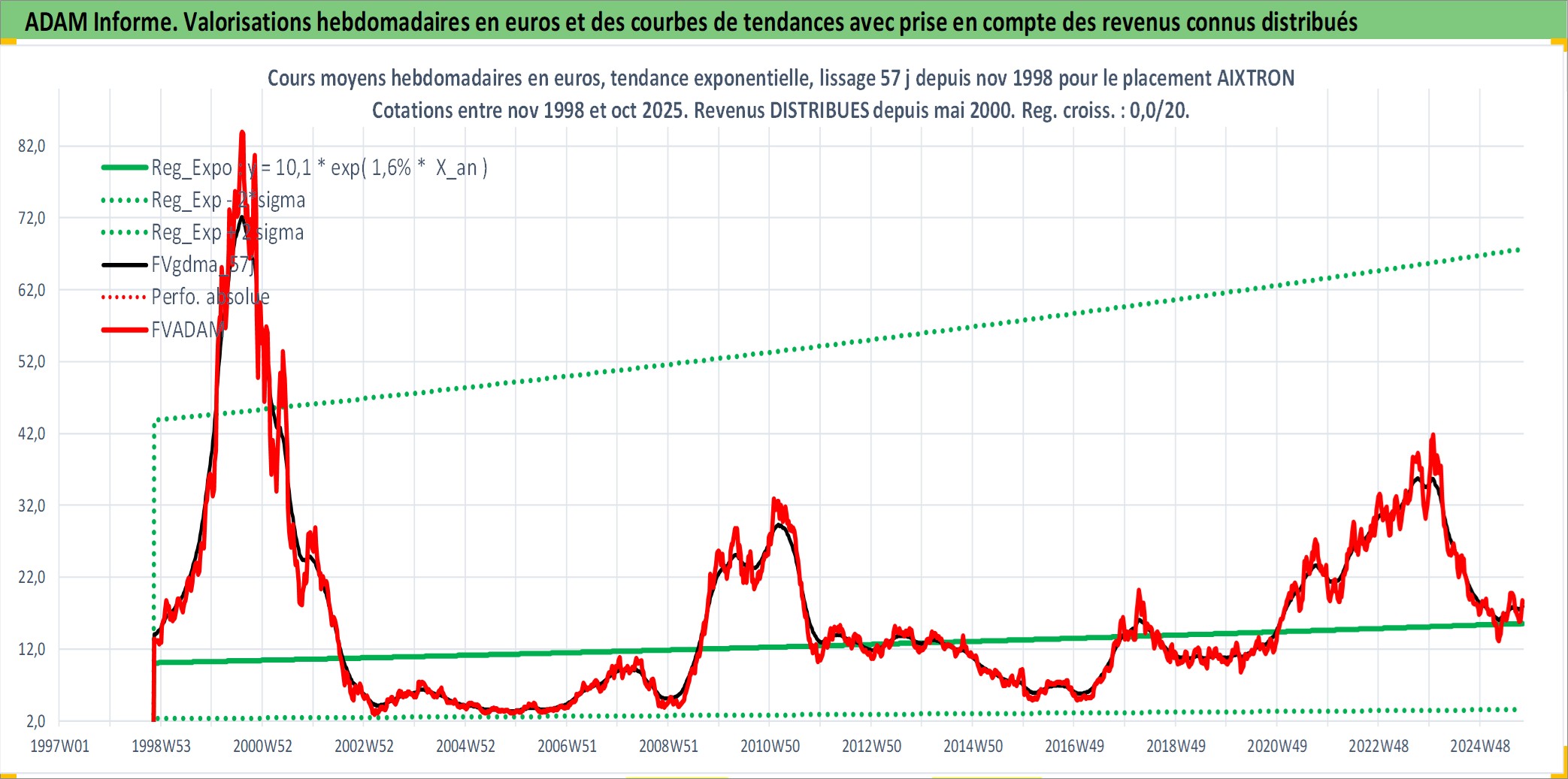 Site dédié aux investisseursPage dédiée sur site financeAnalyse des valorisations hebdomadaires de l'action AIXTRON. Cet actif est cote en EUR. Les valorisations couvrent les semaines 1998W46 a 2025W40. Les revenus de cet actif financier sont pris en compte depuis la semaine 2000W22. La note ESG de cet actif n'est pas connue.