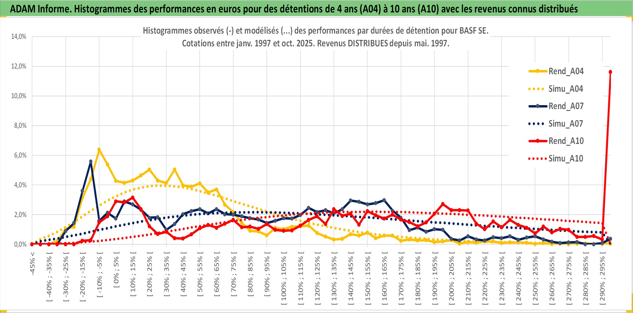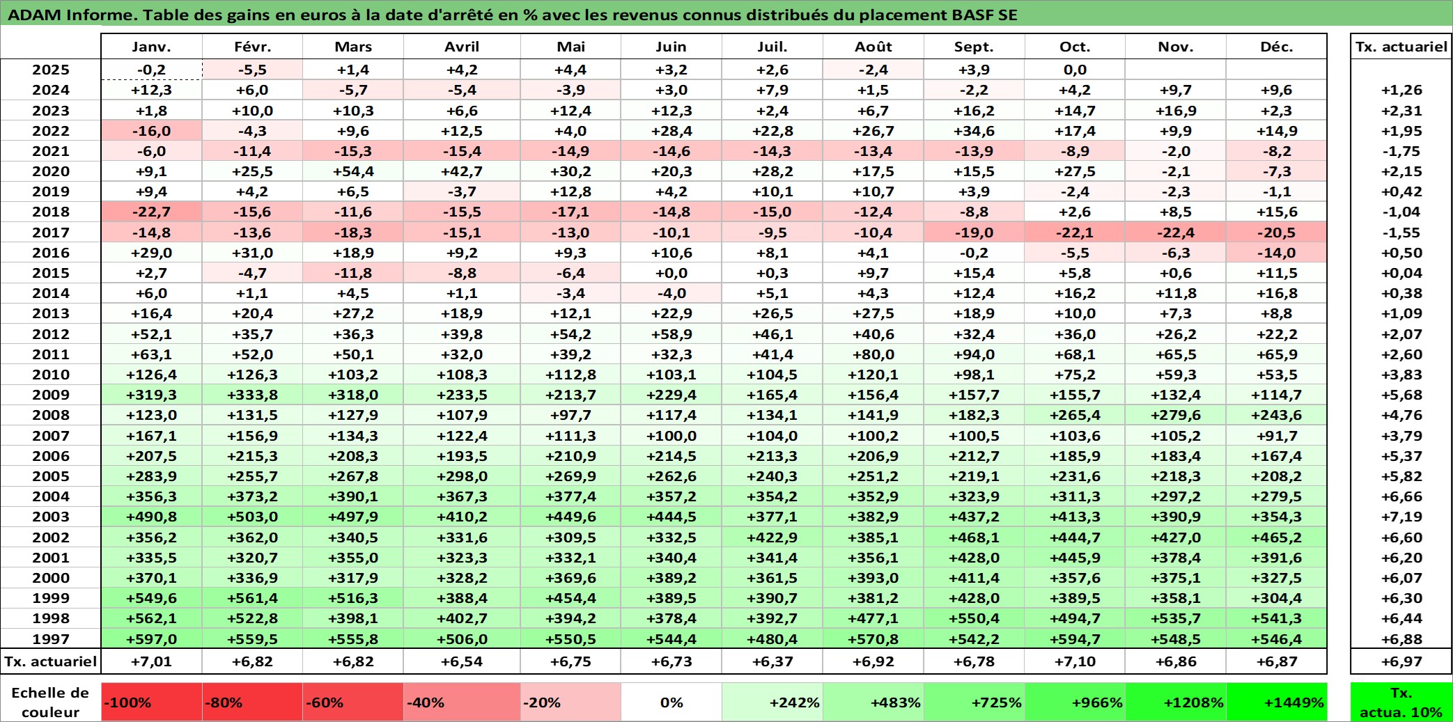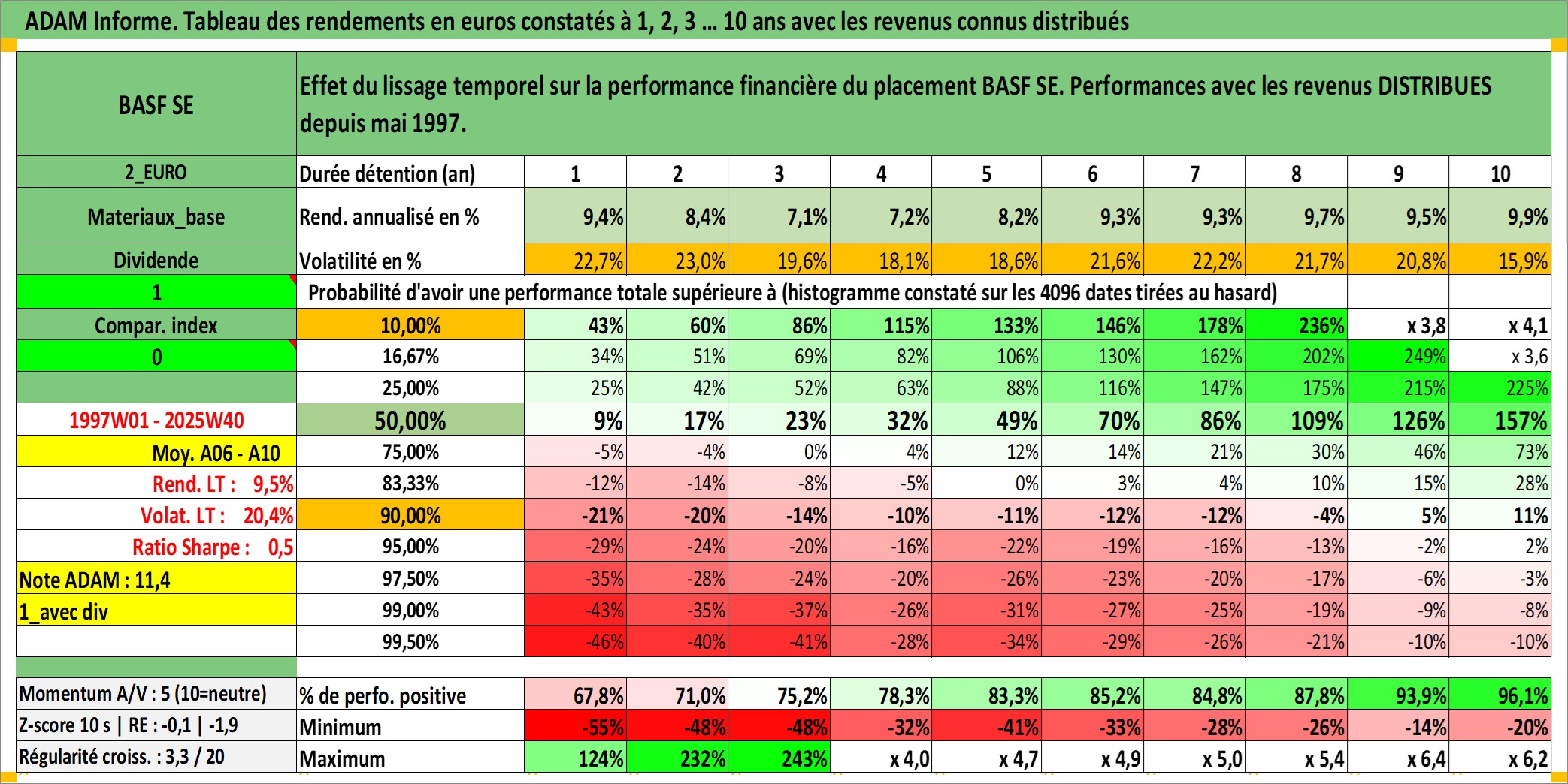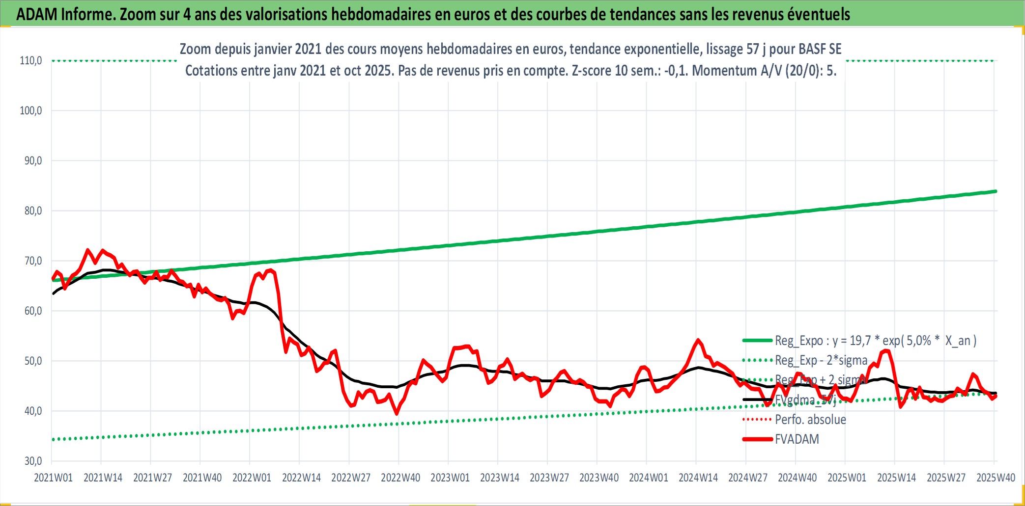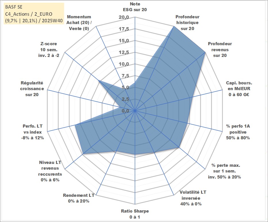 Site dédié aux investisseursPage dédiée sur site financeAnalyse des valorisations hebdomadaires de l'action BASF SE. Cet actif est cote en EUR. Les valorisations couvrent les semaines 1997W01 a 2025W40. Les revenus de cet actif financier sont pris en compte depuis la semaine 1997W20. La note globale ESG de cet actif est estimee a 6.0 (apres rebasage entre 0 et 20).