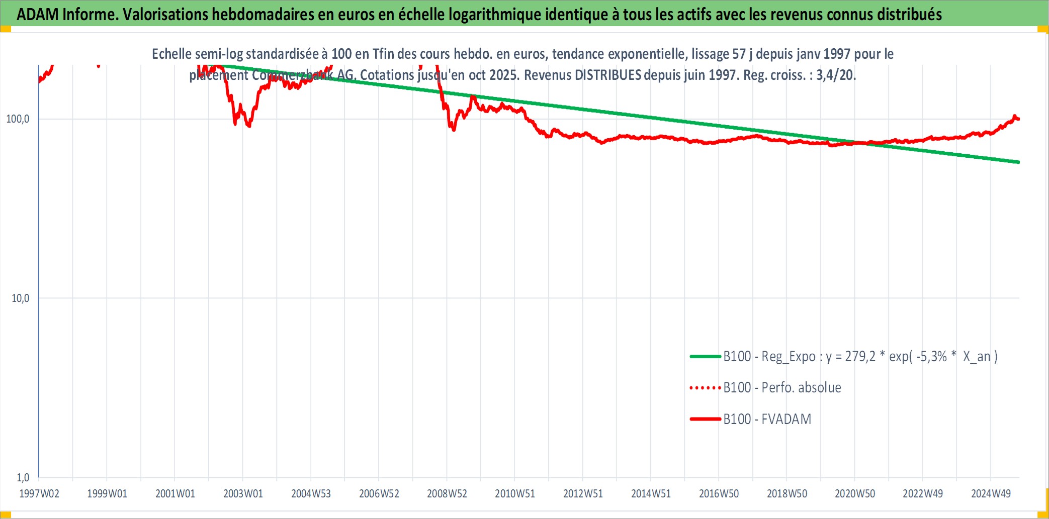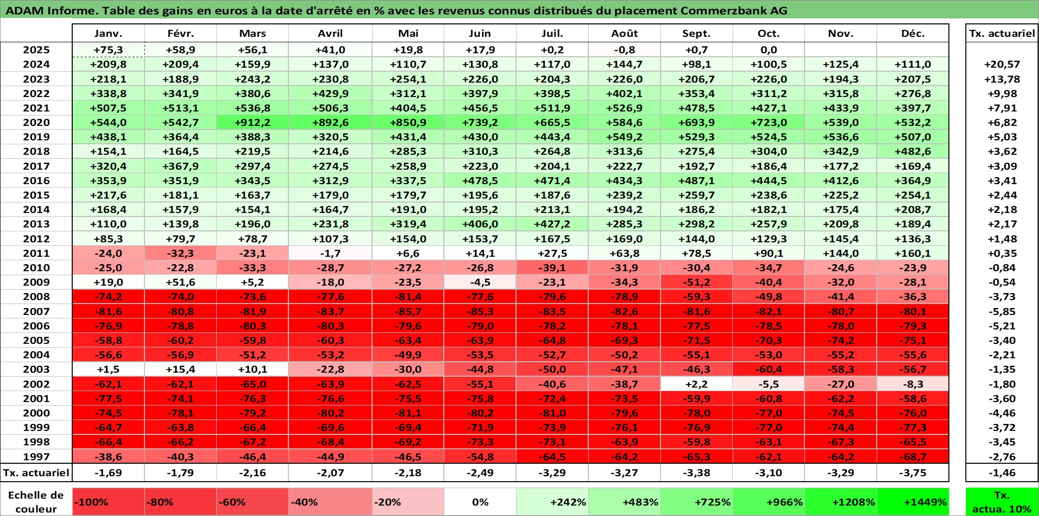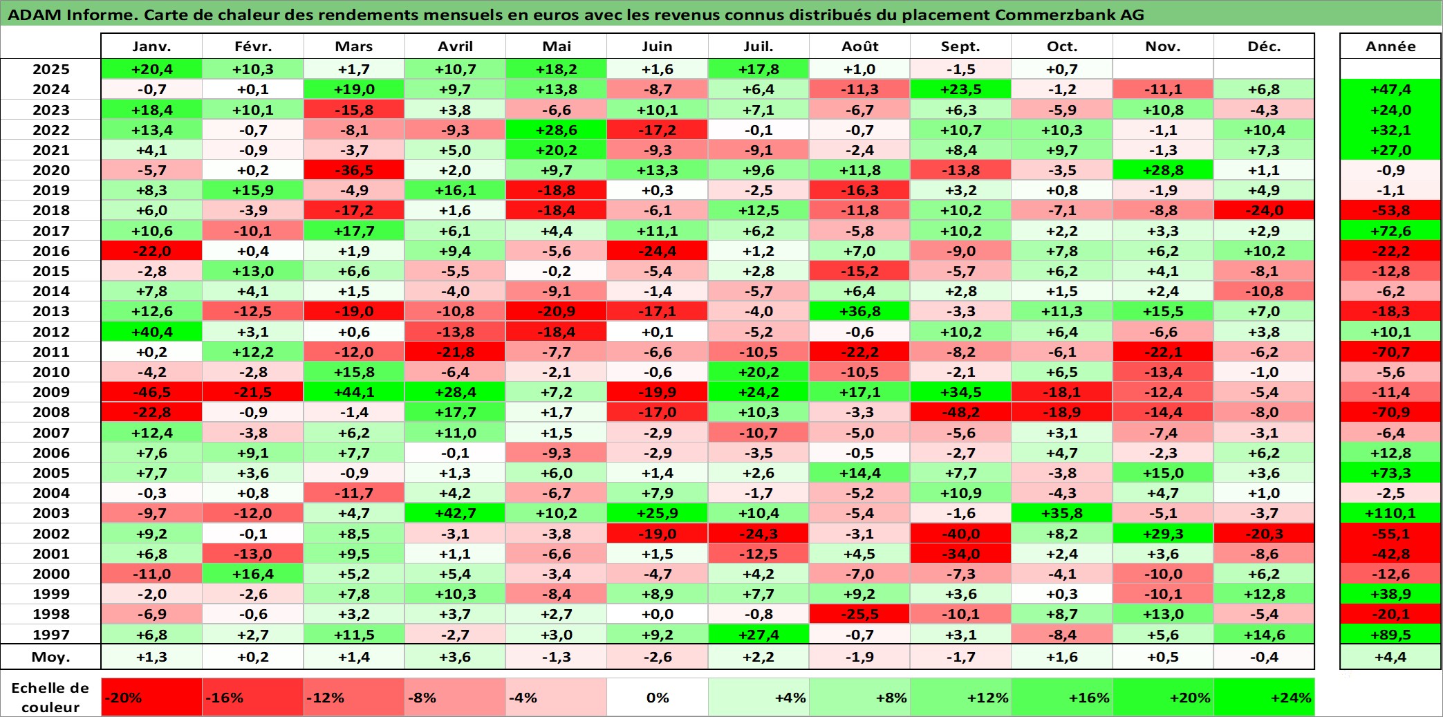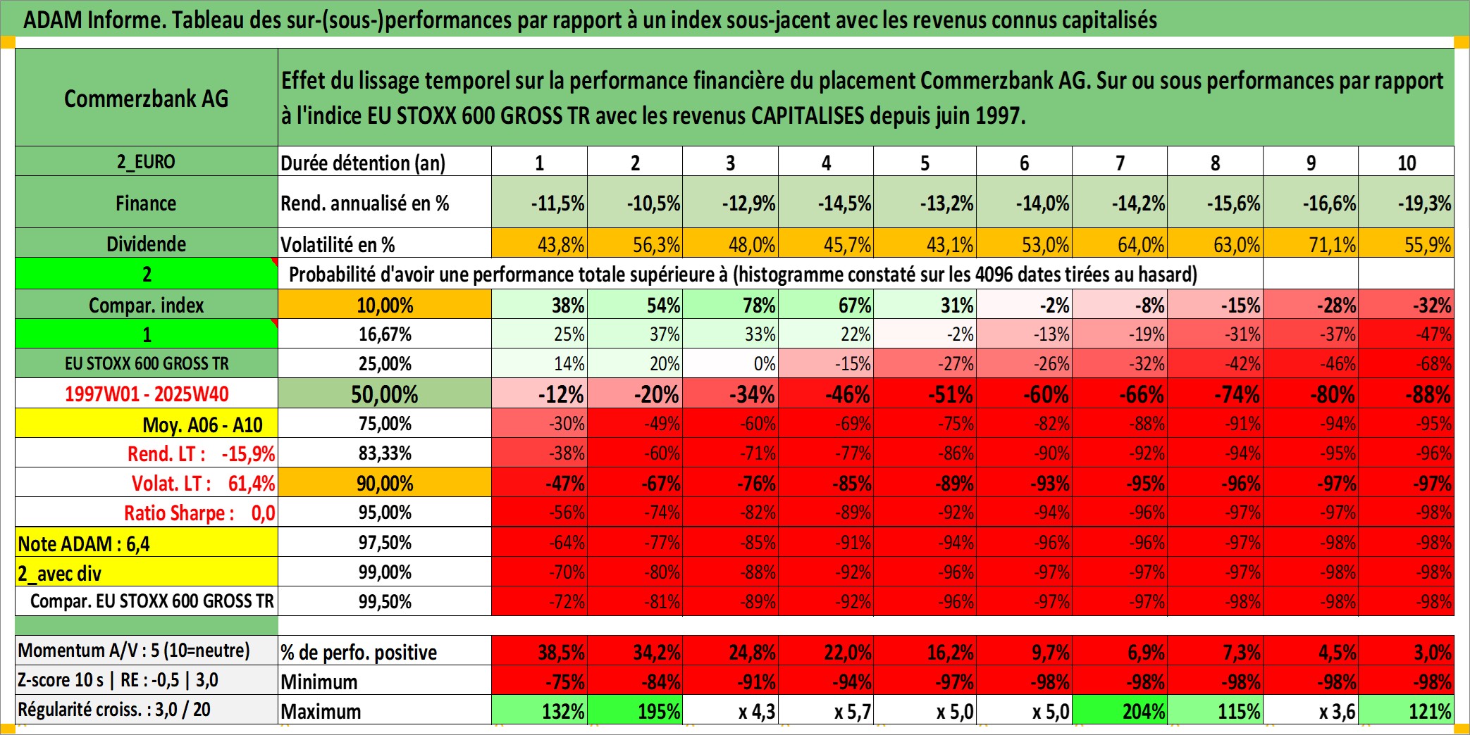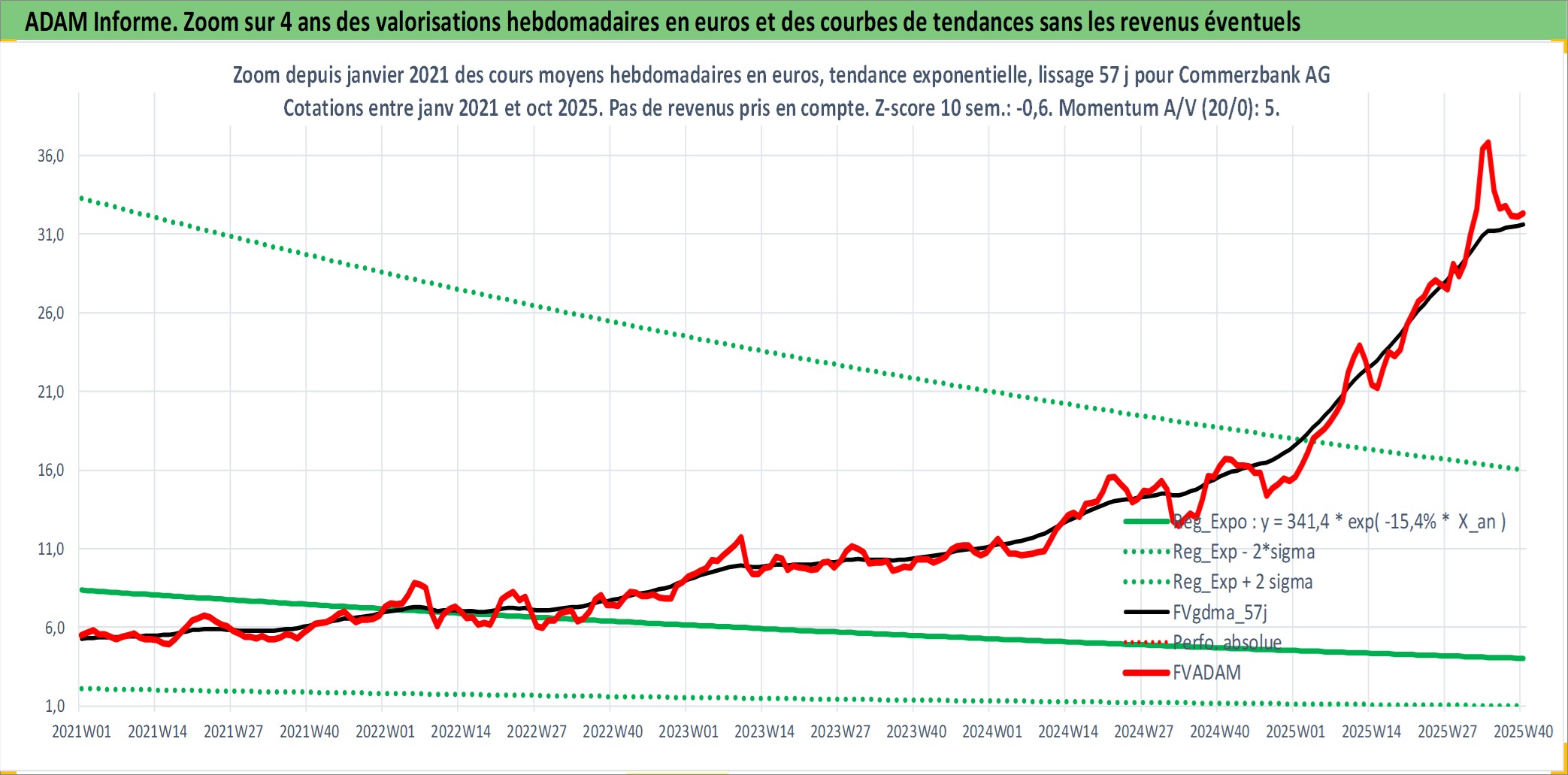 Site dédié aux investisseursPage dédiée sur site financeAnalyse des valorisations hebdomadaires de l'action Commerzbank AG. Cet actif est cote en EUR. Les valorisations couvrent les semaines 1997W01 a 2025W40. Les revenus de cet actif financier sont pris en compte depuis la semaine 1997W23. La note globale ESG de cet actif est estimee a 10.0 (apres rebasage entre 0 et 20).