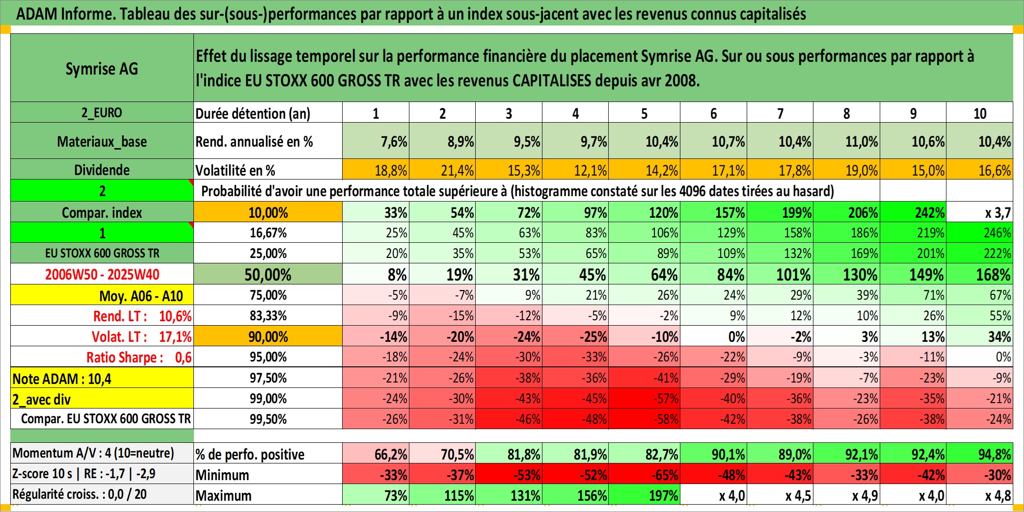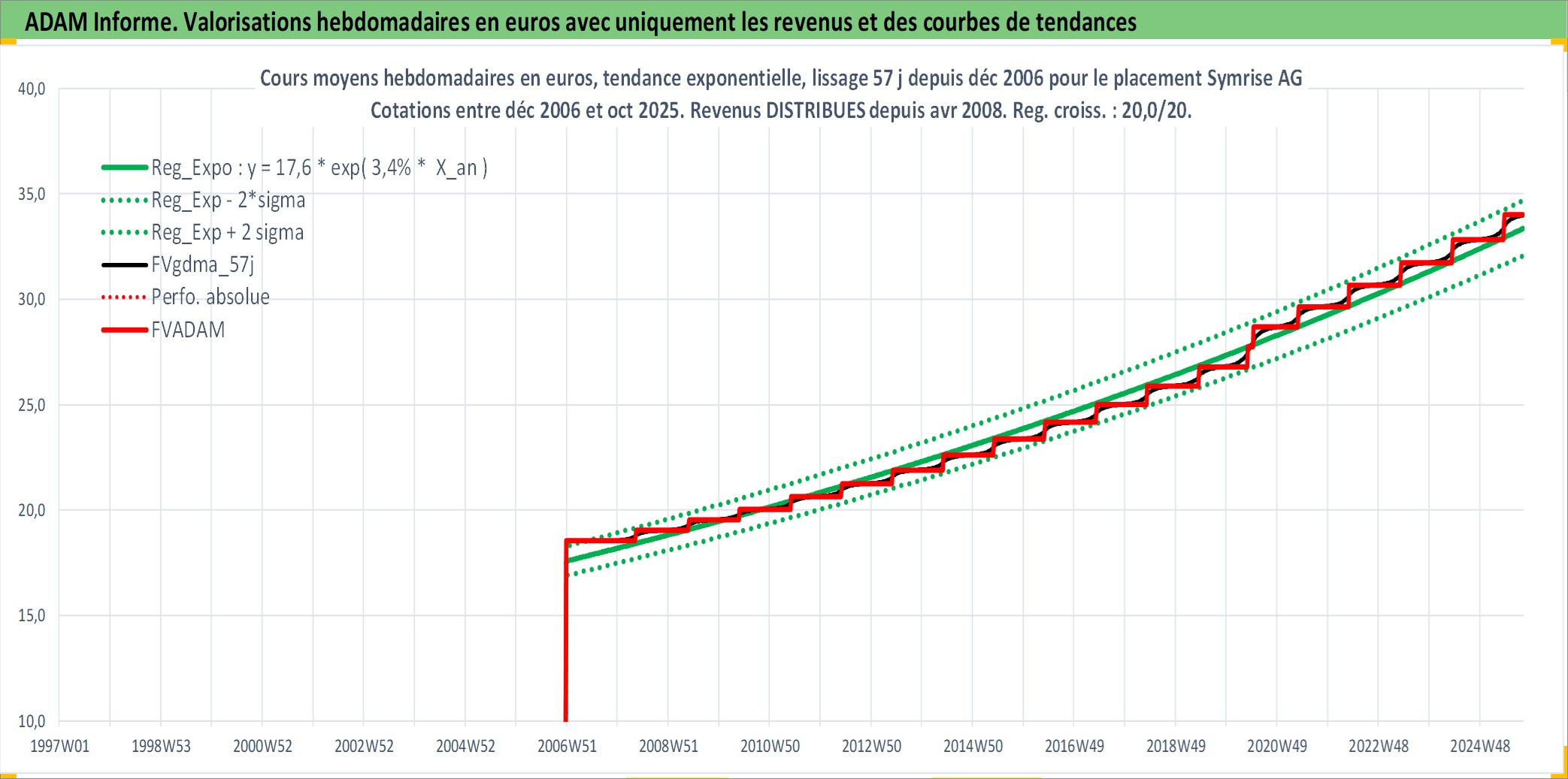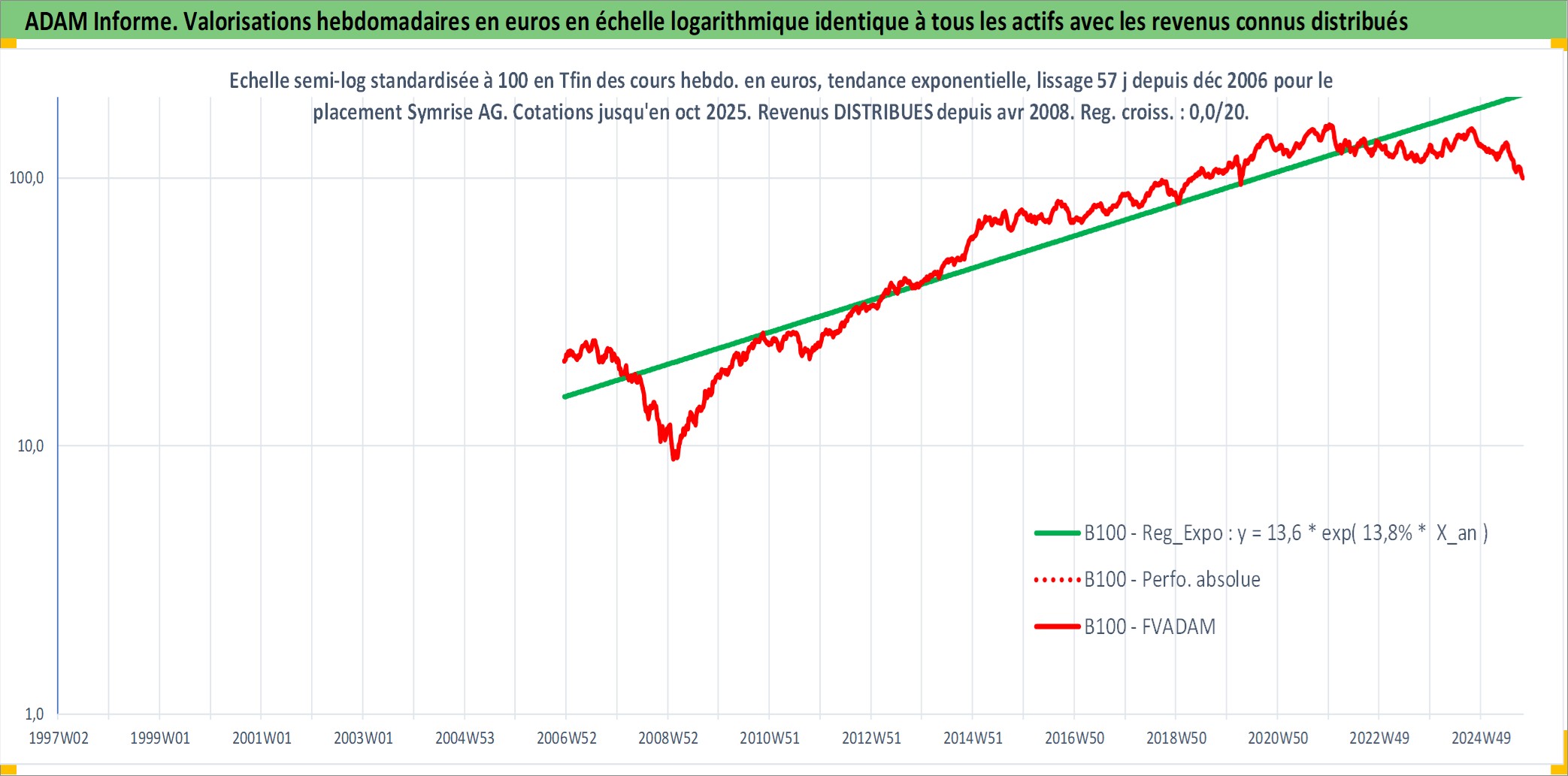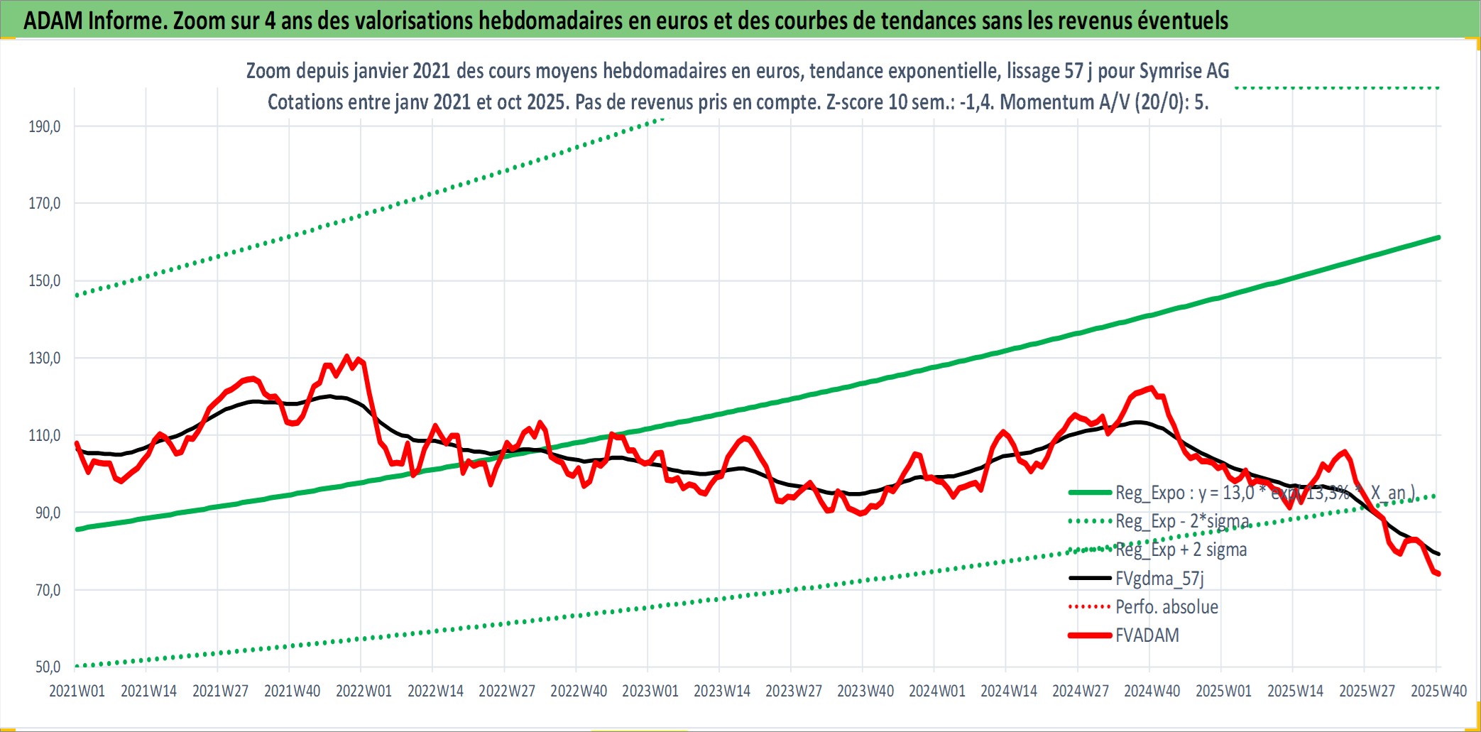 Site dédié aux investisseursPage dédiée sur site financeAnalyse des valorisations hebdomadaires de l'action Symrise AG. Cet actif est cote en EUR. Les valorisations couvrent les semaines 2006W50 a 2025W40. Les revenus de cet actif financier sont pris en compte depuis la semaine 2008W18. La note globale ESG de cet actif est estimee a 10.0 (apres rebasage entre 0 et 20).