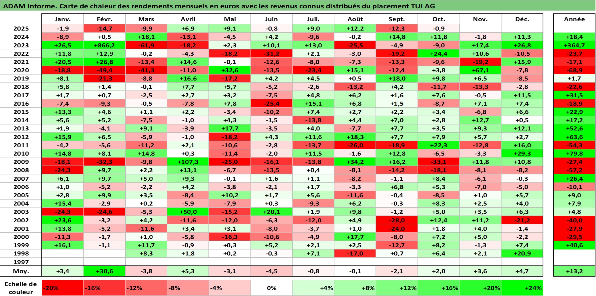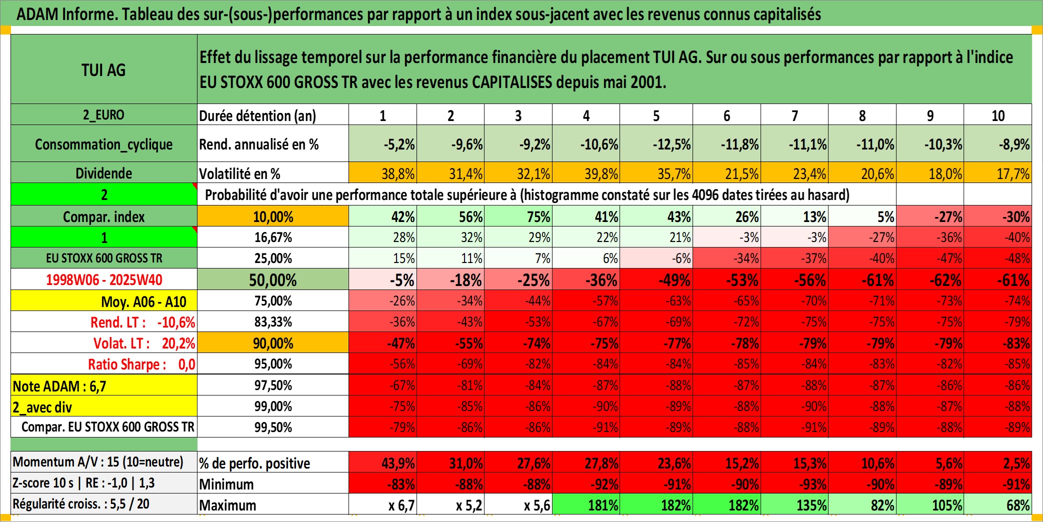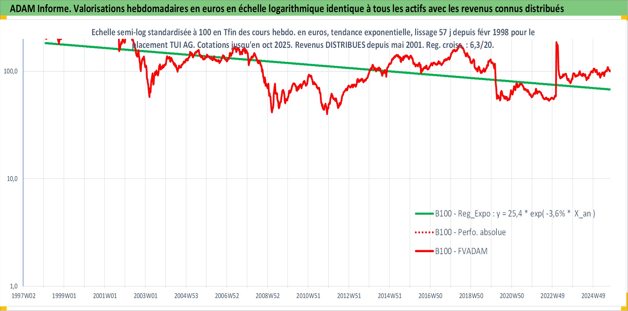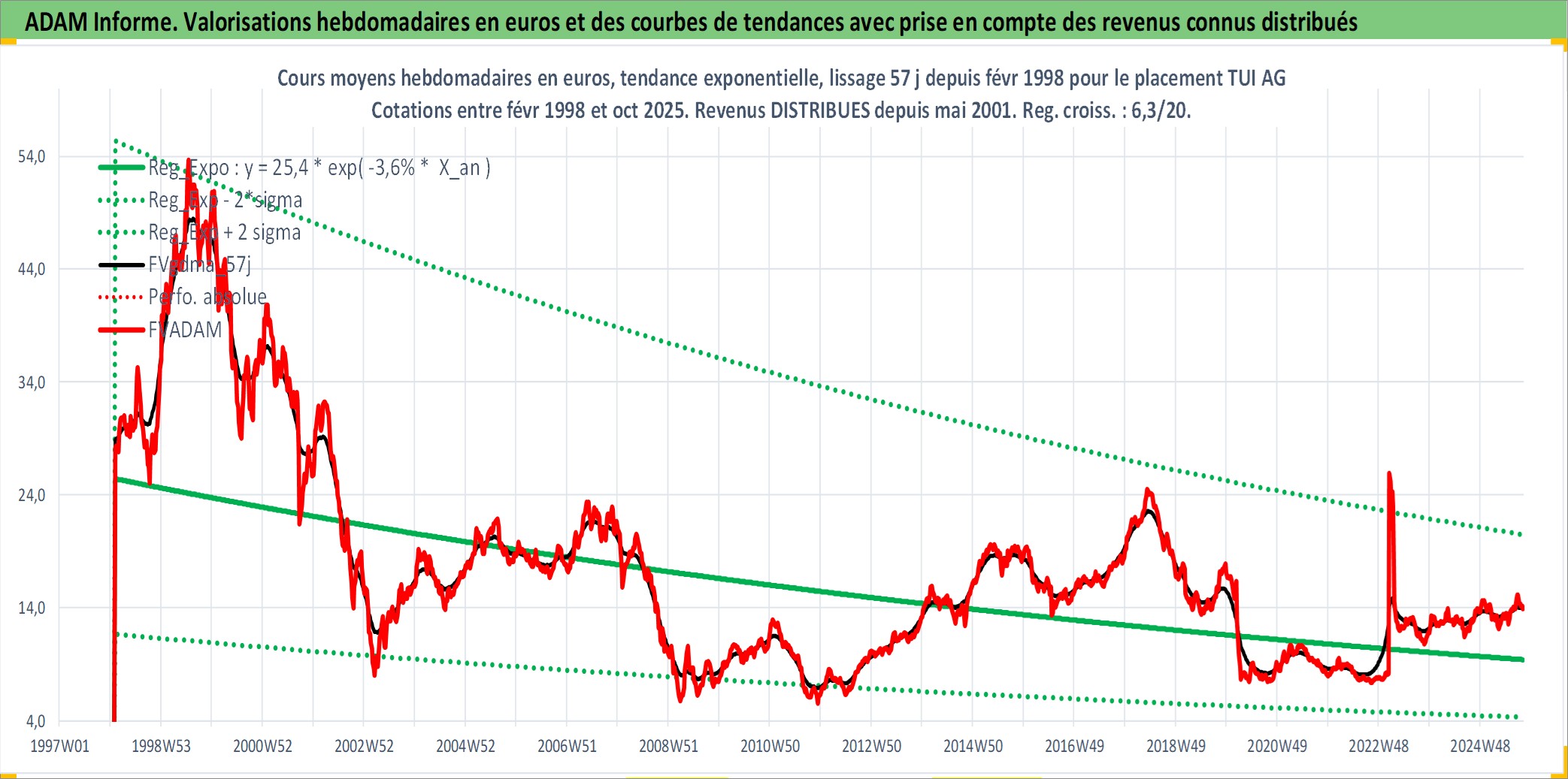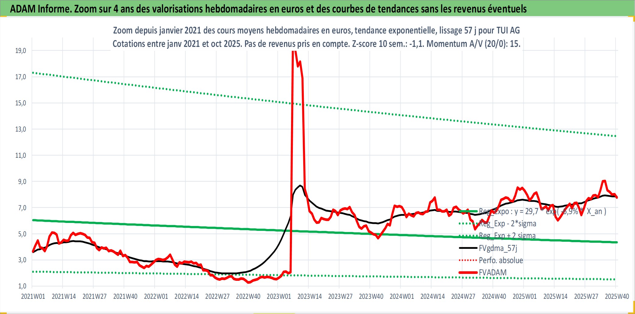 Site dédié aux investisseursPage dédiée sur site financeAnalyse des valorisations hebdomadaires de l'action TUI AG. Cet actif est cote en EUR. Les valorisations couvrent les semaines 1998W06 a 2025W40. Les revenus de cet actif financier sont pris en compte depuis la semaine 2001W21. La note globale ESG de cet actif est estimee a 6.0 (apres rebasage entre 0 et 20).
