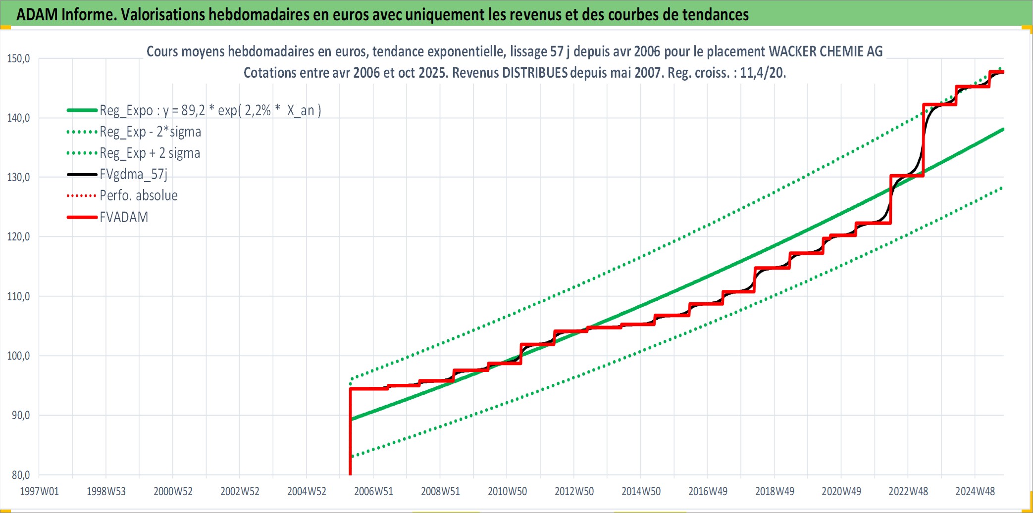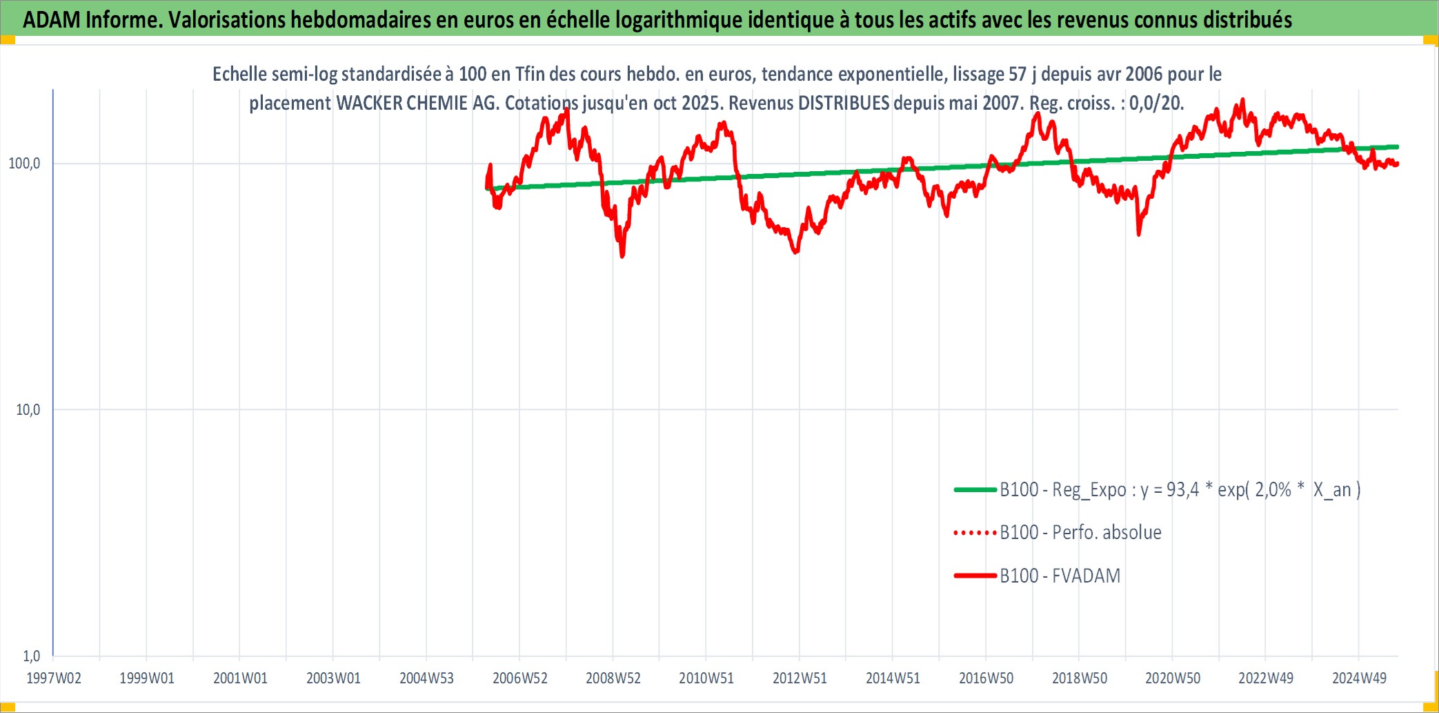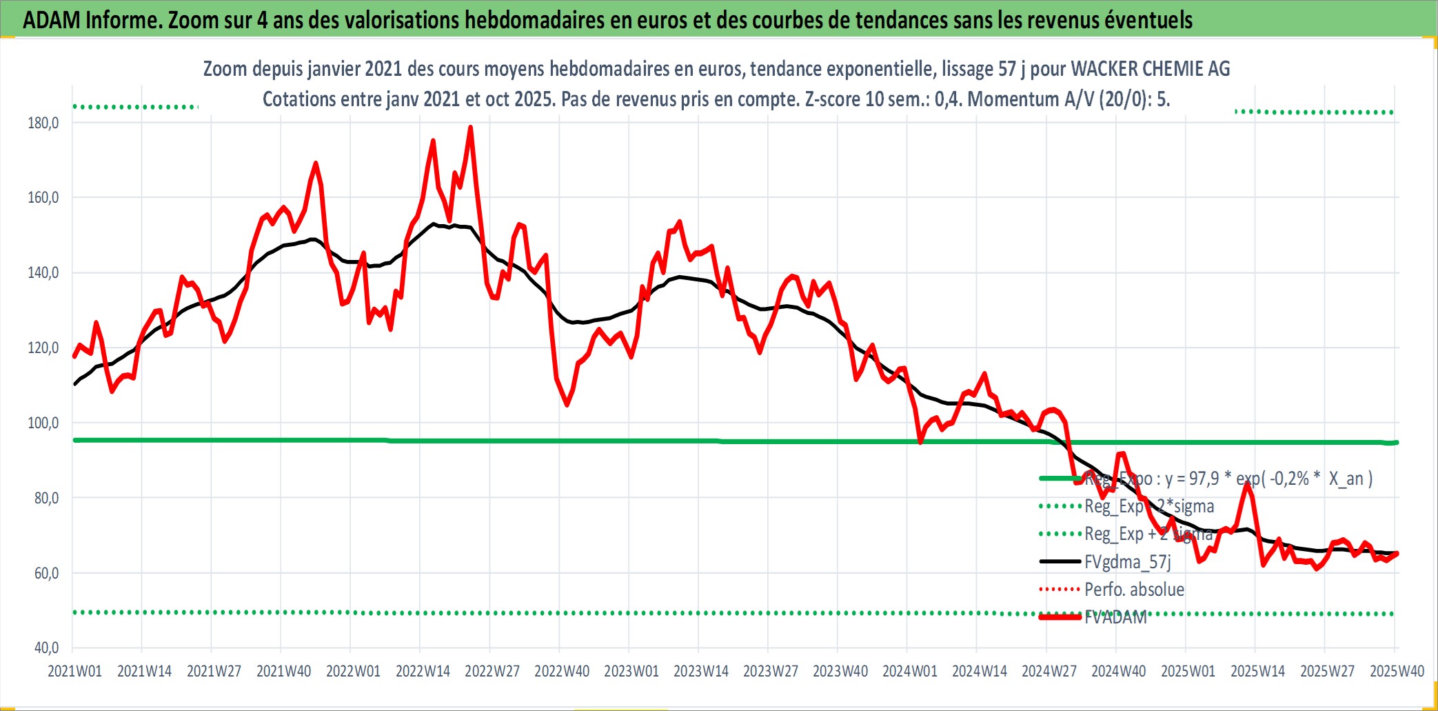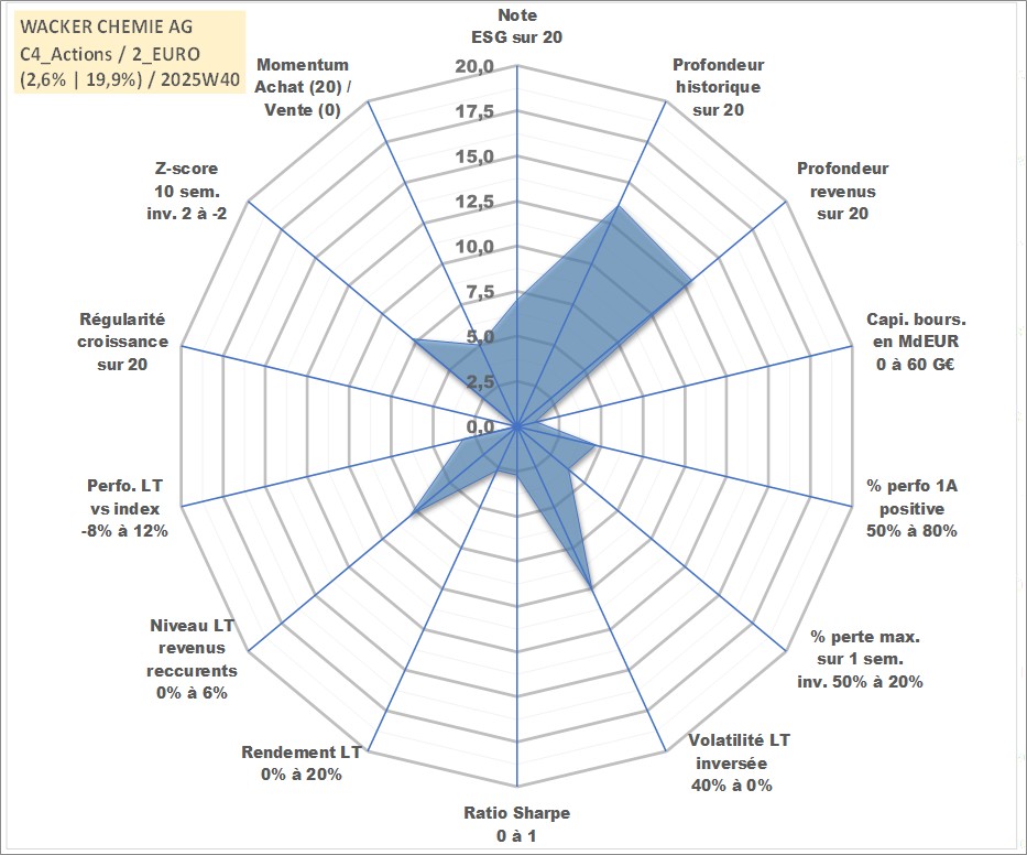 Site dédié aux investisseursPage dédiée sur site financeAnalyse des valorisations hebdomadaires de l'action WACKER CHEMIE AG. Cet actif est cote en EUR. Les valorisations couvrent les semaines 2006W15 a 2025W40. Les revenus de cet actif financier sont pris en compte depuis la semaine 2007W22. La note globale ESG de cet actif est estimee a 7.0 (apres rebasage entre 0 et 20).