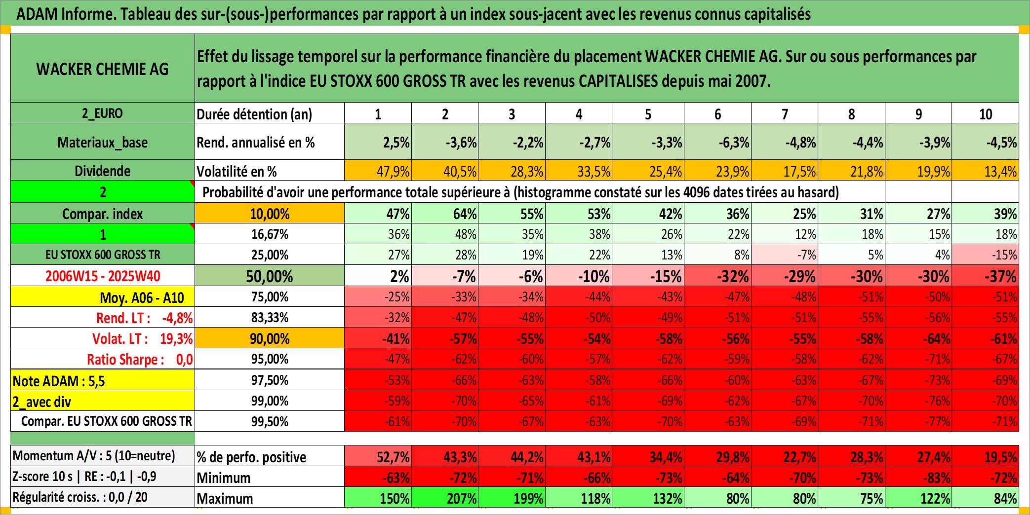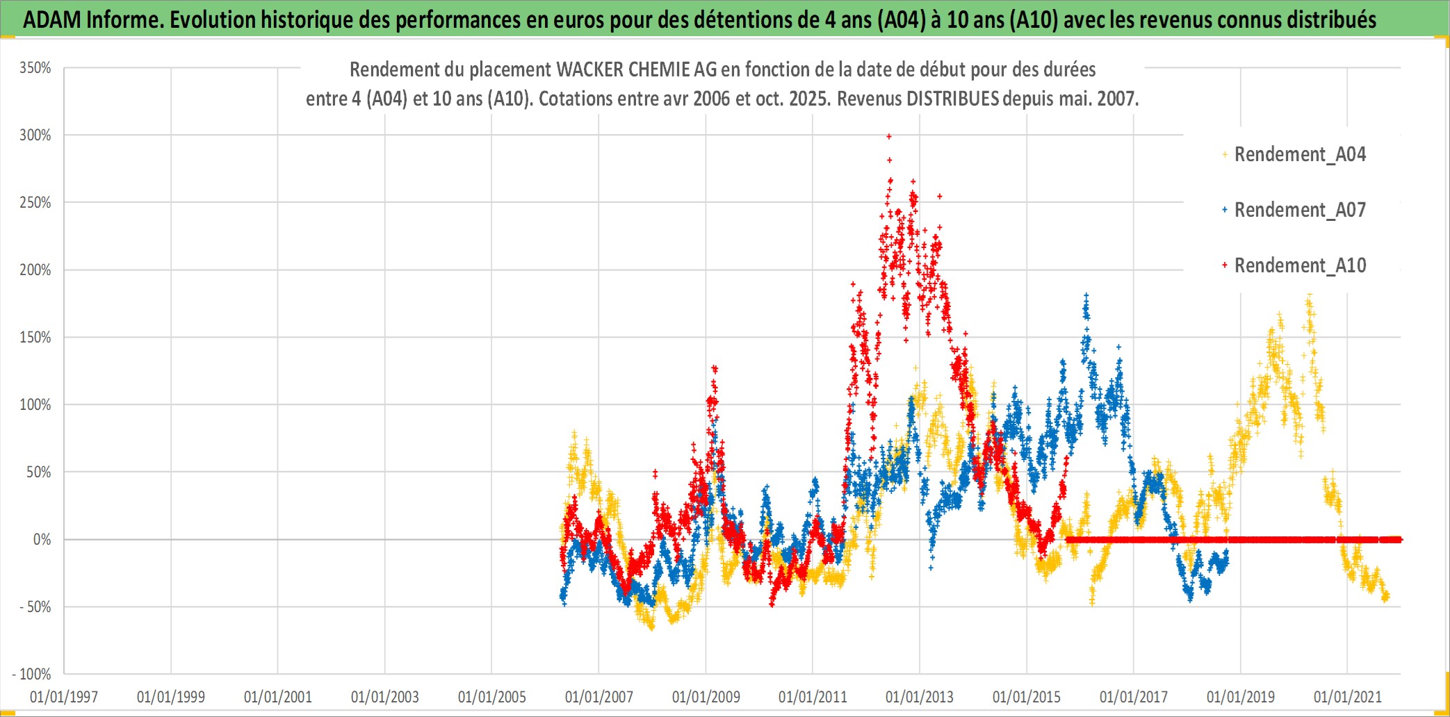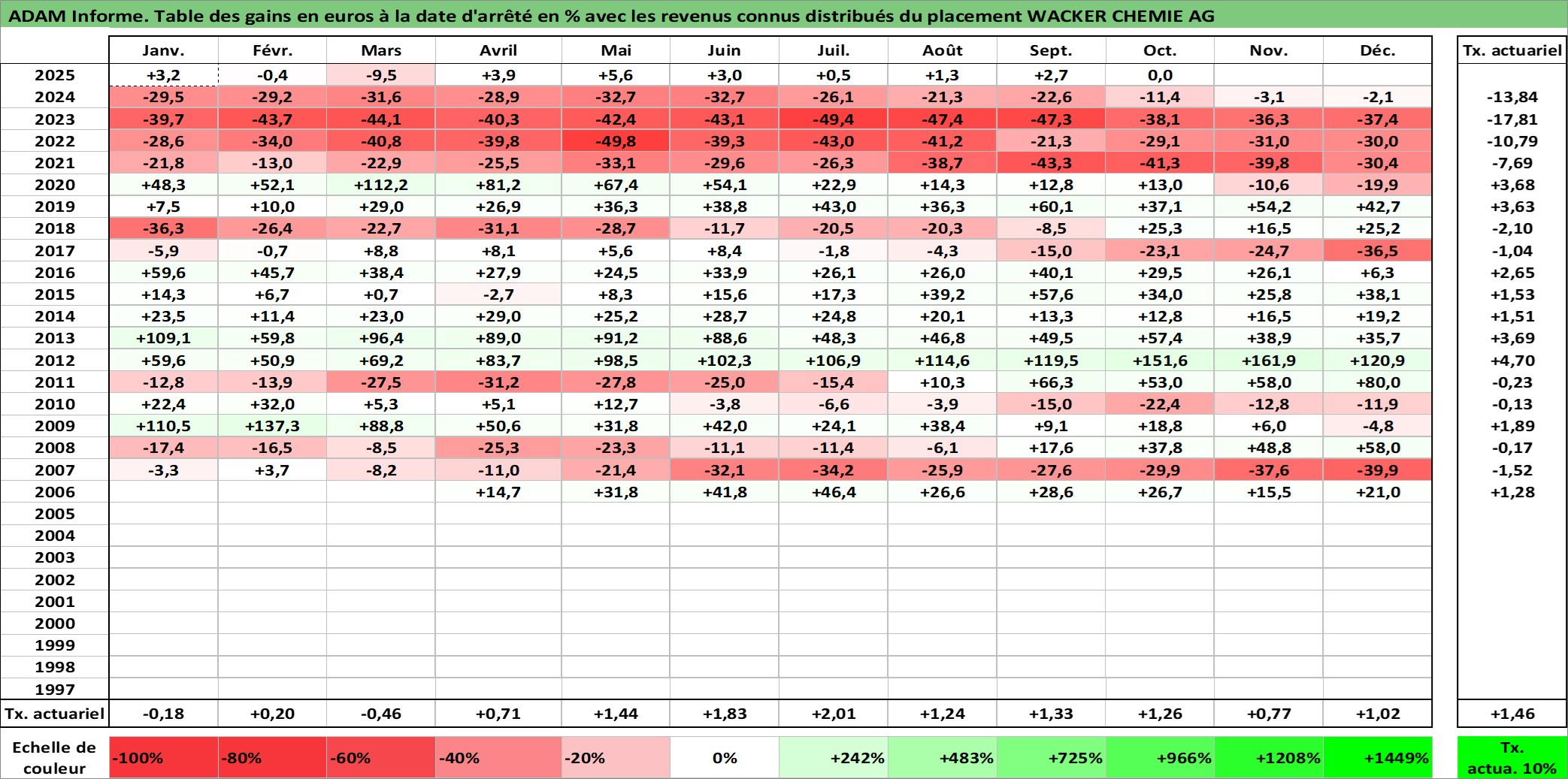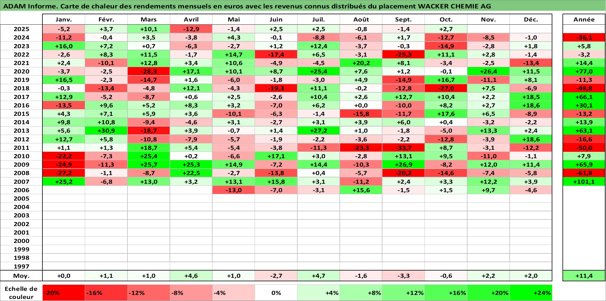 Site dédié aux investisseursPage dédiée sur site financeAnalyse des valorisations hebdomadaires de l'action WACKER CHEMIE AG. Cet actif est cote en EUR. Les valorisations couvrent les semaines 2006W15 a 2025W40. Les revenus de cet actif financier sont pris en compte depuis la semaine 2007W22. La note globale ESG de cet actif est estimee a 7.0 (apres rebasage entre 0 et 20).