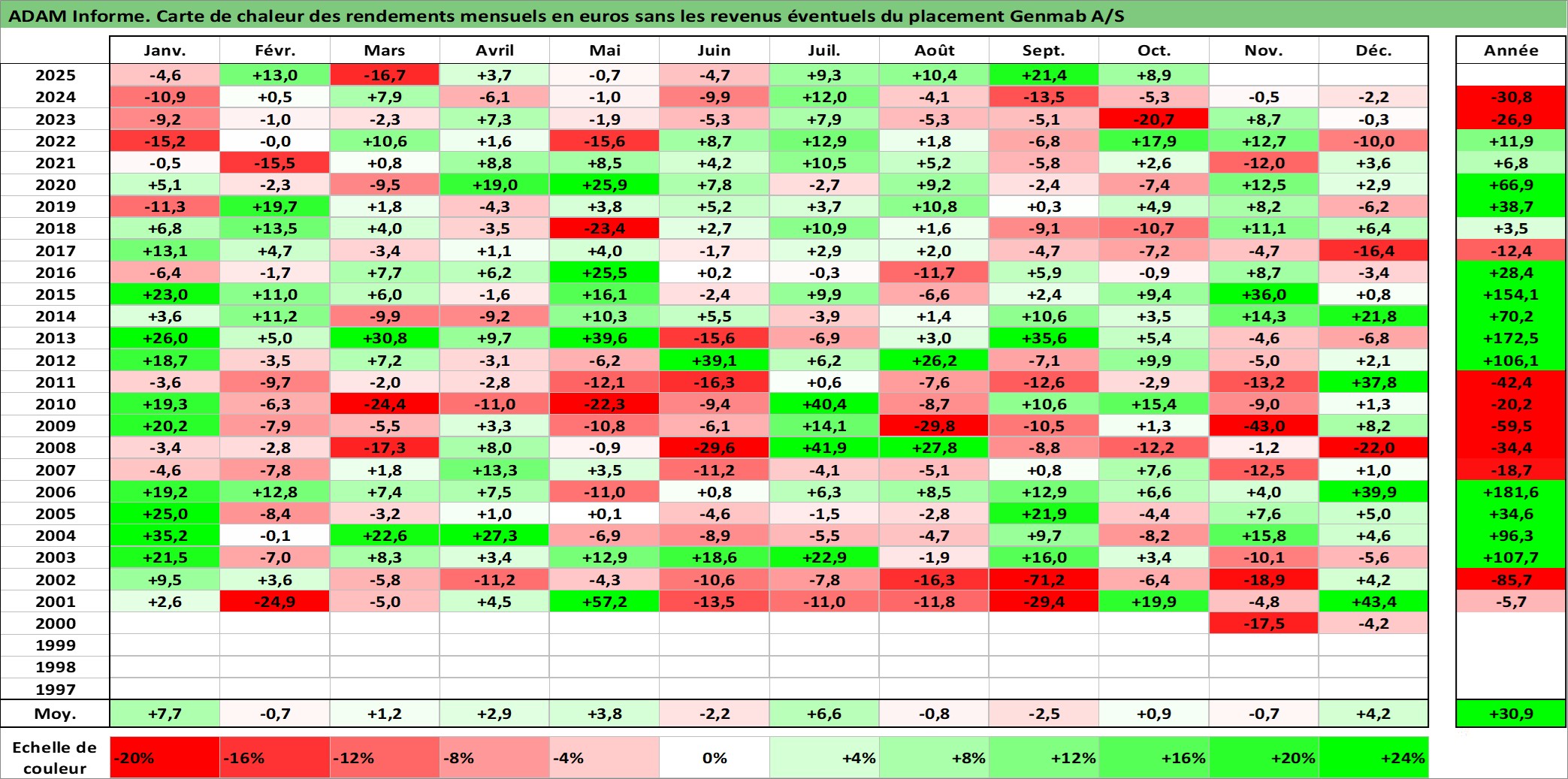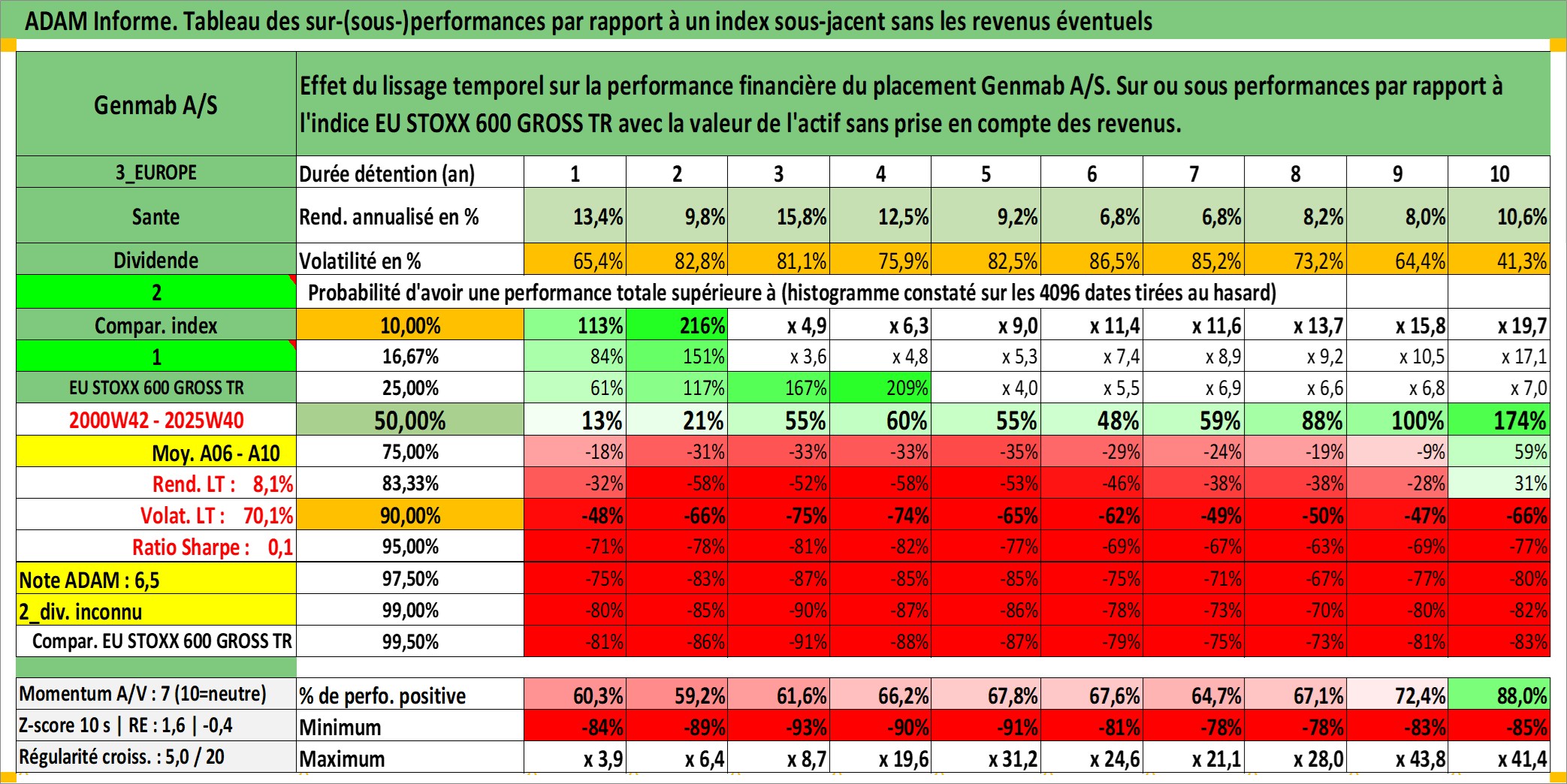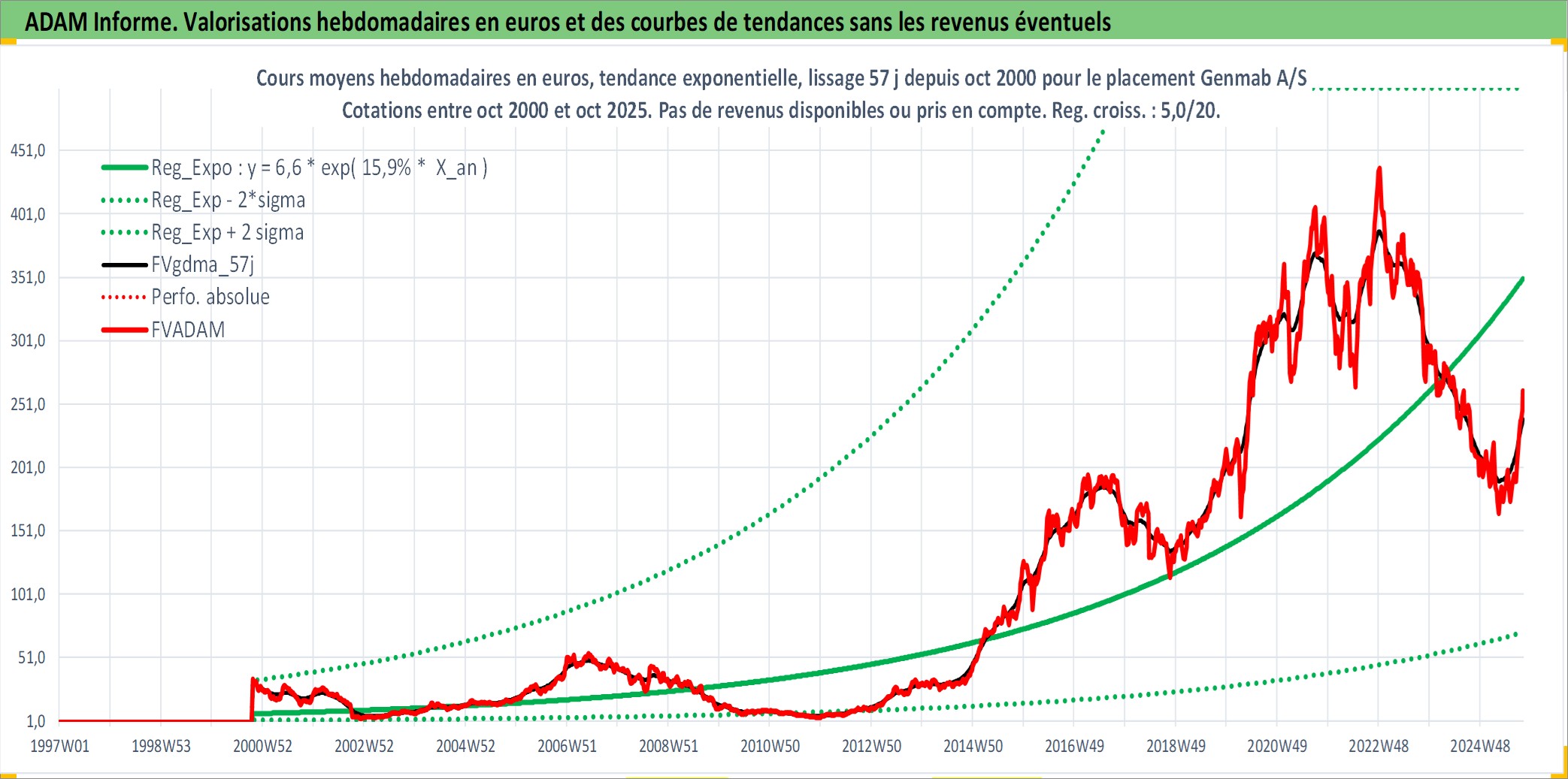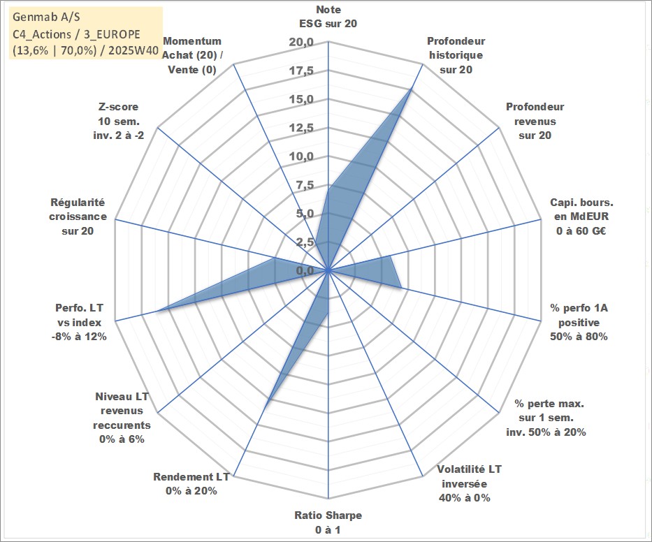 Site dédié aux investisseursPage dédiée sur site financeAnalyse des valorisations hebdomadaires de l'action Genmab A/S. Cet actif est cote en DKK. Les valorisations sont en contrevaleur EURO et couvrent les semaines 2000W42 a 2025W40. Les revenus de cet actif financier ne sont pas connus car non existants ou non disponibles sur le site Yahoo Finance. La note globale ESG de cet actif est estimee a 7.0 (apres rebasage entre 0 et 20).
