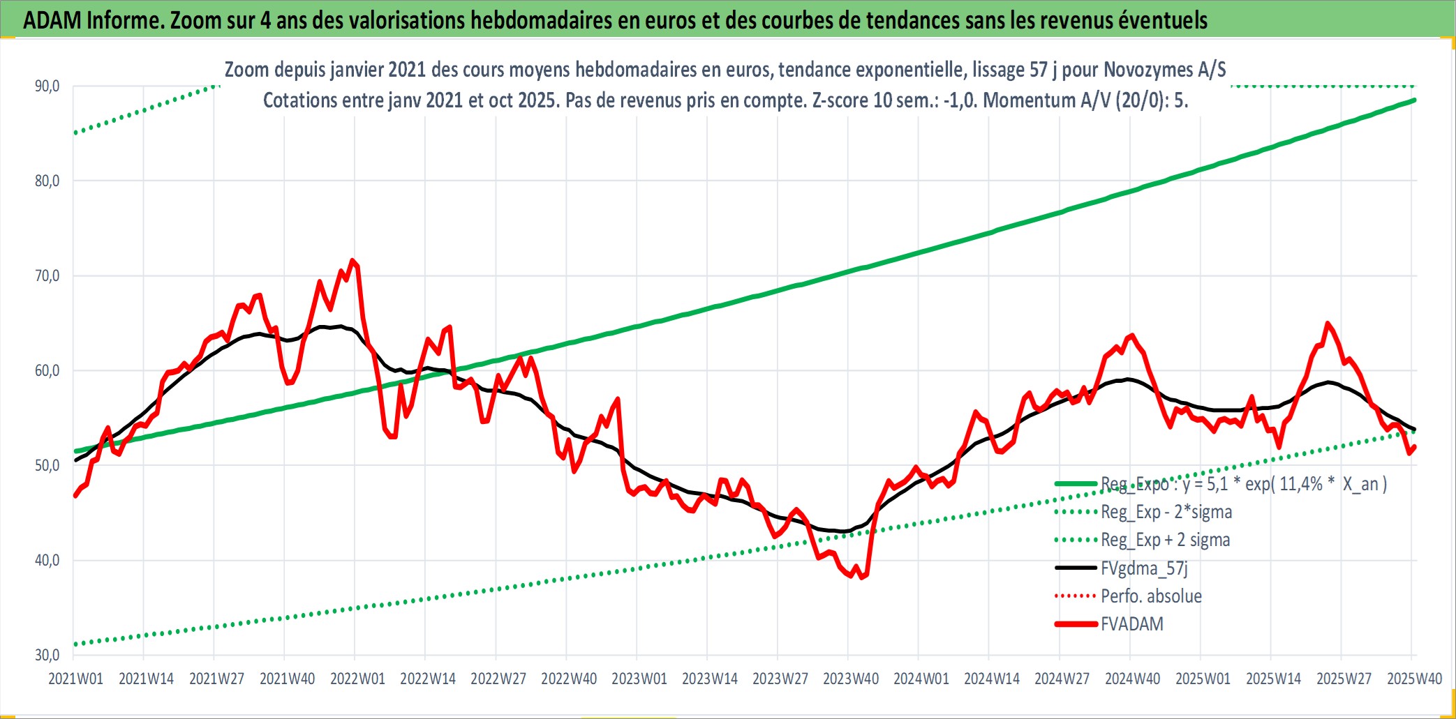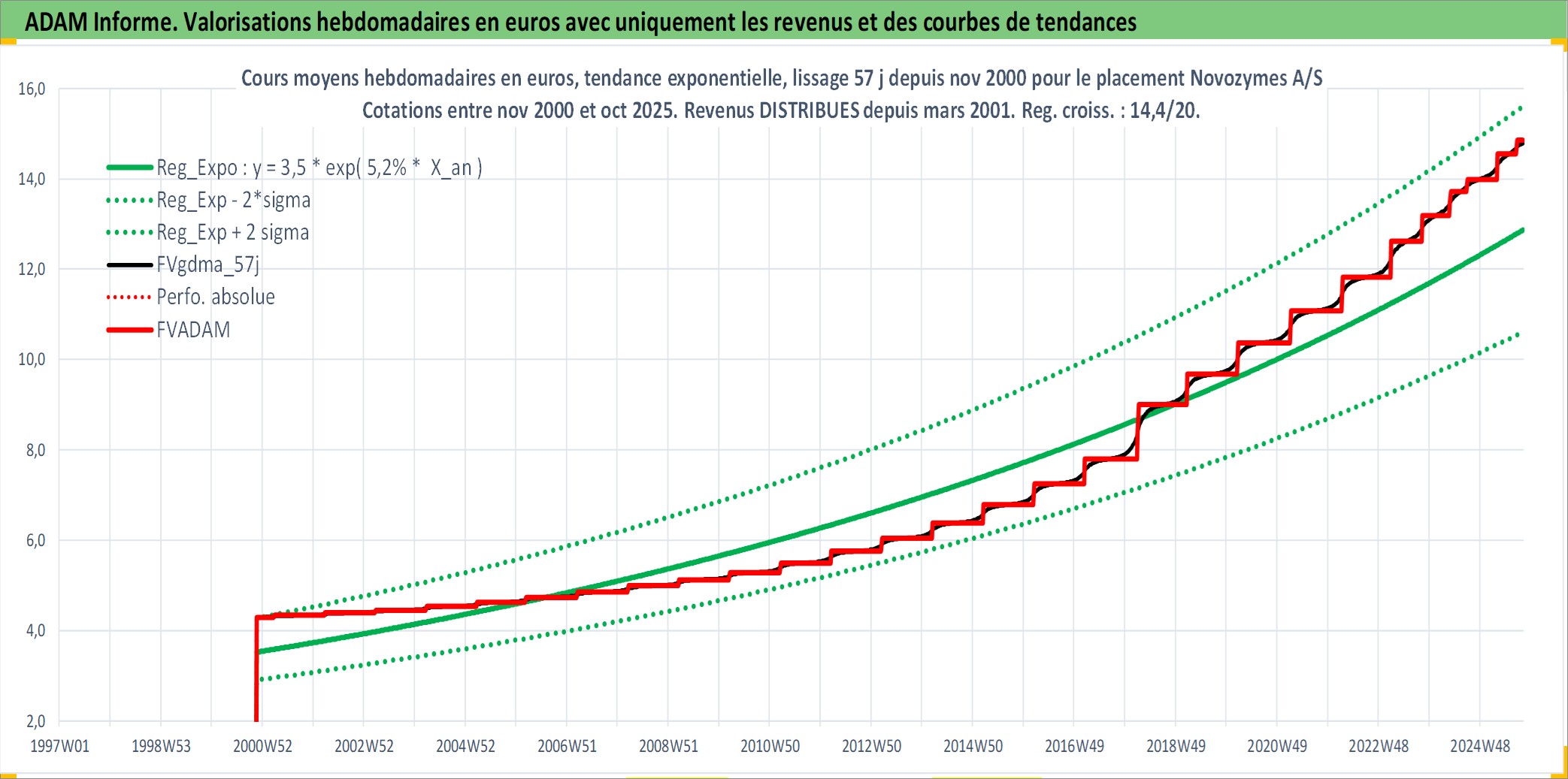 Site dédié aux investisseursPage dédiée sur site financeAnalyse des valorisations hebdomadaires de l'action Novozymes A/S. Cet actif est cote en DKK. Les valorisations sont en contrevaleur EURO et couvrent les semaines 2000W46 a 2025W40. Les revenus de cet actif financier sont pris en compte depuis la semaine 2001W12. La note globale ESG de cet actif est estimee a 13.0 (apres rebasage entre 0 et 20).