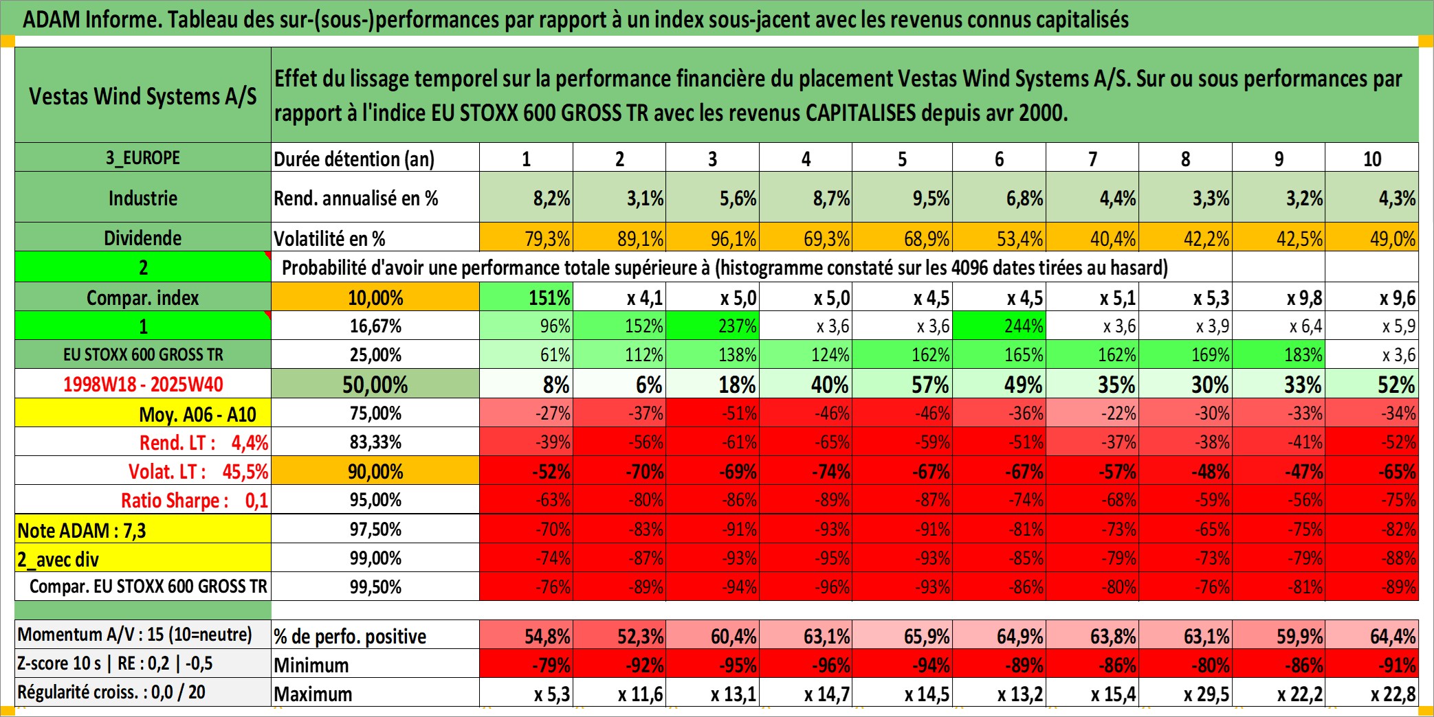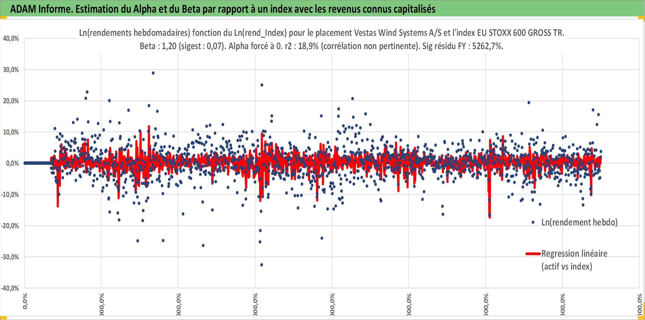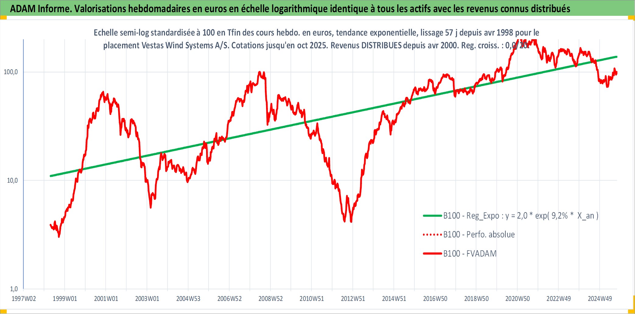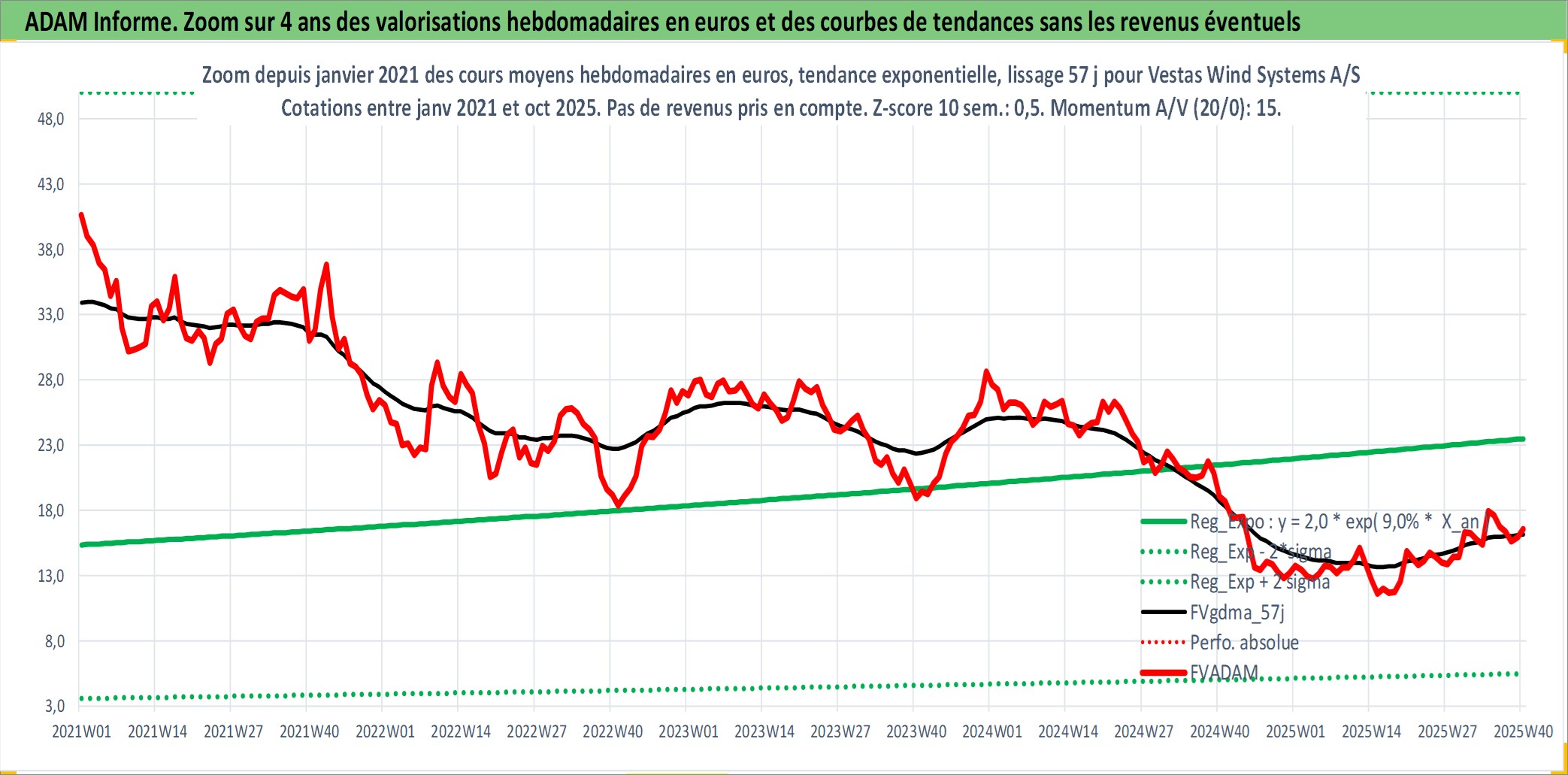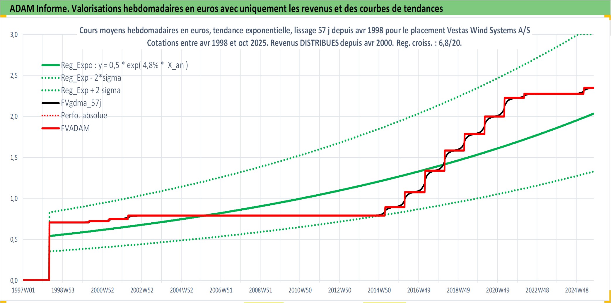 Site dédié aux investisseursPage dédiée sur site financeAnalyse des valorisations hebdomadaires de l'action Vestas Wind Systems A/S. Cet actif est cote en DKK. Les valorisations sont en contrevaleur EURO et couvrent les semaines 1998W18 a 2025W40. Les revenus de cet actif financier sont pris en compte depuis la semaine 2000W17. La note globale ESG de cet actif est estimee a 11.0 (apres rebasage entre 0 et 20).