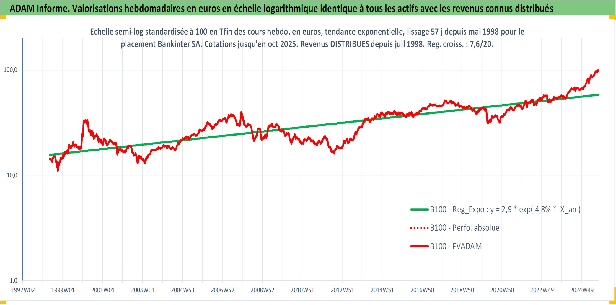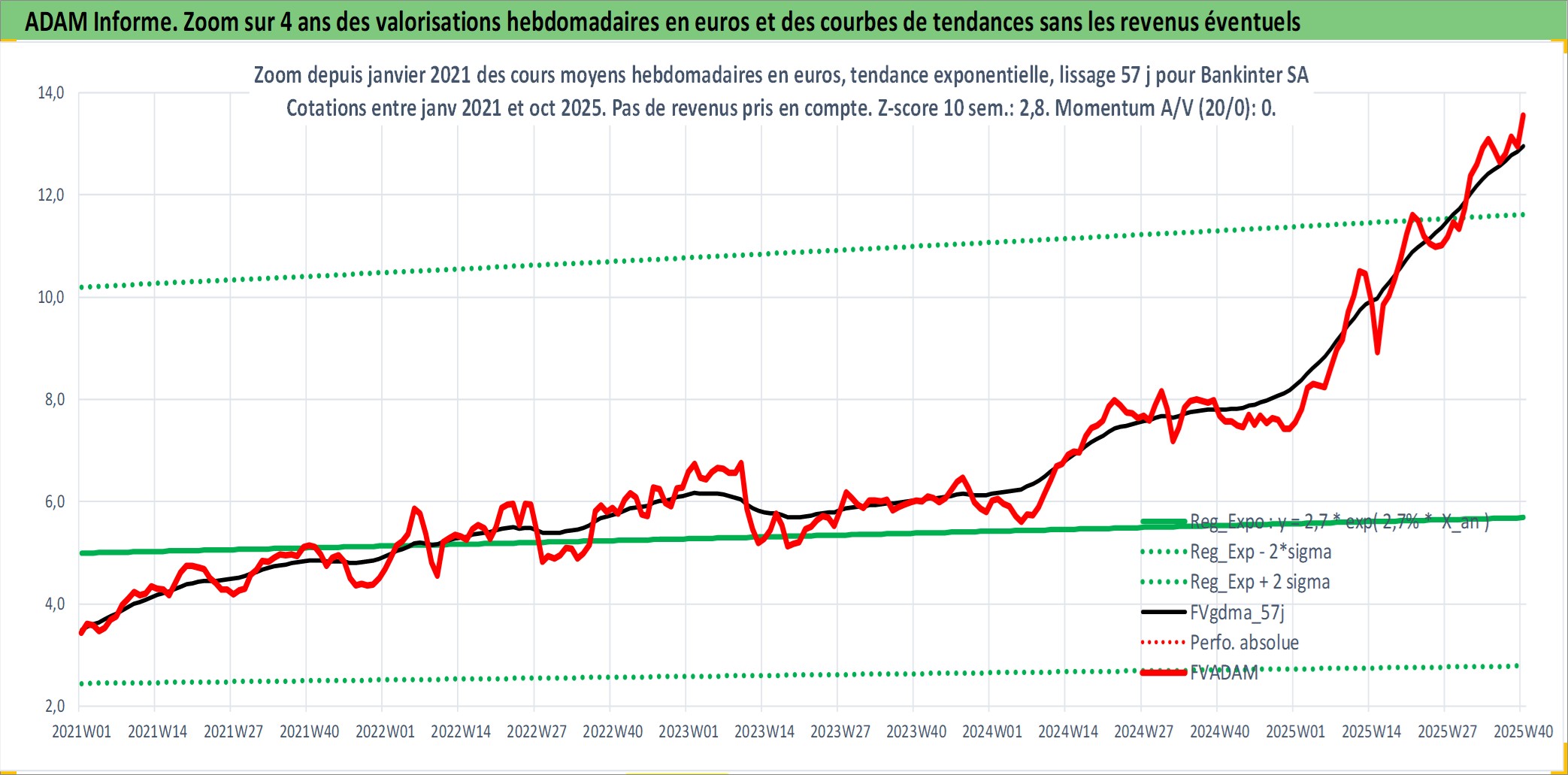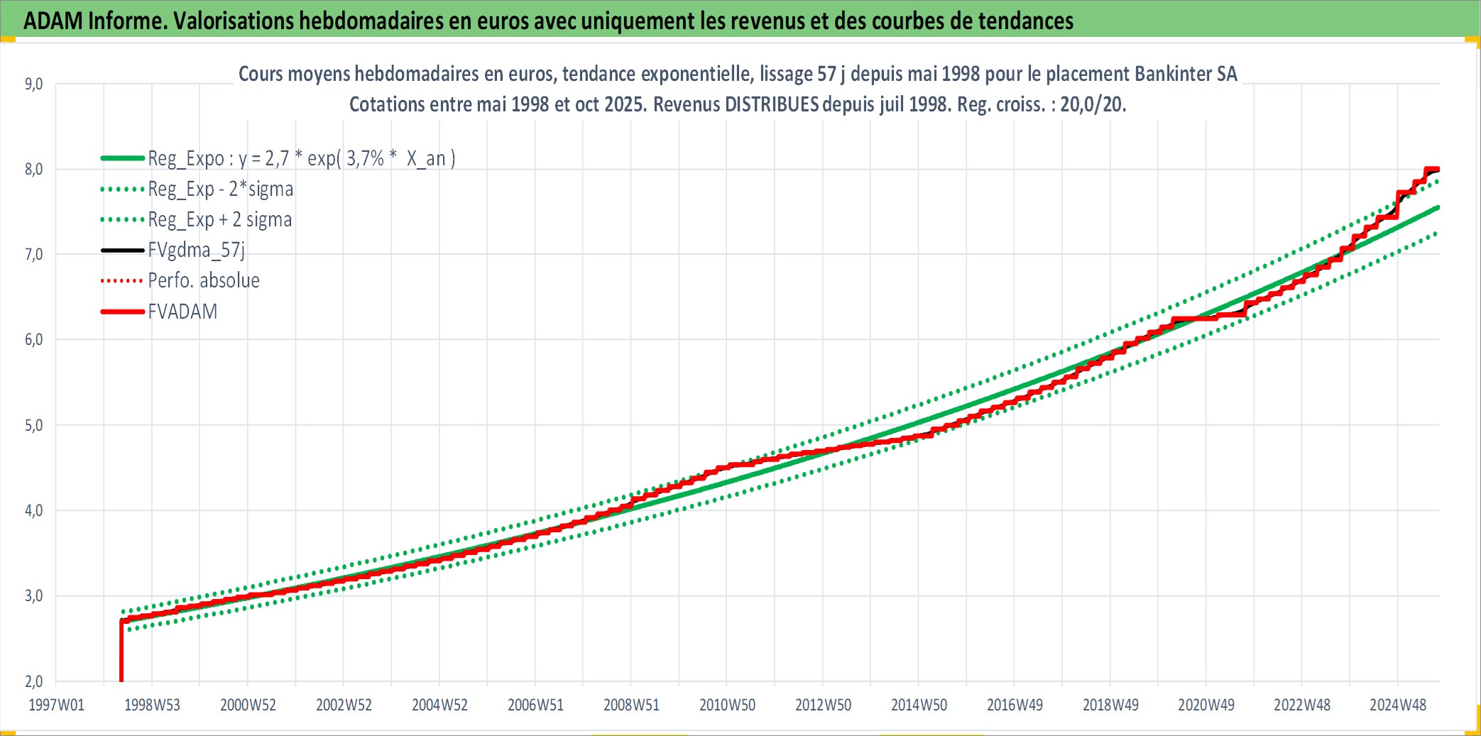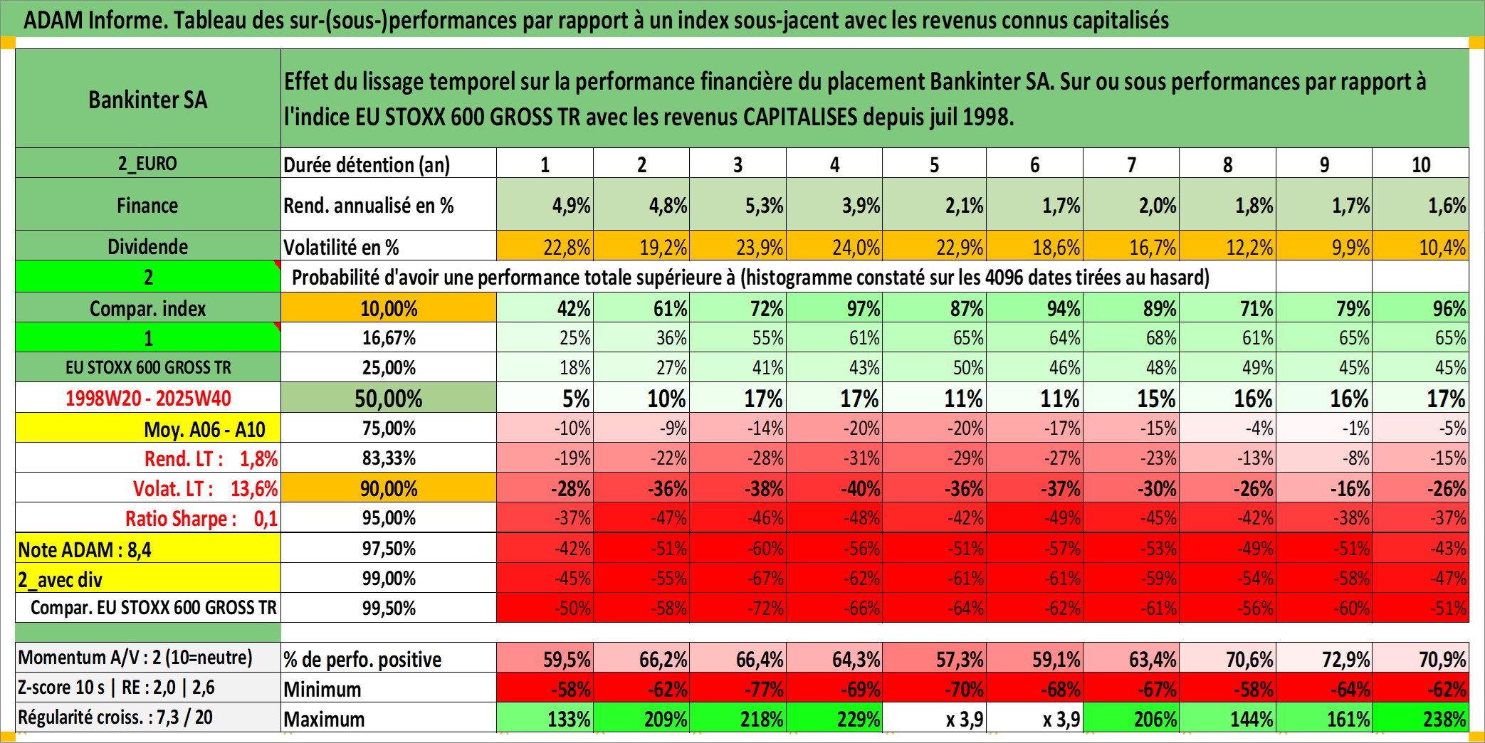 Site dédié aux investisseursPage dédiée sur site financeAnalyse des valorisations hebdomadaires de l'action Bankinter SA. Cet actif est cote en EUR. Les valorisations couvrent les semaines 1998W20 a 2025W40. Les revenus de cet actif financier sont pris en compte depuis la semaine 1998W28. La note globale ESG de cet actif est estimee a 9.0 (apres rebasage entre 0 et 20).
