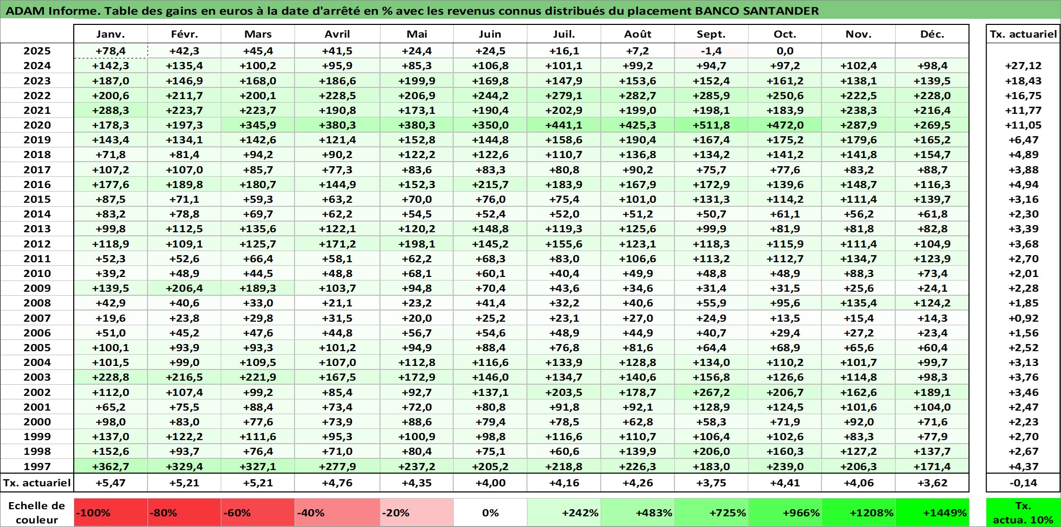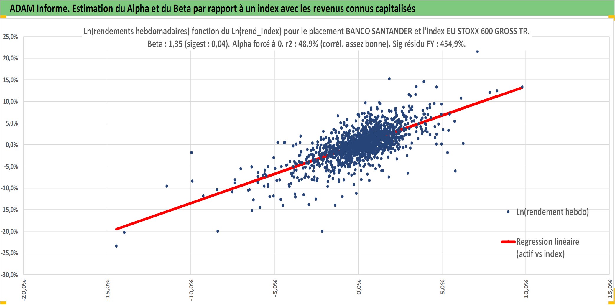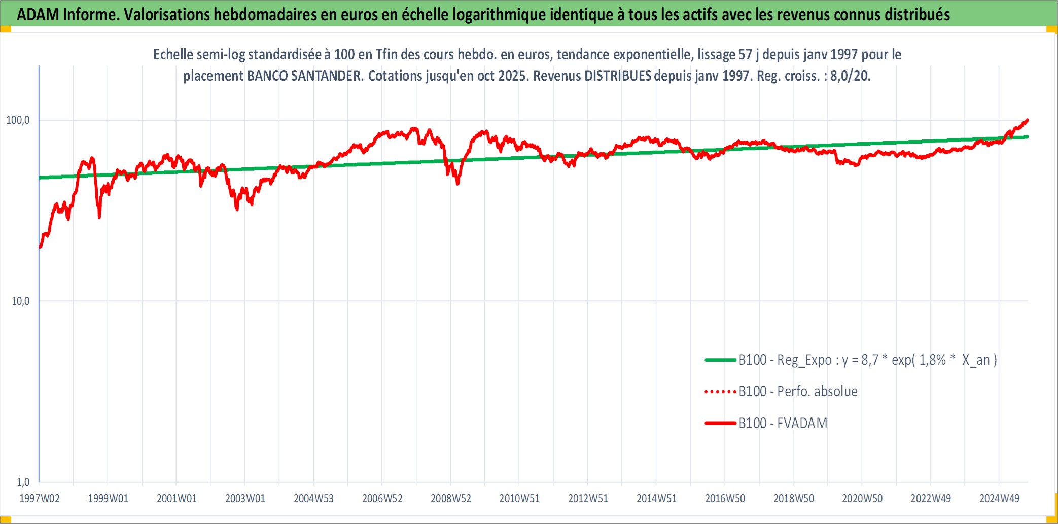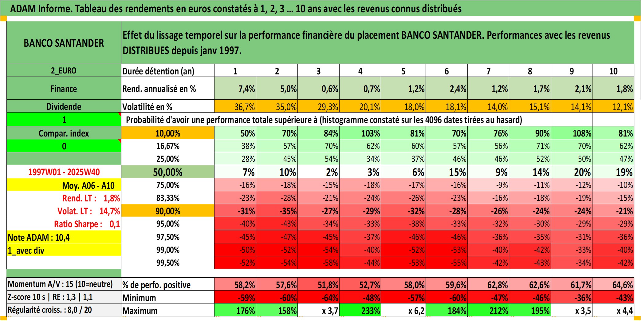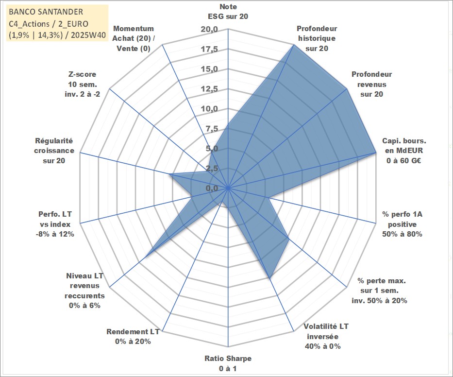 Site dédié aux investisseursPage dédiée sur site financeAnalyse des valorisations hebdomadaires de l'action BANCO SANTANDER. Cet actif est cote en EUR. Les valorisations couvrent les semaines 1997W01 a 2025W40. Les revenus de cet actif financier sont pris en compte depuis la semaine 1997W05. La note globale ESG de cet actif est estimee a 8.0 (apres rebasage entre 0 et 20).