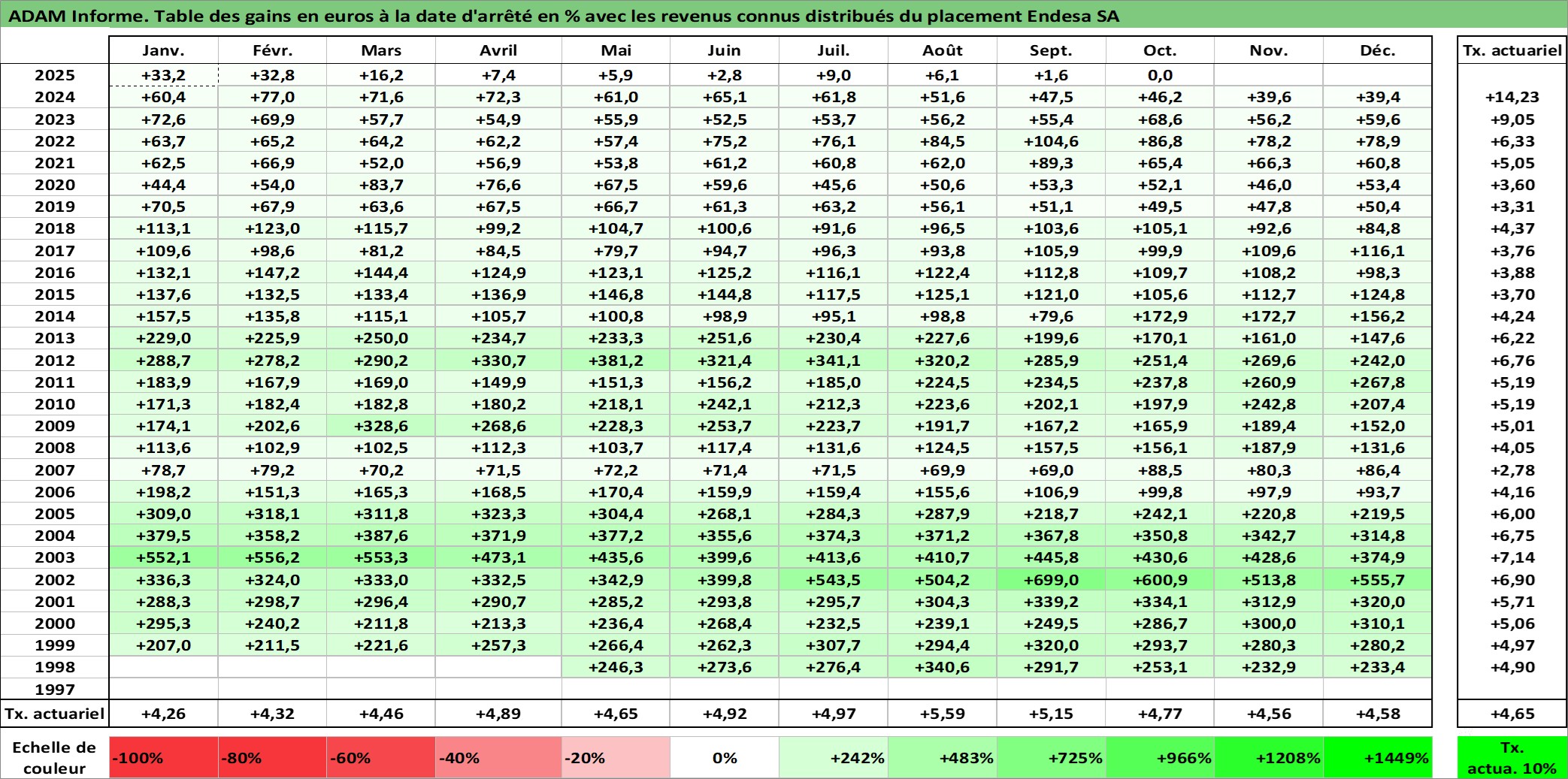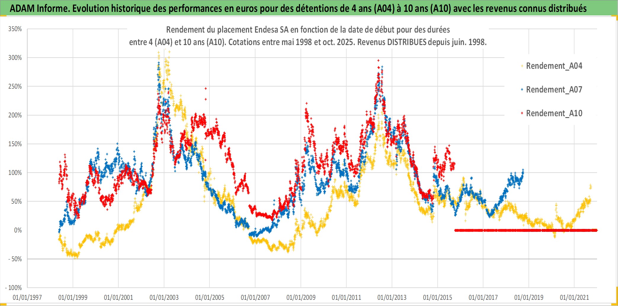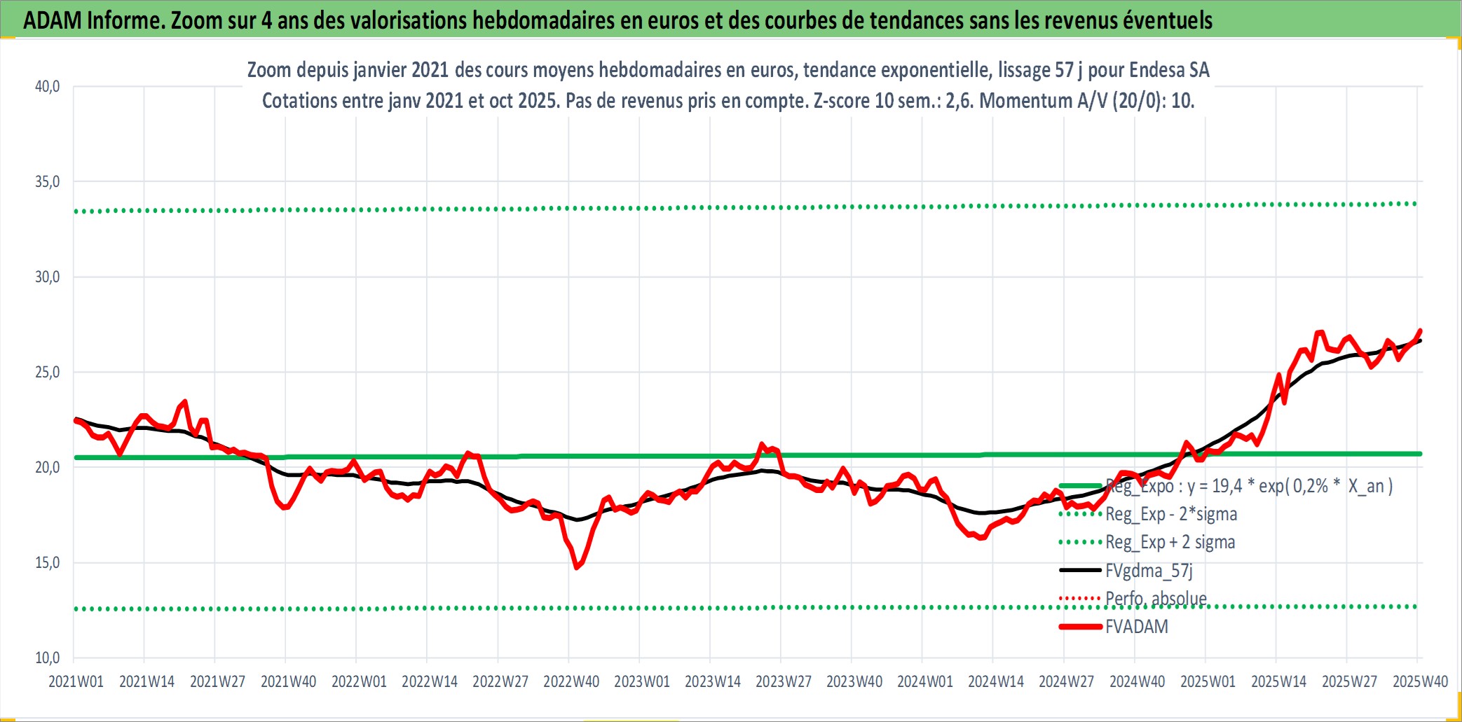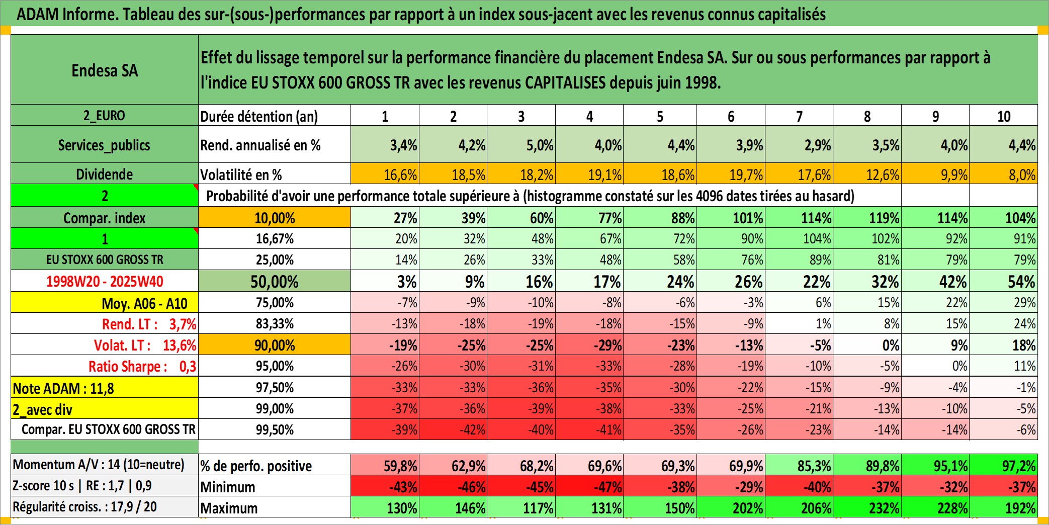 Site dédié aux investisseursPage dédiée sur site financeAnalyse des valorisations hebdomadaires de l'action Endesa SA. Cet actif est cote en EUR. Les valorisations couvrent les semaines 1998W20 a 2025W40. Les revenus de cet actif financier sont pris en compte depuis la semaine 1998W25. La note globale ESG de cet actif est estimee a 12.0 (apres rebasage entre 0 et 20).