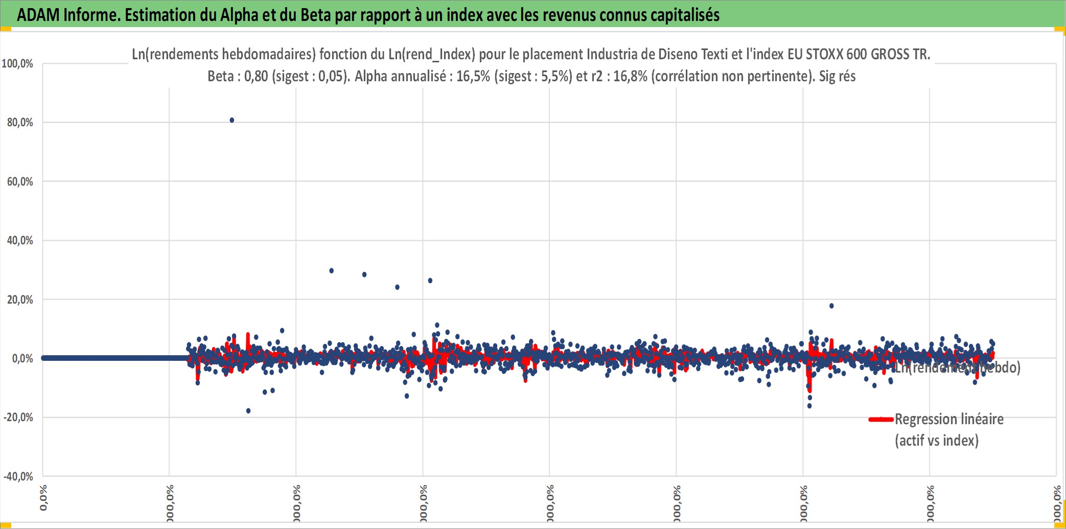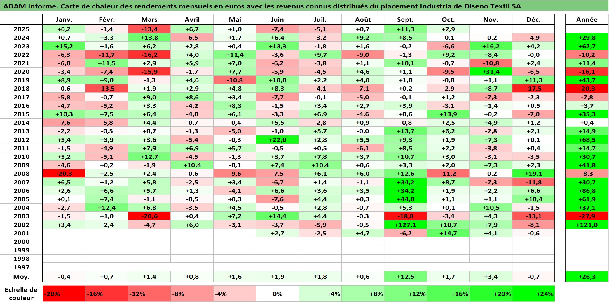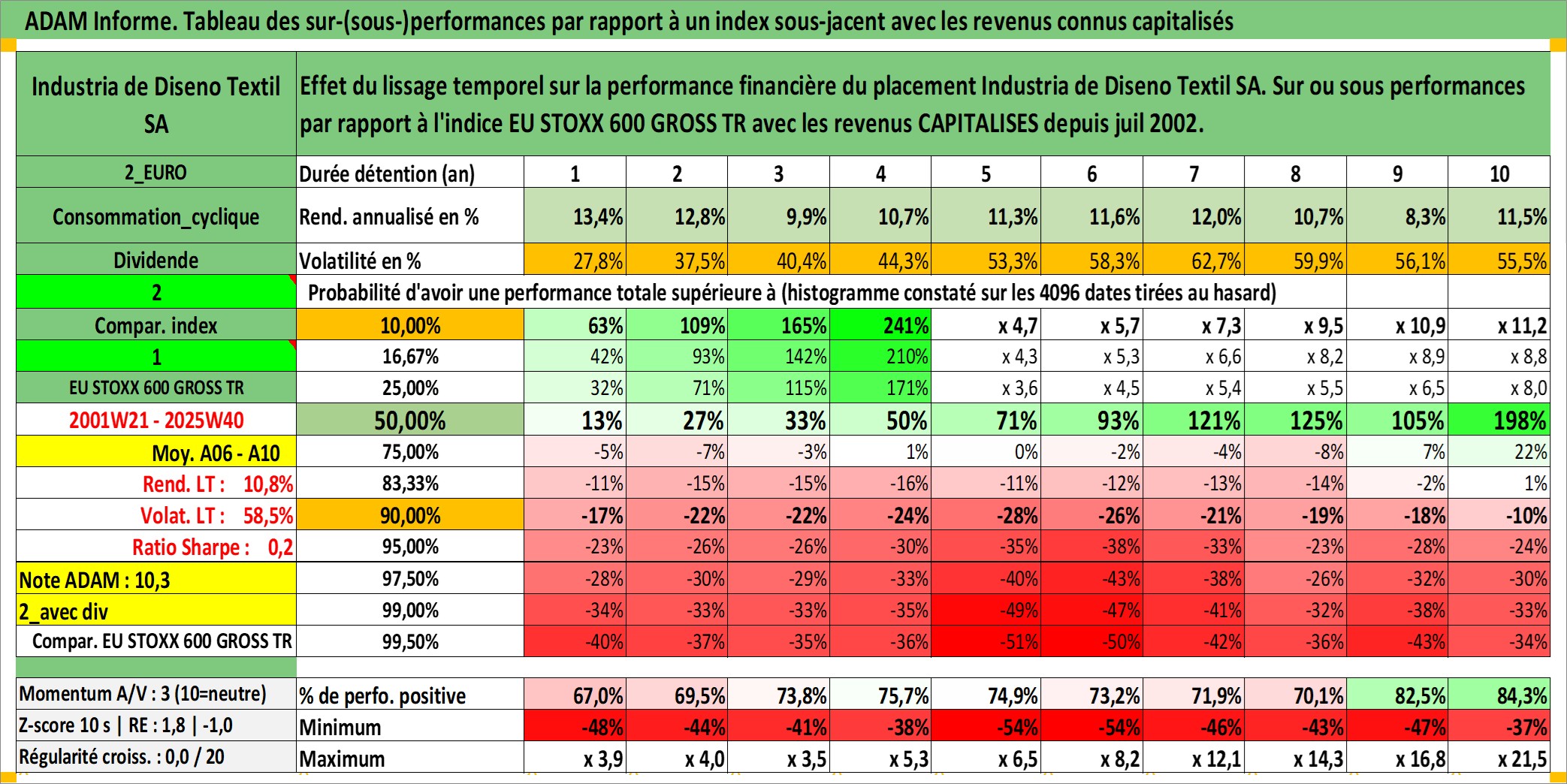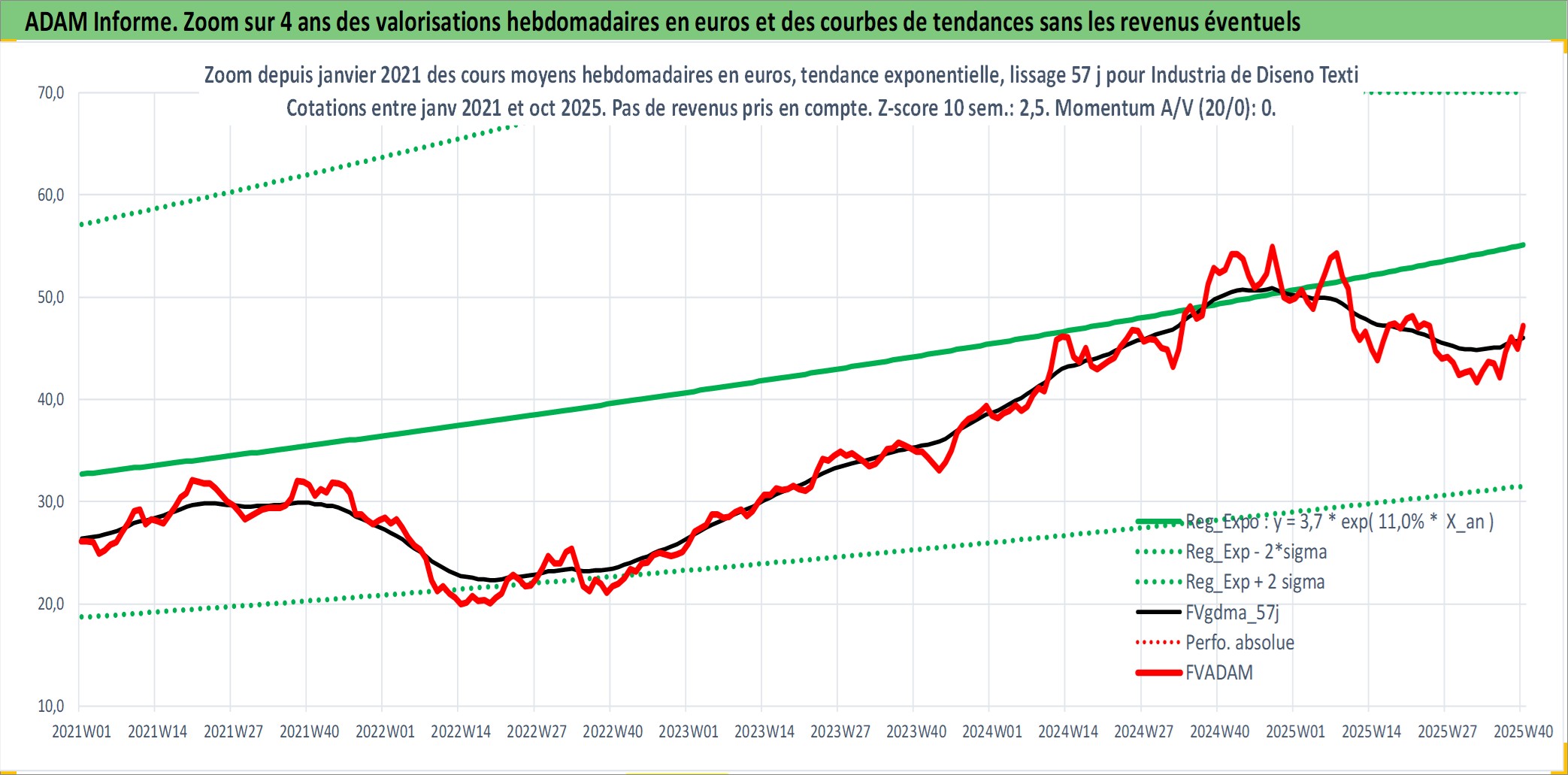 Site dédié aux investisseursPage dédiée sur site financeAnalyse des valorisations hebdomadaires de l'action Industria de Diseno Textil SA. Cet actif est cote en EUR. Les valorisations couvrent les semaines 2001W21 a 2025W40. Les revenus de cet actif financier sont pris en compte depuis la semaine 2002W30. La note globale ESG de cet actif est estimee a 15.0 (apres rebasage entre 0 et 20).