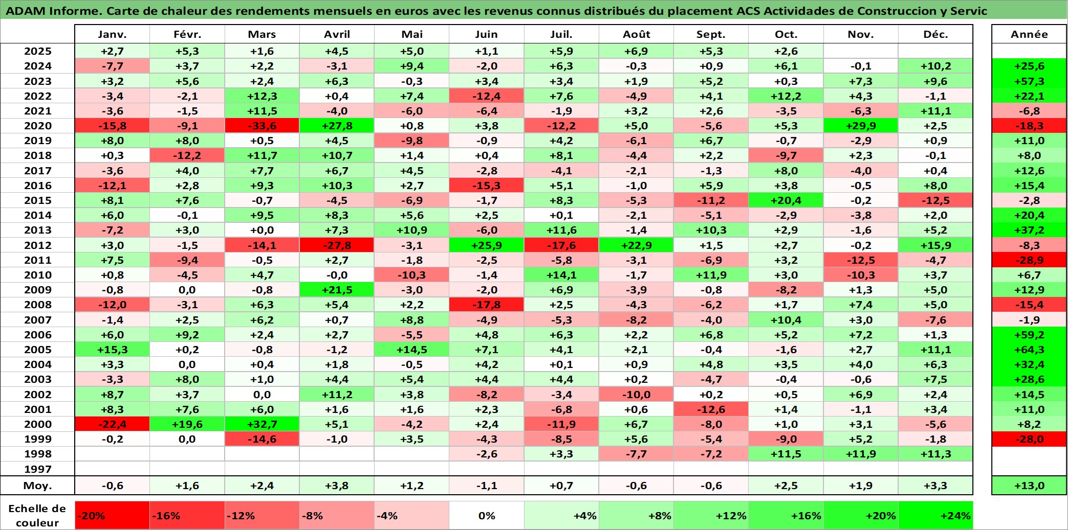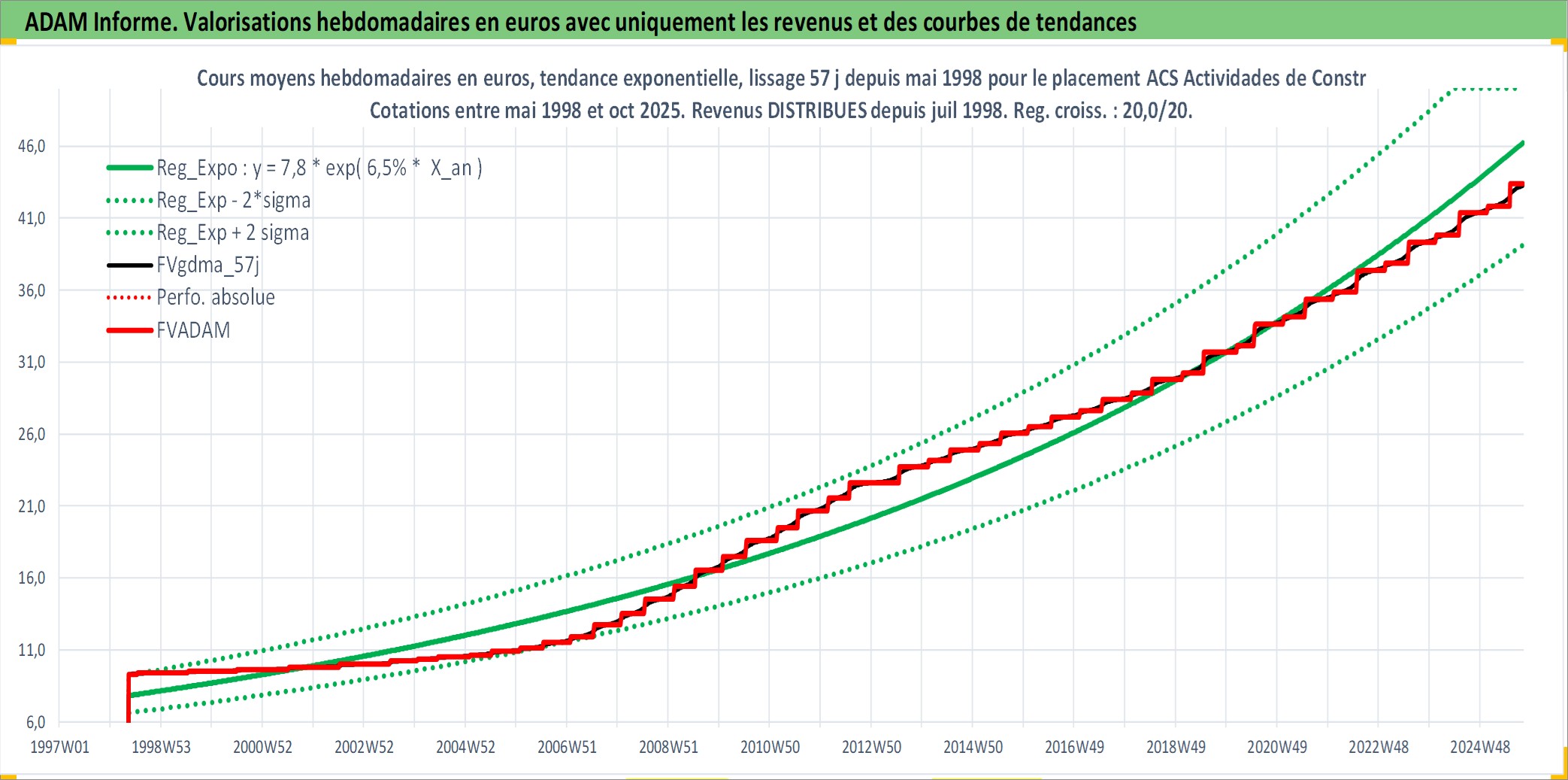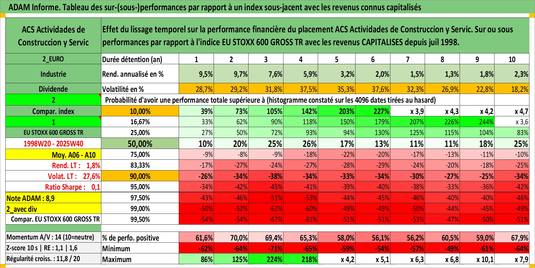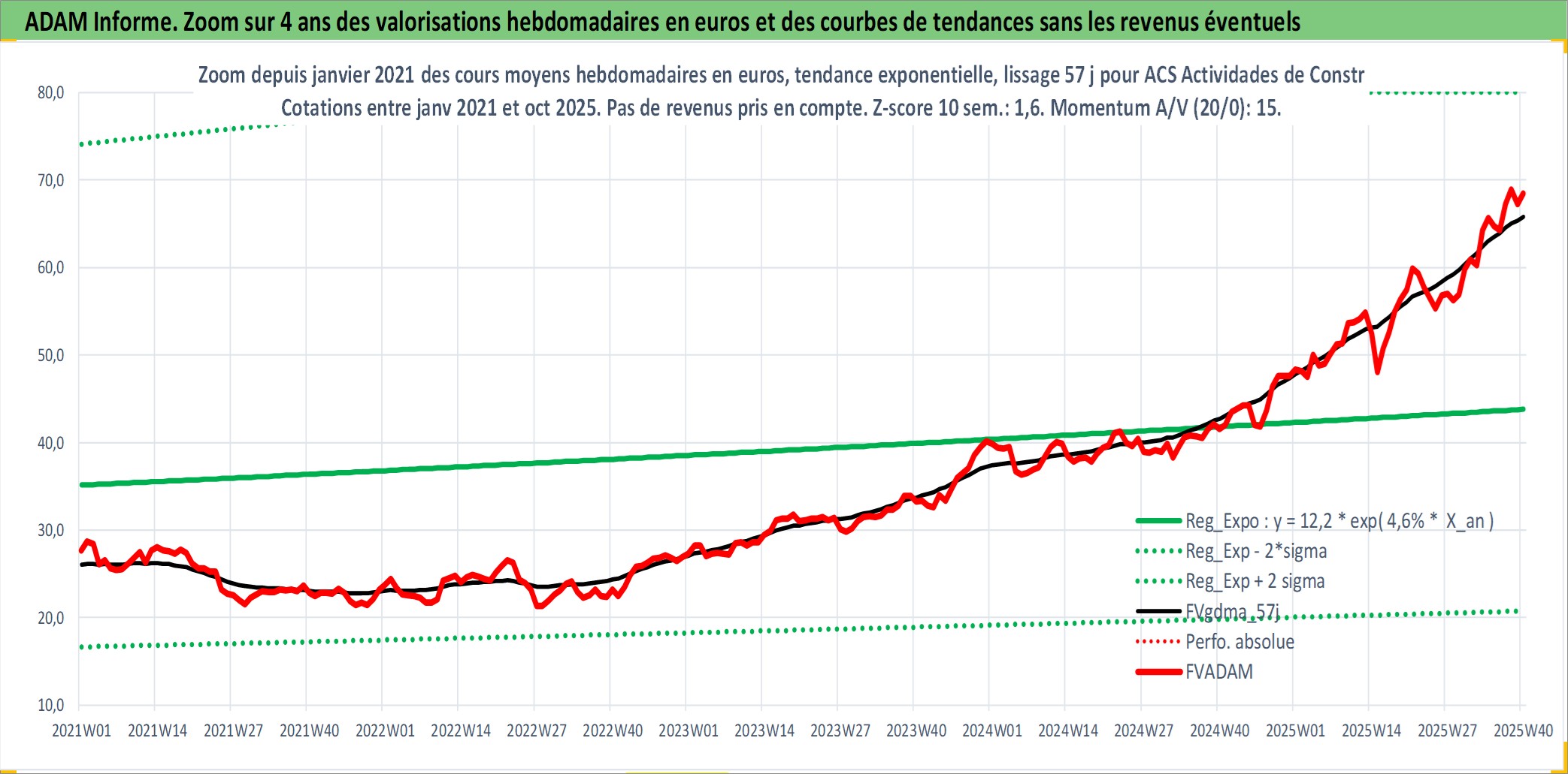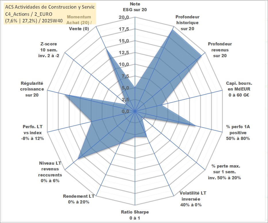 Site dédié aux investisseursPage dédiée sur site financeAnalyse des valorisations hebdomadaires de l'action ACS Actividades de Construccion y Servic. Cet actif est cote en EUR. Les valorisations couvrent les semaines 1998W20 a 2025W40. Les revenus de cet actif financier sont pris en compte depuis la semaine 1998W29. La note globale ESG de cet actif est estimee a 5.0 (apres rebasage entre 0 et 20).