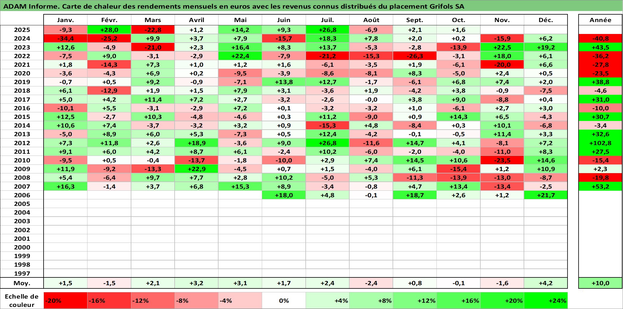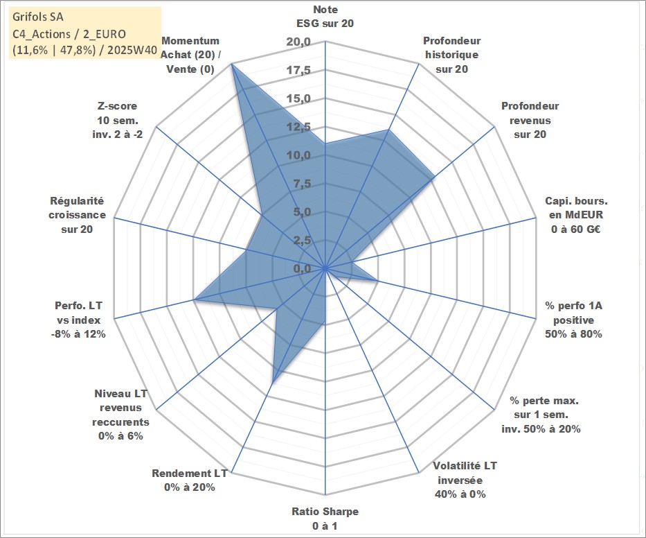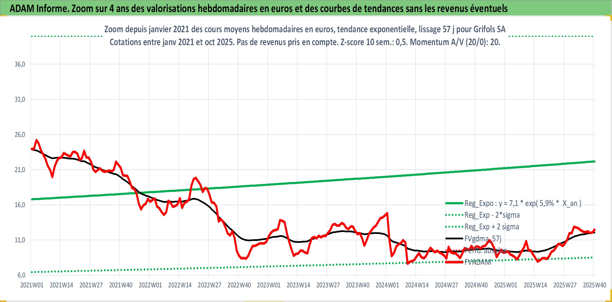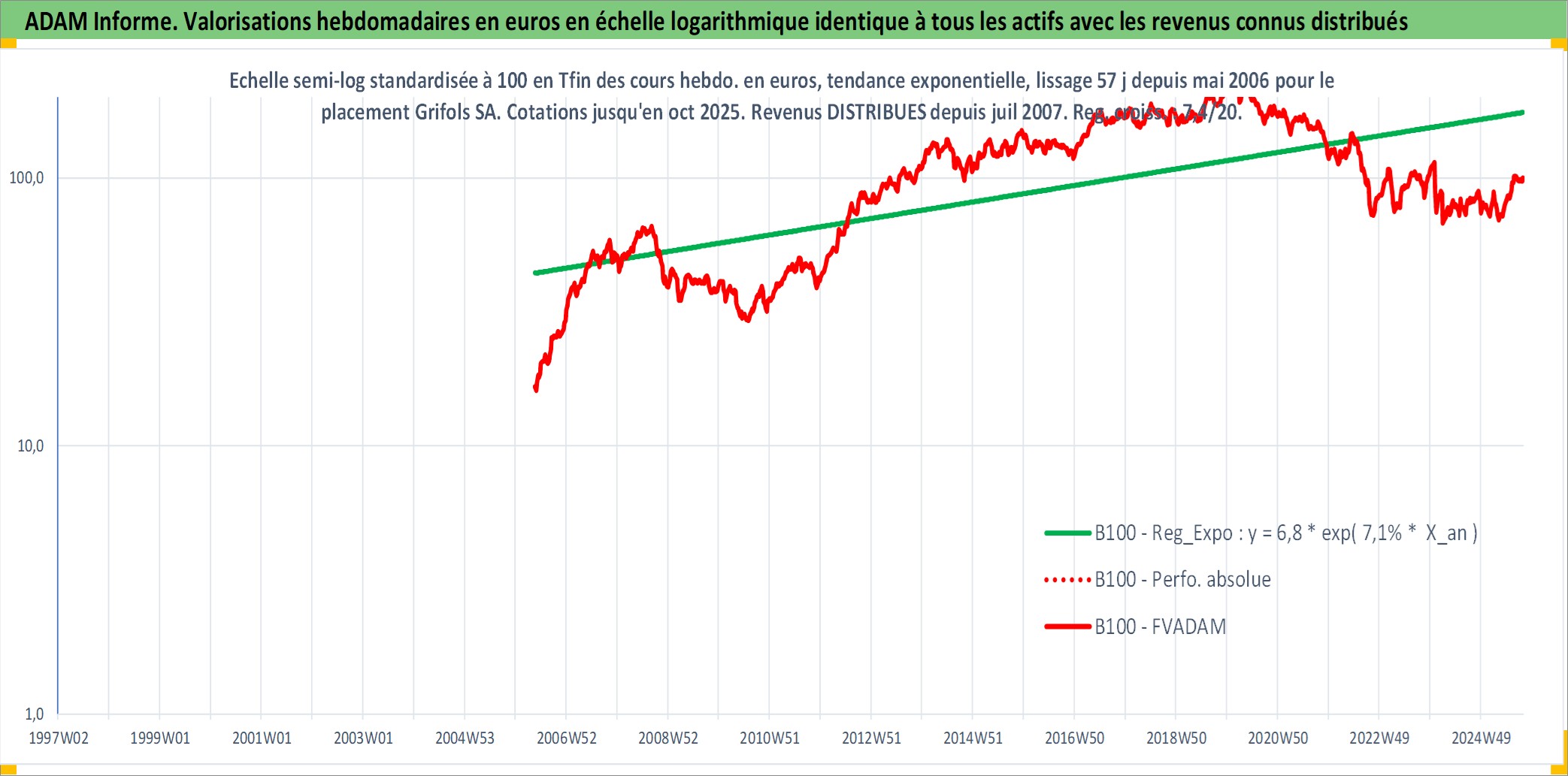 Site dédié aux investisseursPage dédiée sur site financeAnalyse des valorisations hebdomadaires de l'action Grifols SA. Cet actif est cote en EUR. Les valorisations couvrent les semaines 2006W20 a 2025W40. Les revenus de cet actif financier sont pris en compte depuis la semaine 2007W27. La note globale ESG de cet actif est estimee a 11.0 (apres rebasage entre 0 et 20).