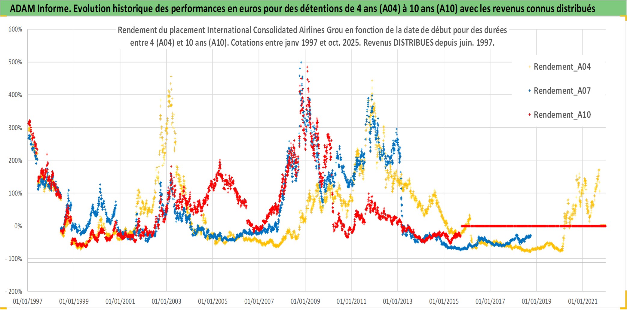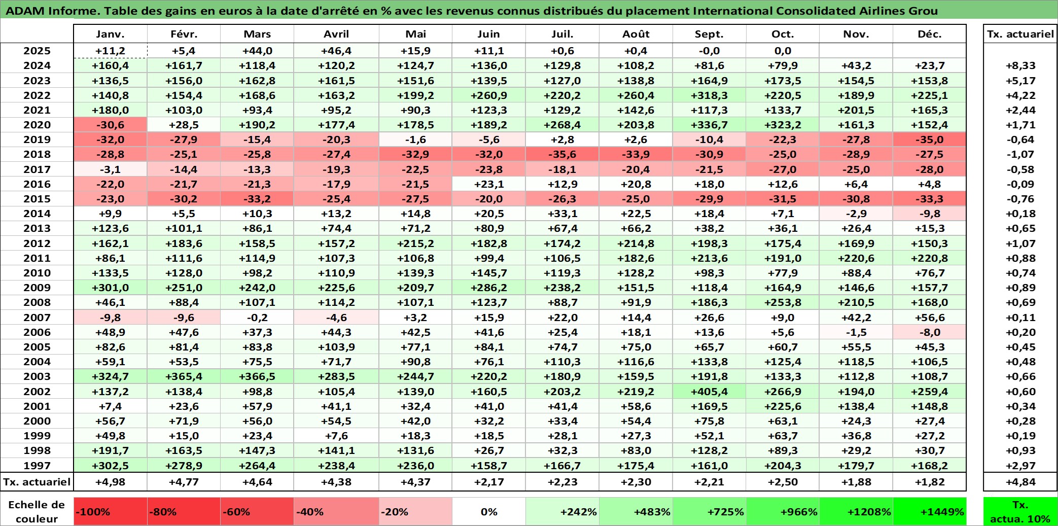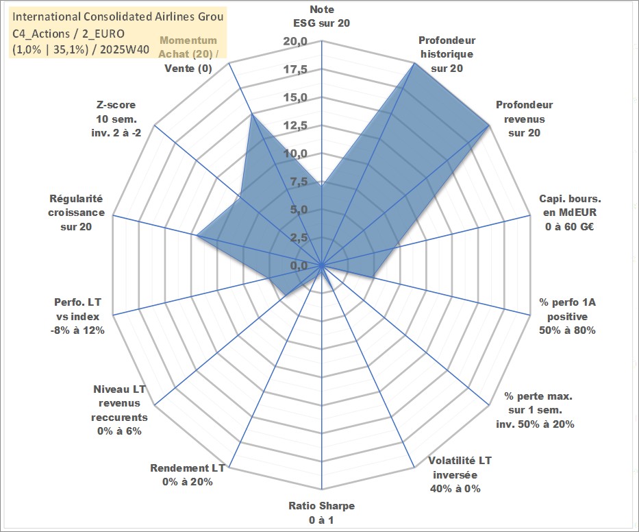 Site dédié aux investisseursPage dédiée sur site financeAnalyse des valorisations hebdomadaires de l'action International Consolidated Airlines Grou. Cet actif est cote en EUR. Les valorisations couvrent les semaines 1997W01 a 2025W40. Les revenus de cet actif financier sont pris en compte depuis la semaine 1997W23. La note globale ESG de cet actif est estimee a 7.0 (apres rebasage entre 0 et 20).