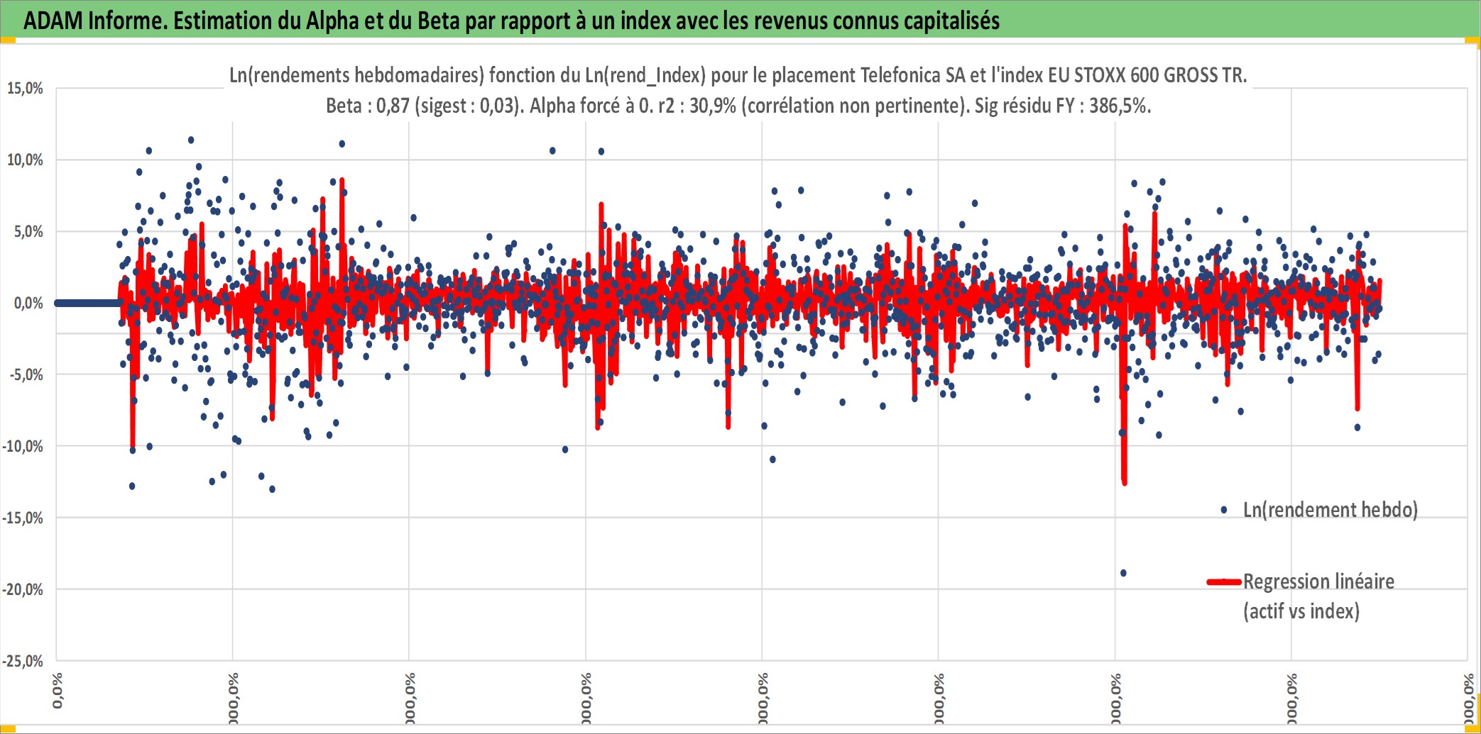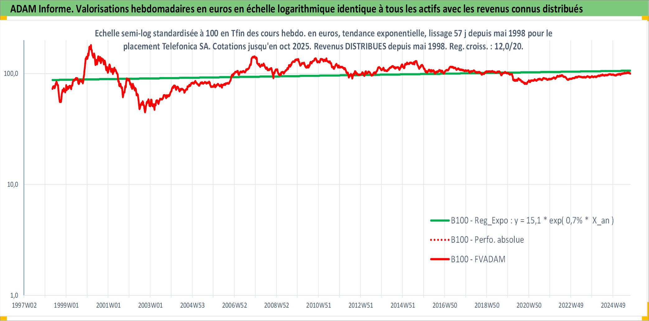 Site dédié aux investisseursPage dédiée sur site financeAnalyse des valorisations hebdomadaires de l'action Telefonica SA. Cet actif est cote en EUR. Les valorisations couvrent les semaines 1998W20 a 2025W40. Les revenus de cet actif financier sont pris en compte depuis la semaine 1998W21. La note globale ESG de cet actif est estimee a 12.0 (apres rebasage entre 0 et 20).