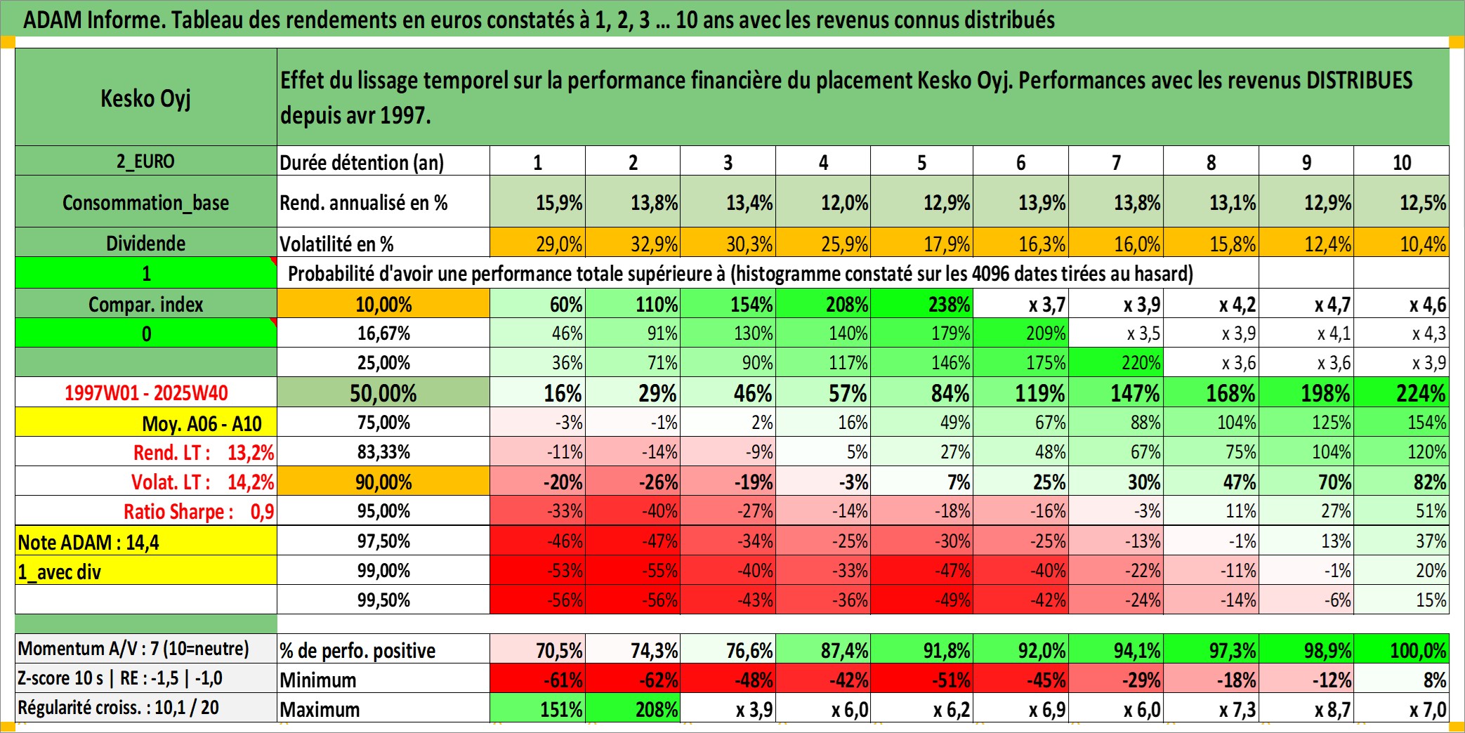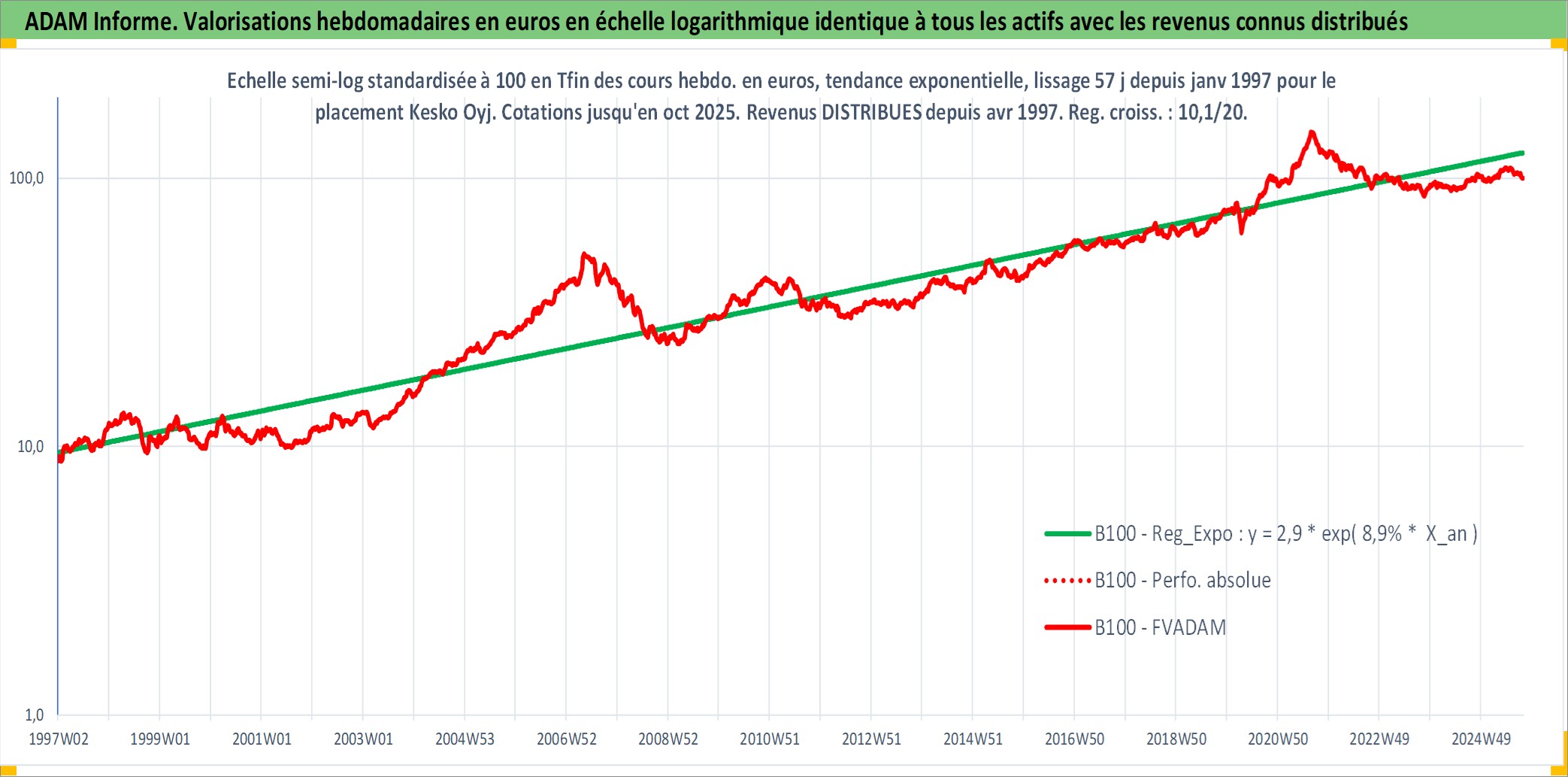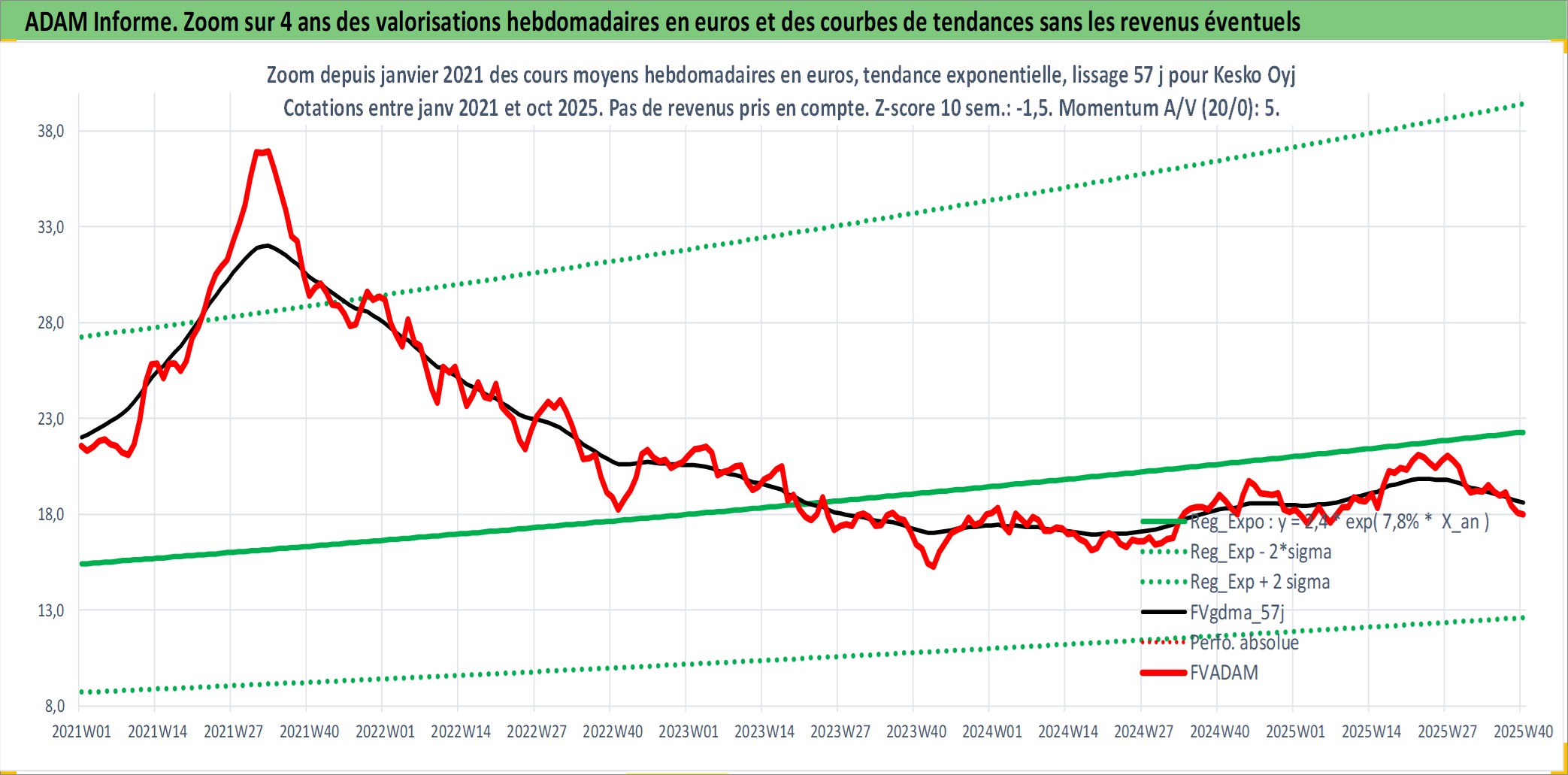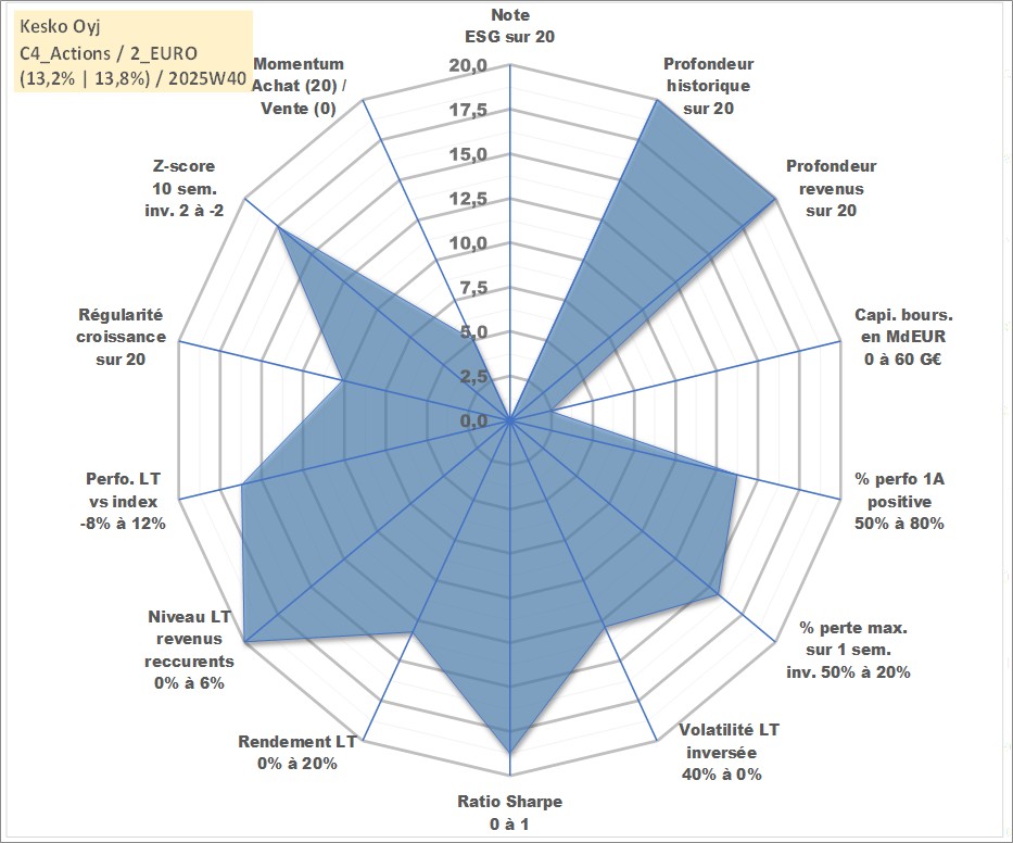 Site dédié aux investisseursPage dédiée sur site financeAnalyse des valorisations hebdomadaires de l'action Kesko Oyj. Cet actif est cote en EUR. Les valorisations couvrent les semaines 1997W01 a 2025W40. Les revenus de cet actif financier sont pris en compte depuis la semaine 1997W16. La note ESG de cet actif n'est pas connue.