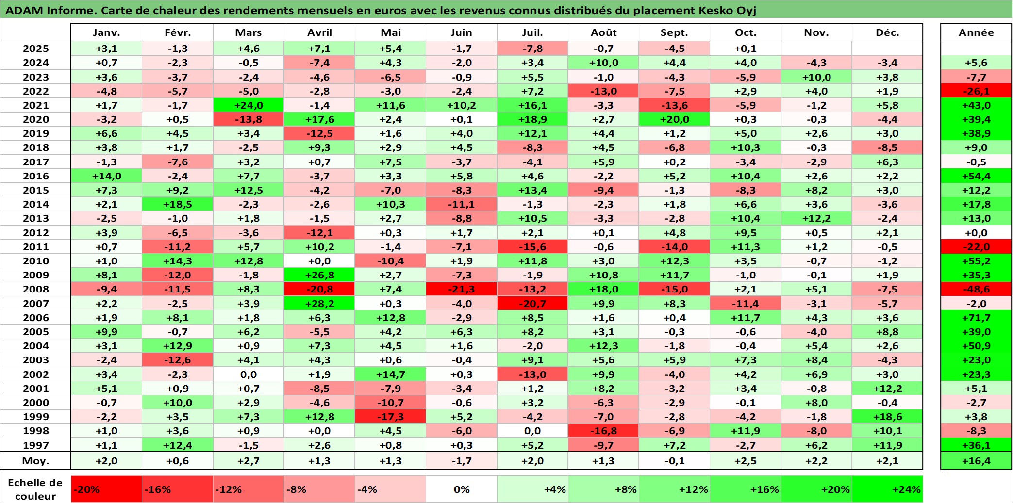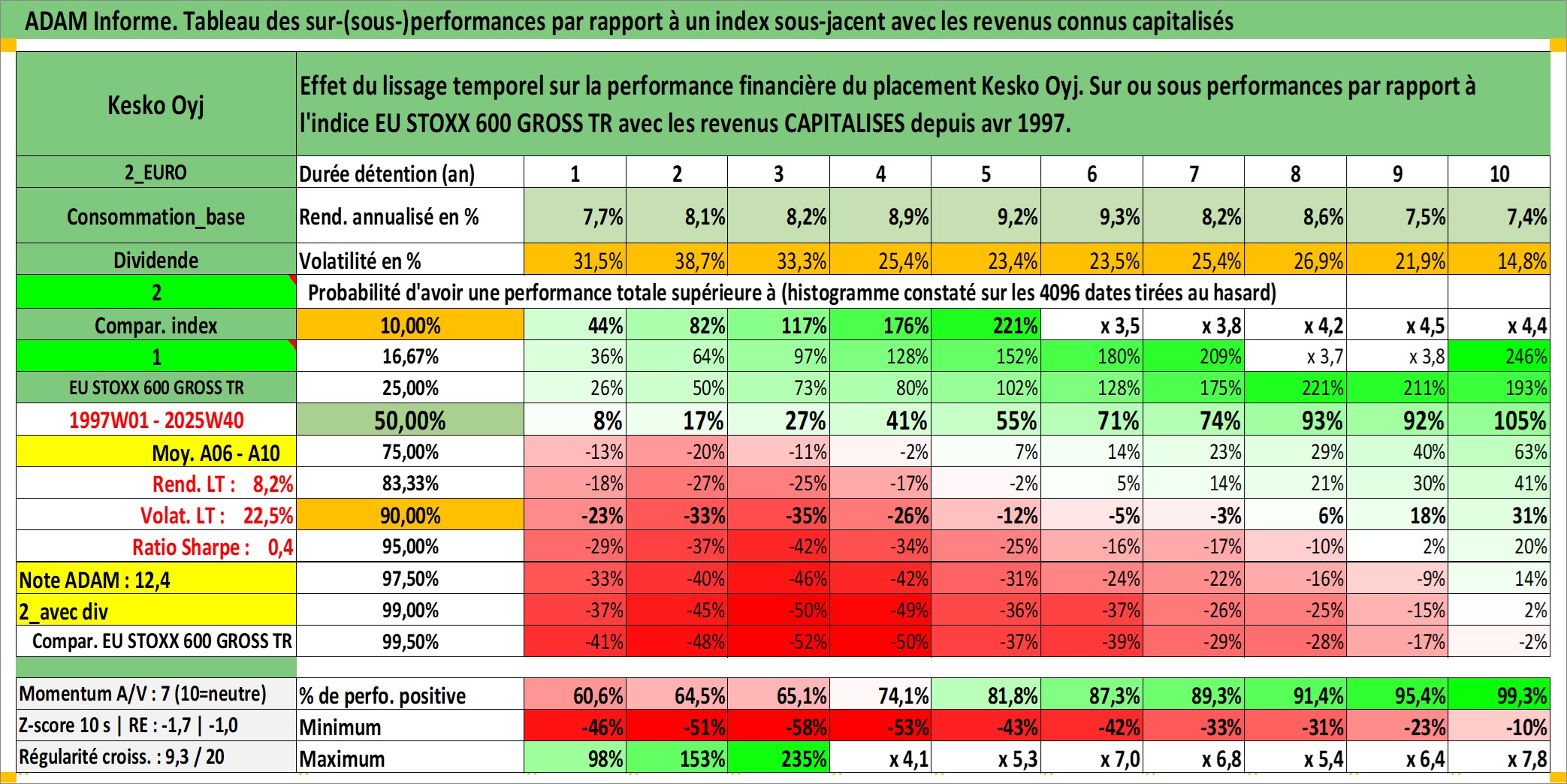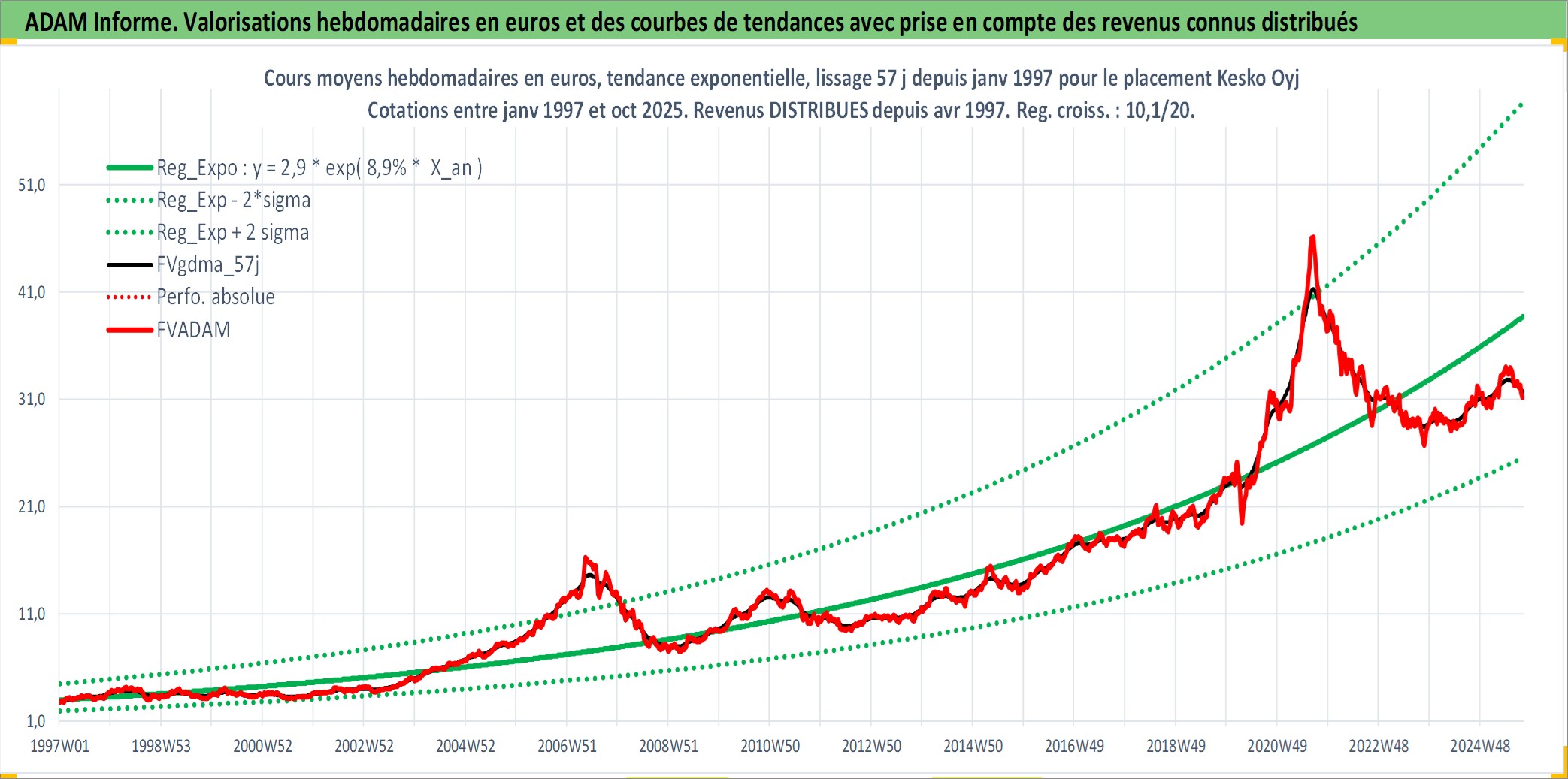 Site dédié aux investisseursPage dédiée sur site financeAnalyse des valorisations hebdomadaires de l'action Kesko Oyj. Cet actif est cote en EUR. Les valorisations couvrent les semaines 1997W01 a 2025W40. Les revenus de cet actif financier sont pris en compte depuis la semaine 1997W16. La note ESG de cet actif n'est pas connue.
