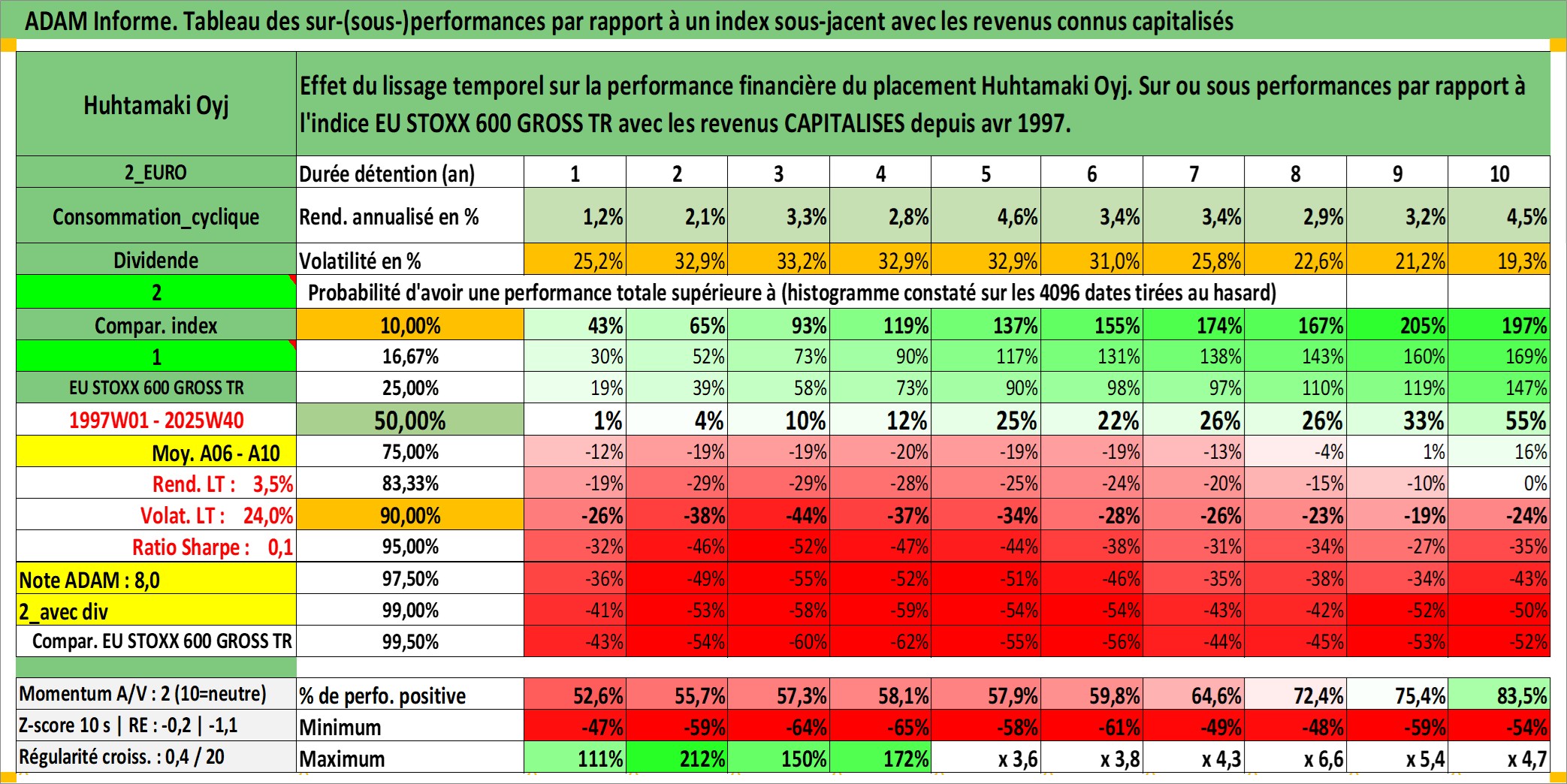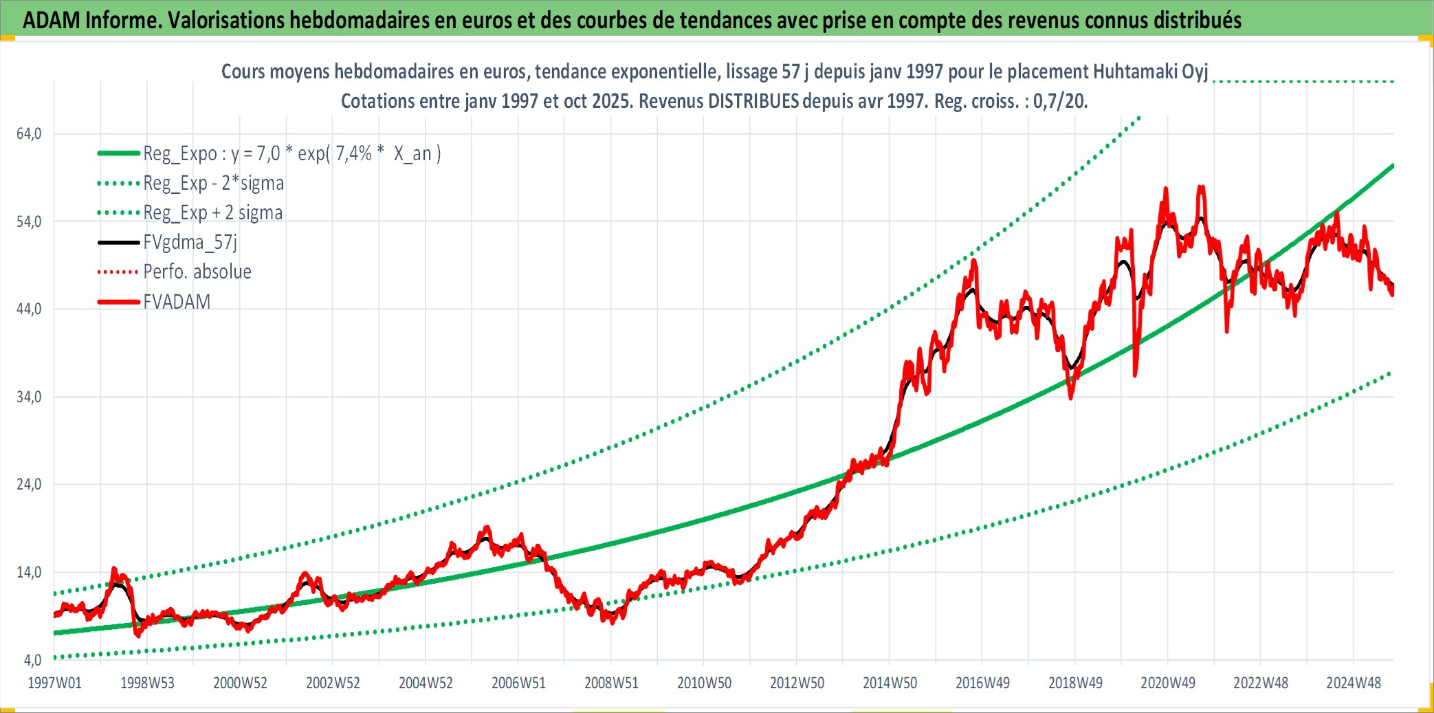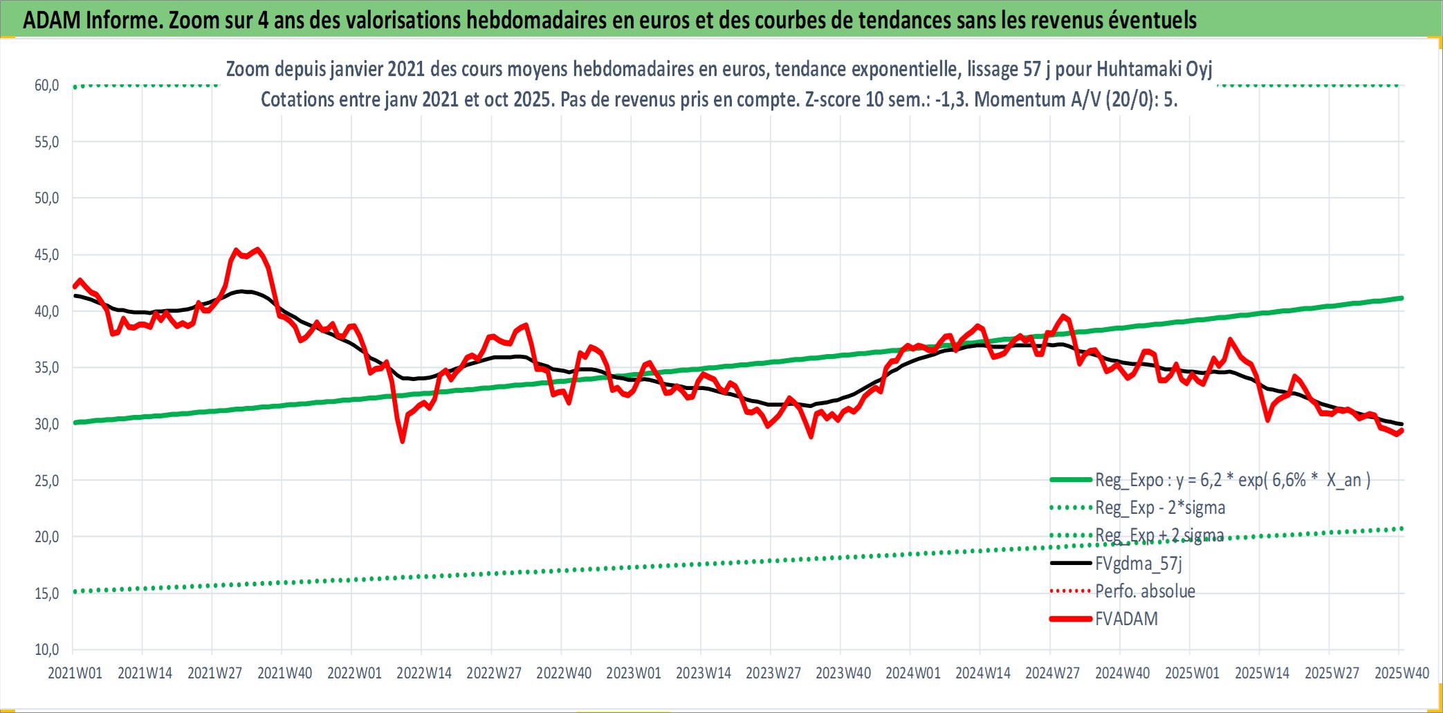Site dédié aux investisseursPage dédiée sur site financeAnalyse des valorisations hebdomadaires de l'action Huhtamaki Oyj. Cet actif est cote en EUR. Les valorisations couvrent les semaines 1997W01 a 2025W40. Les revenus de cet actif financier sont pris en compte depuis la semaine 1997W15. La note ESG de cet actif n'est pas connue.