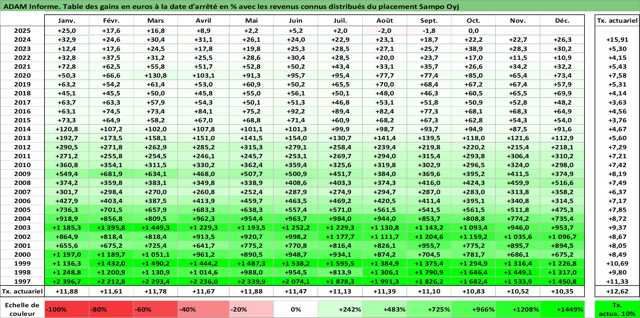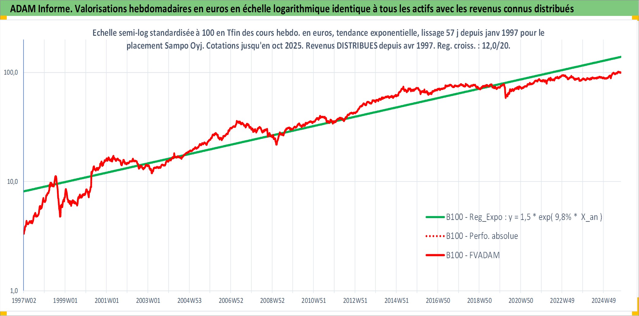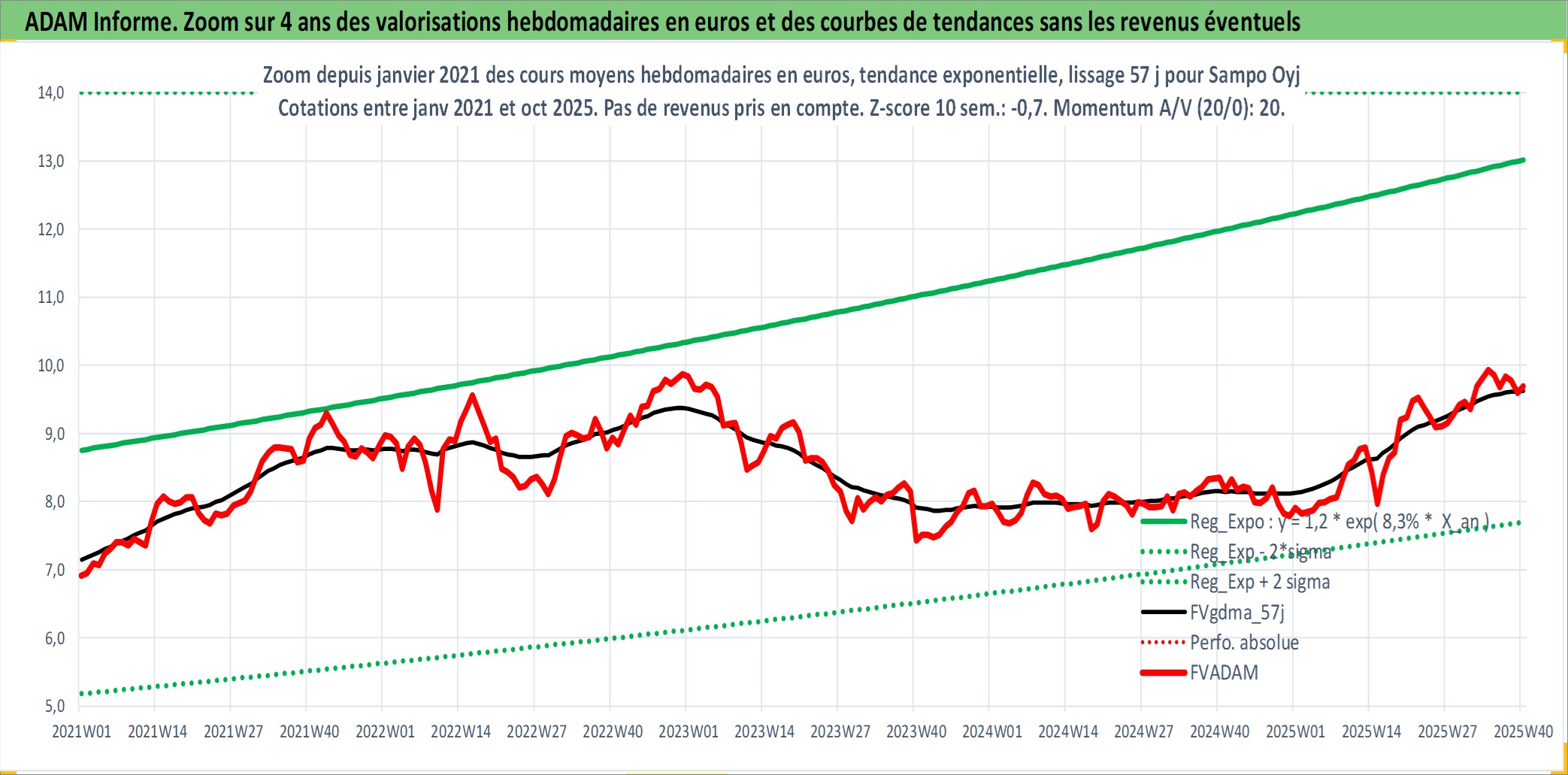 Site dédié aux investisseursPage dédiée sur site financeAnalyse des valorisations hebdomadaires de l'action Sampo Oyj. Cet actif est cote en EUR. Les valorisations couvrent les semaines 1997W01 a 2025W40. Les revenus de cet actif financier sont pris en compte depuis la semaine 1997W16. La note globale ESG de cet actif est estimee a 14.0 (apres rebasage entre 0 et 20).